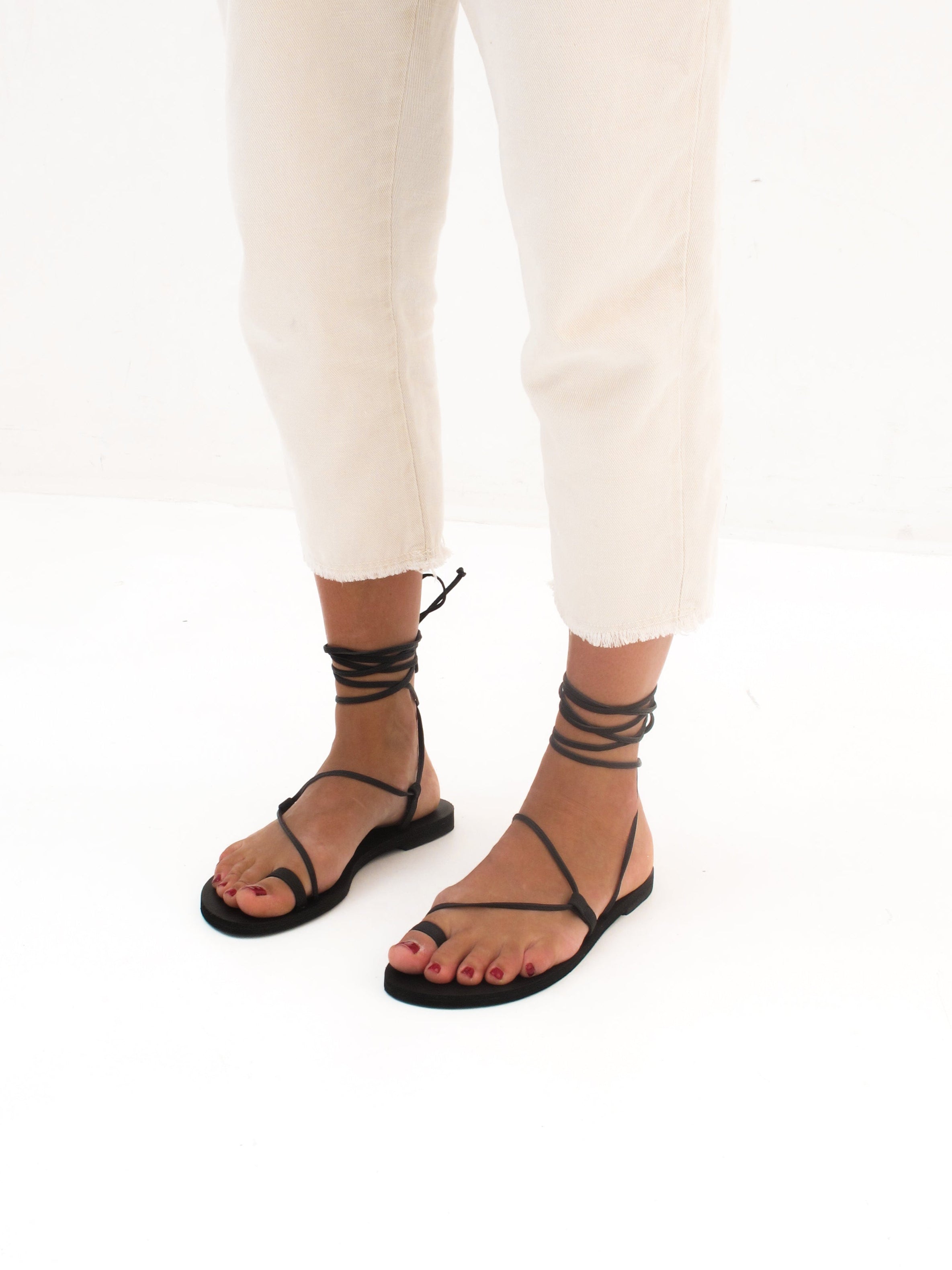 Sandale plate en daim vegan noir. Avec des bretelles en haut et nouées à la cheville.