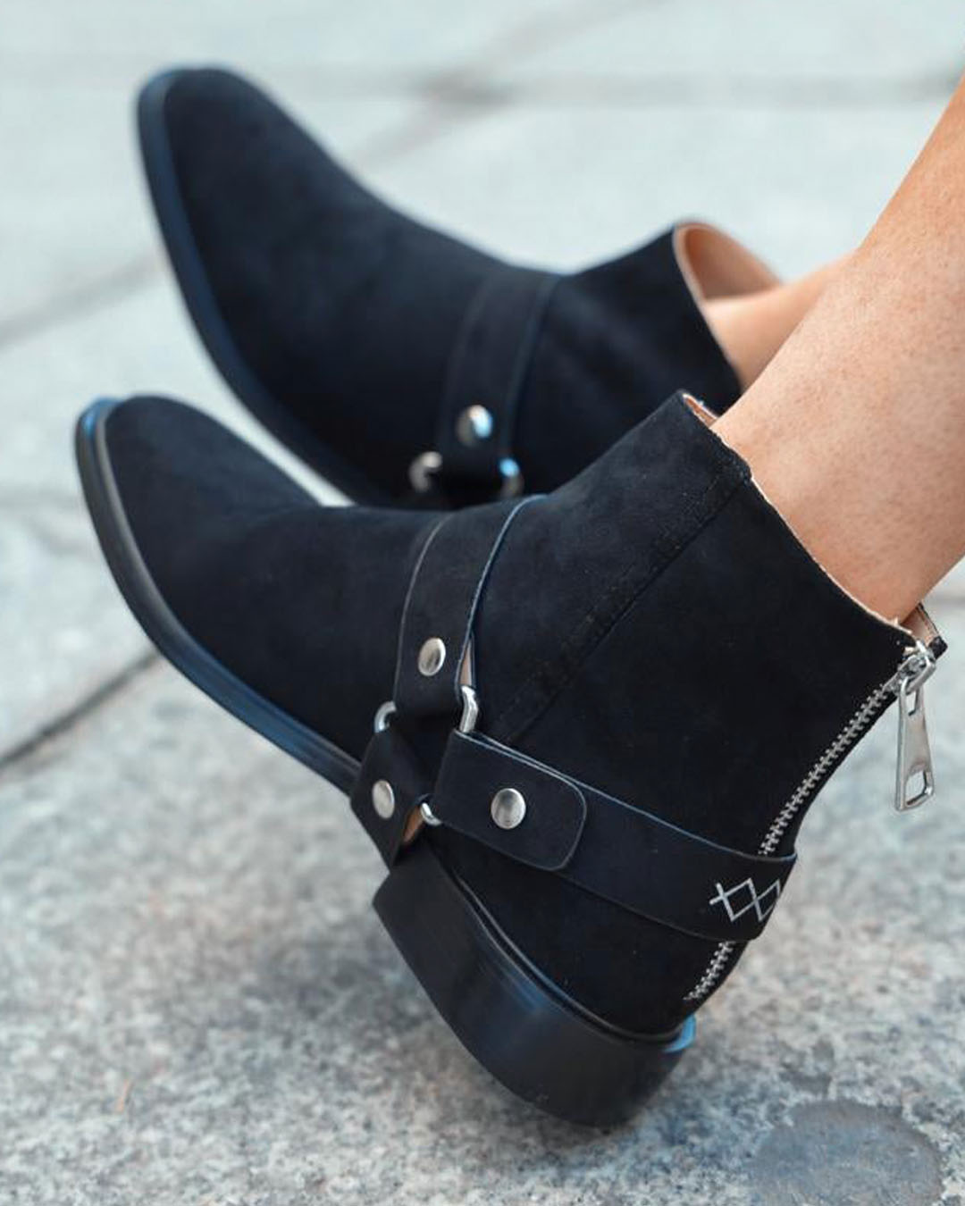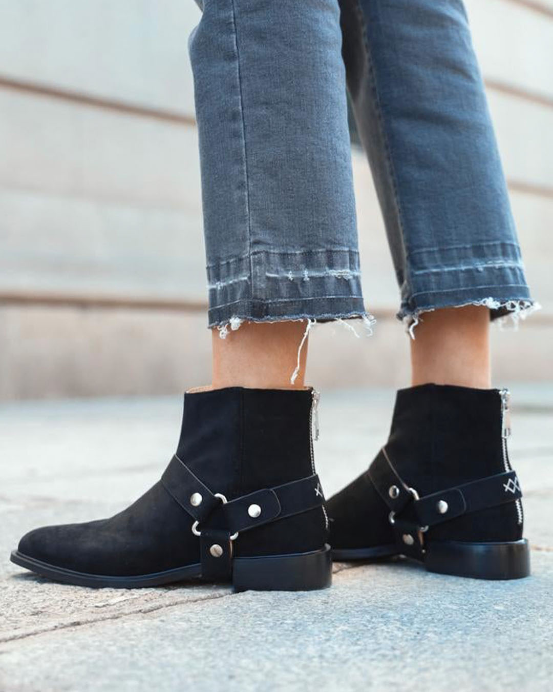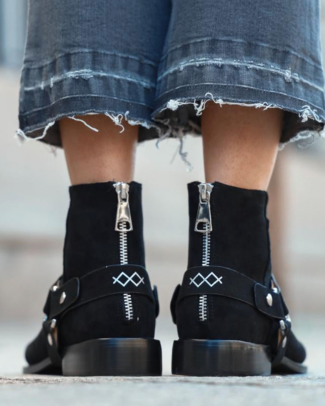 Bottine basse en daim vegan noir. Trois brides, deux autour de la cheville et une qui passe sous la semelle, réunies sur les côtés en un triangle métallique avec des détails argentés. Fermeture à glissière au dos pour la fermeture.