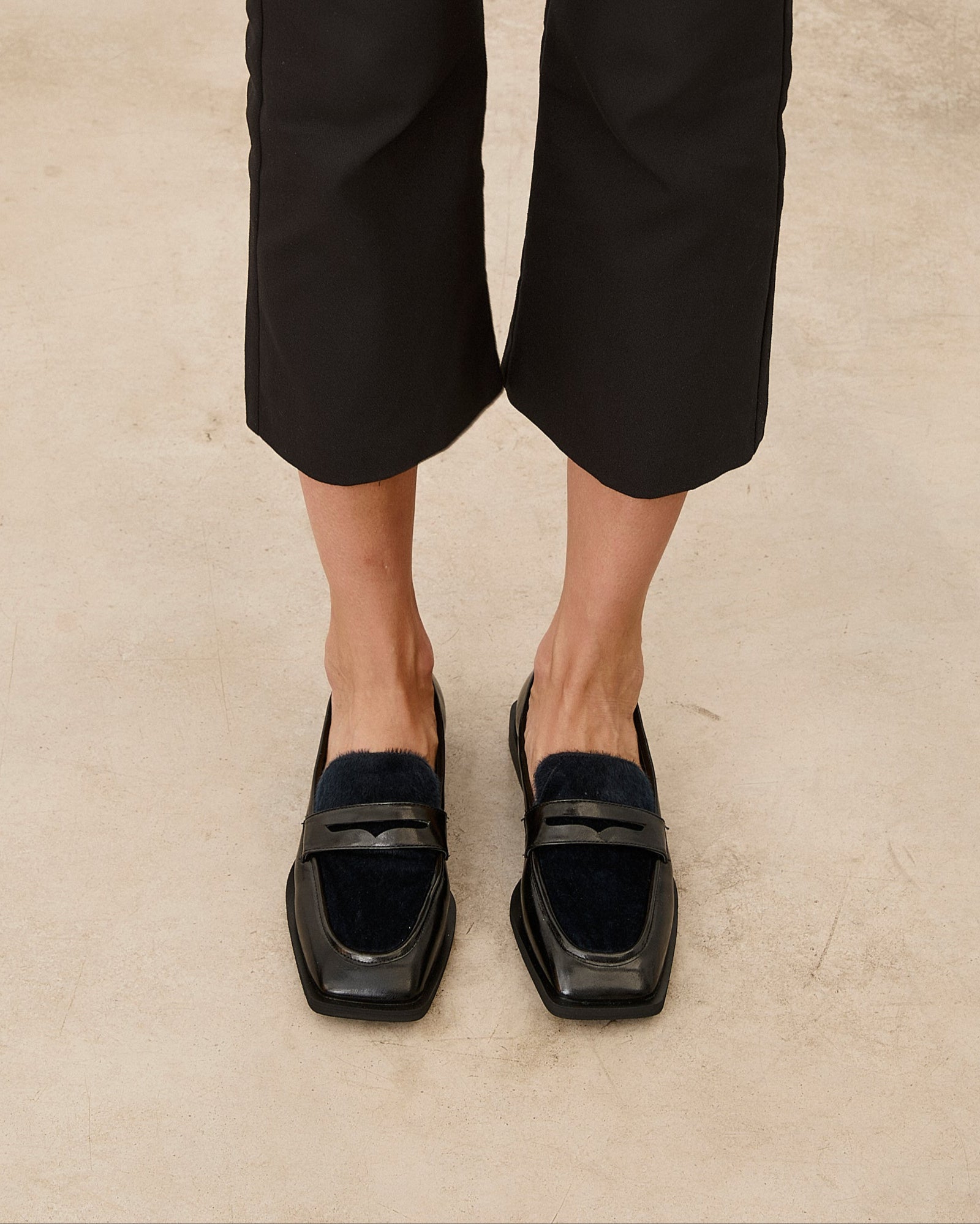 Zapato cerrado estilo mocasín en color negro. Lengüeta en pelo azul marino.