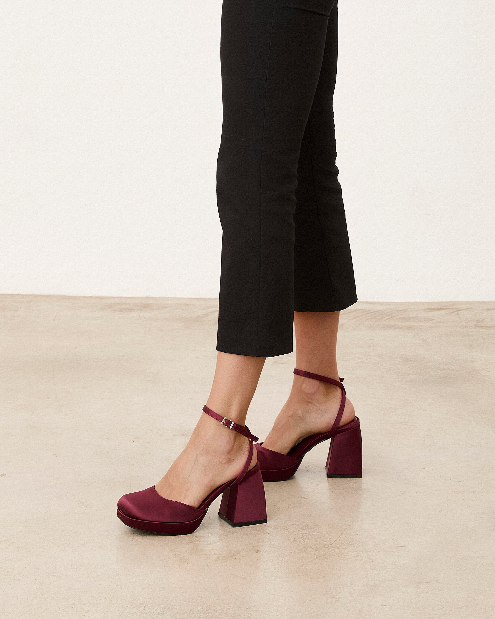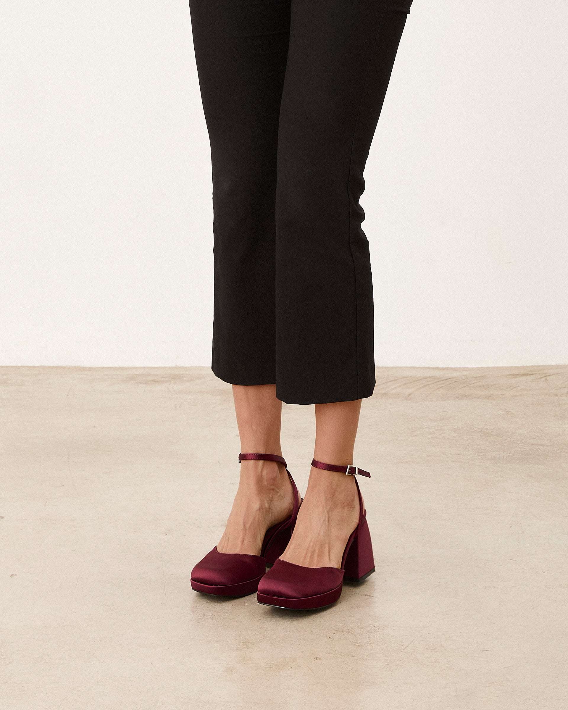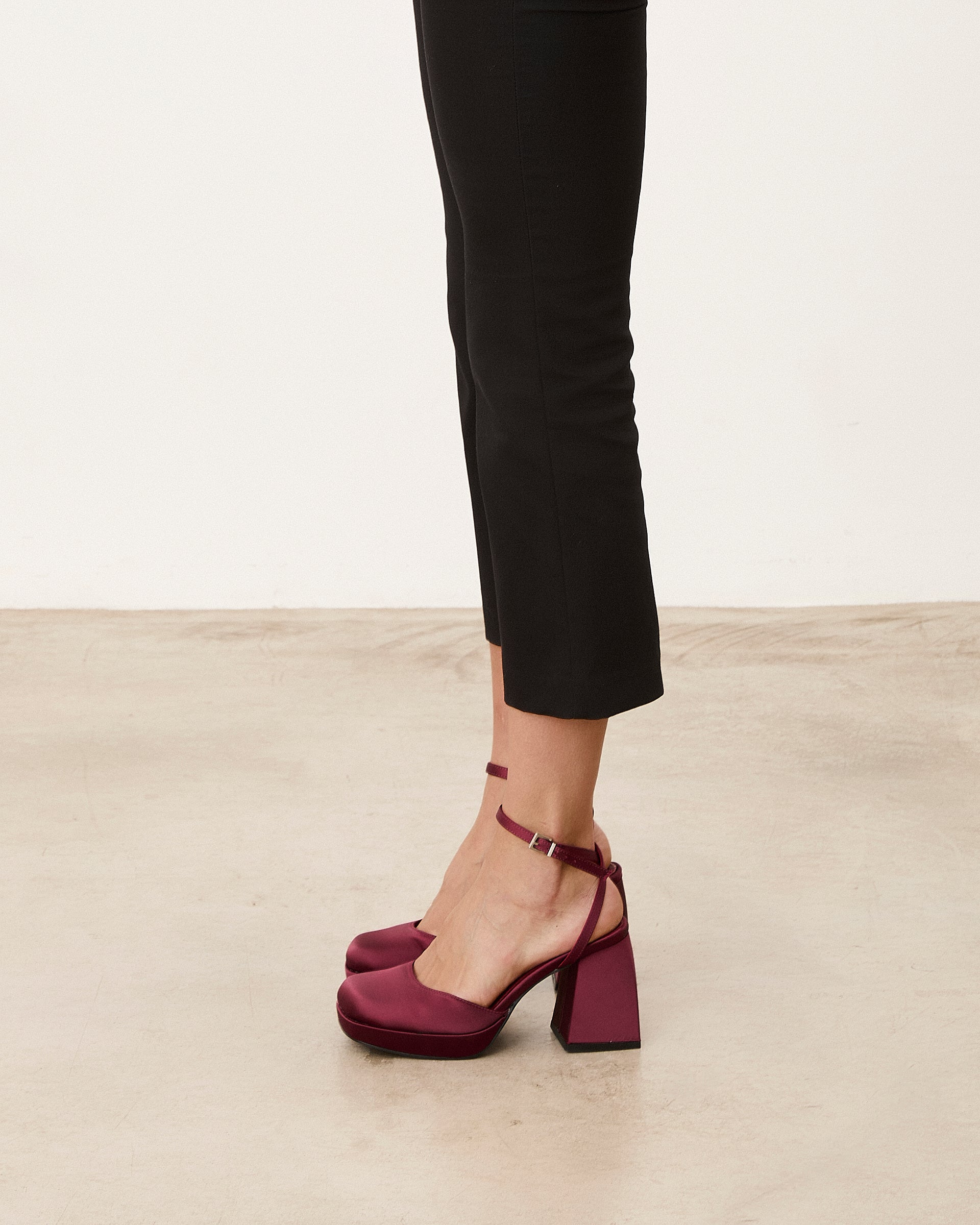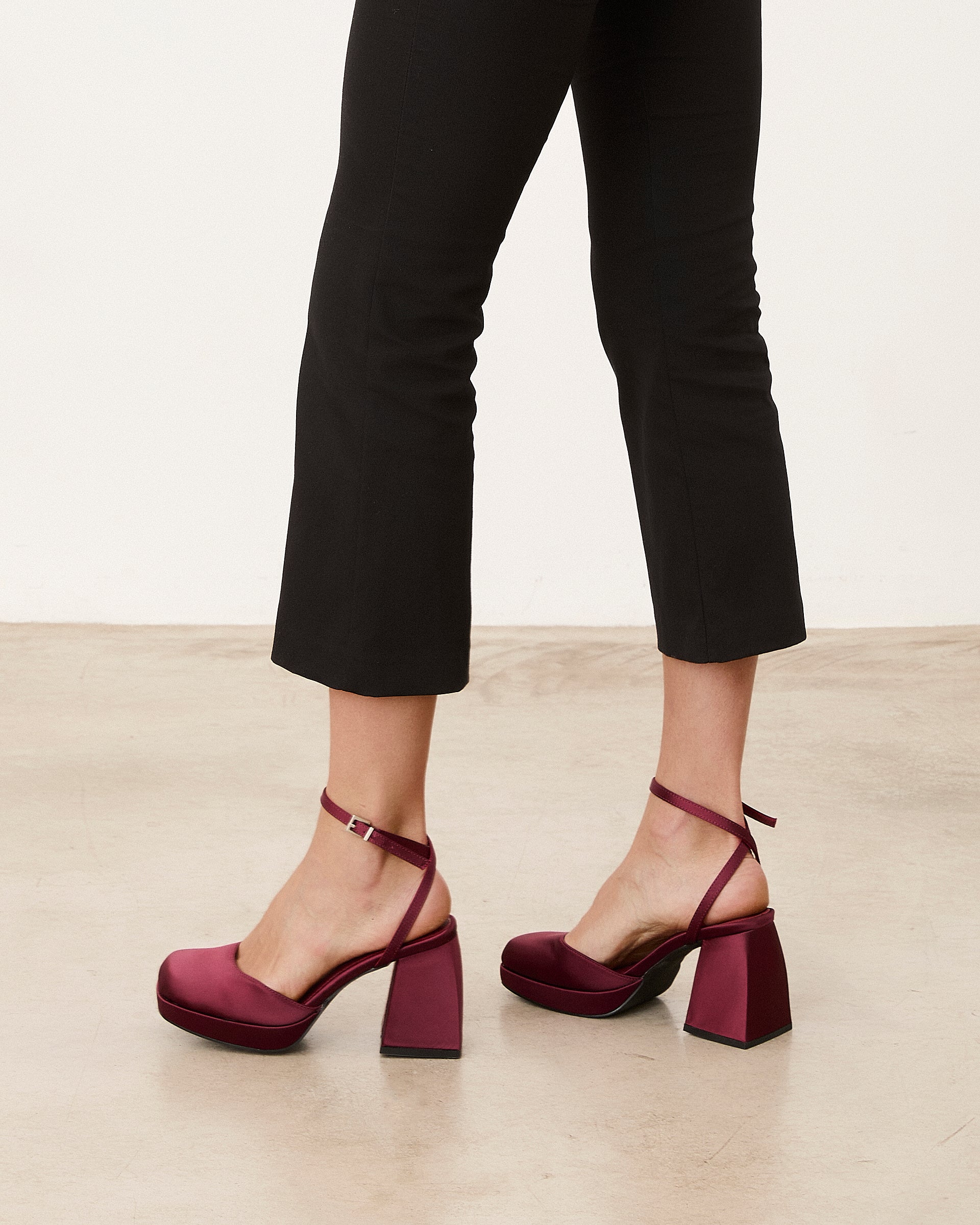 Chaussure à talon fermé en satin bordeaux. Deux sangles pour le maintien de la cheville.