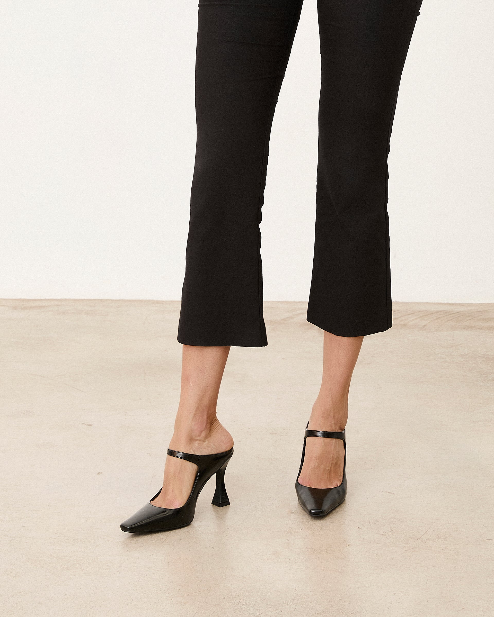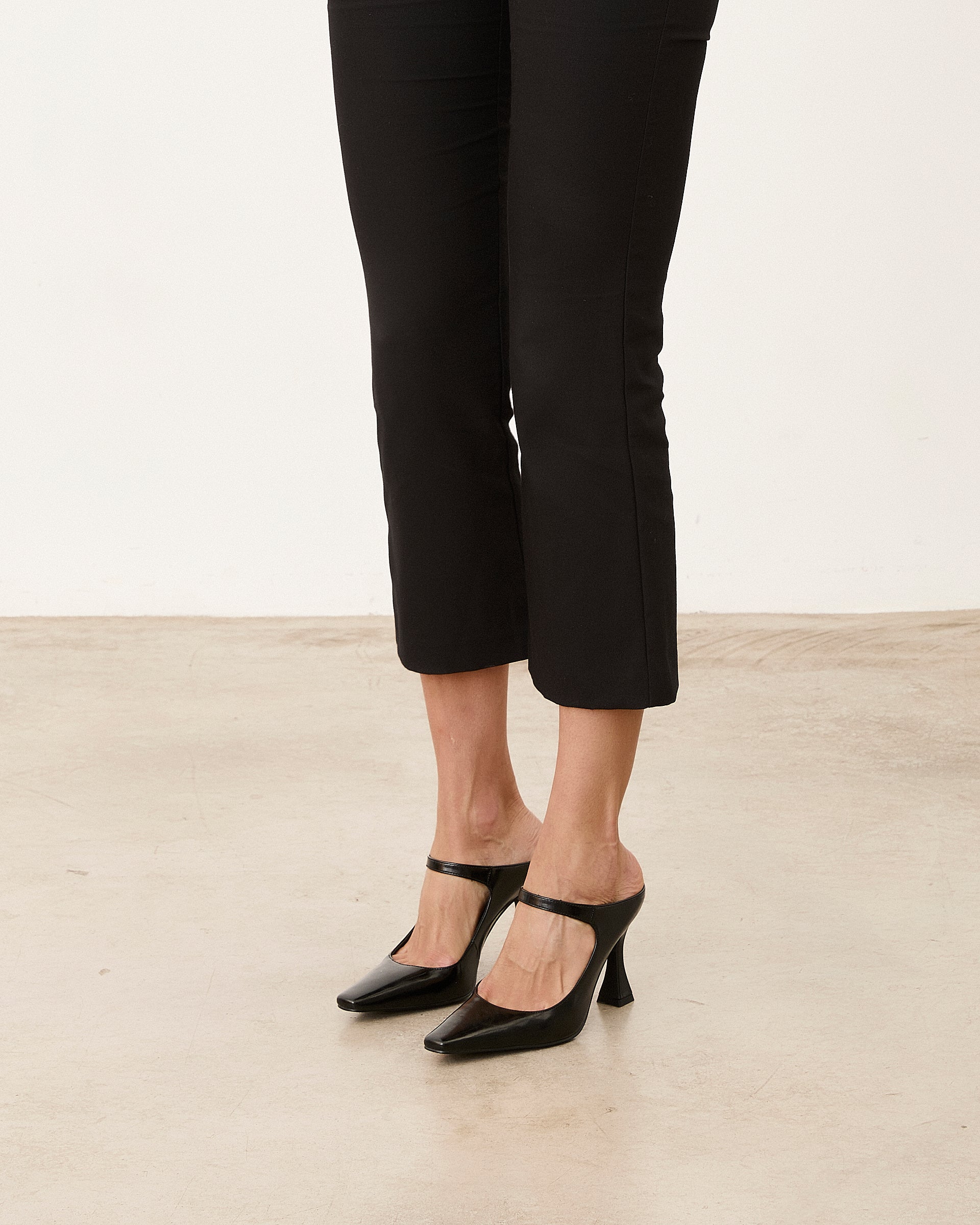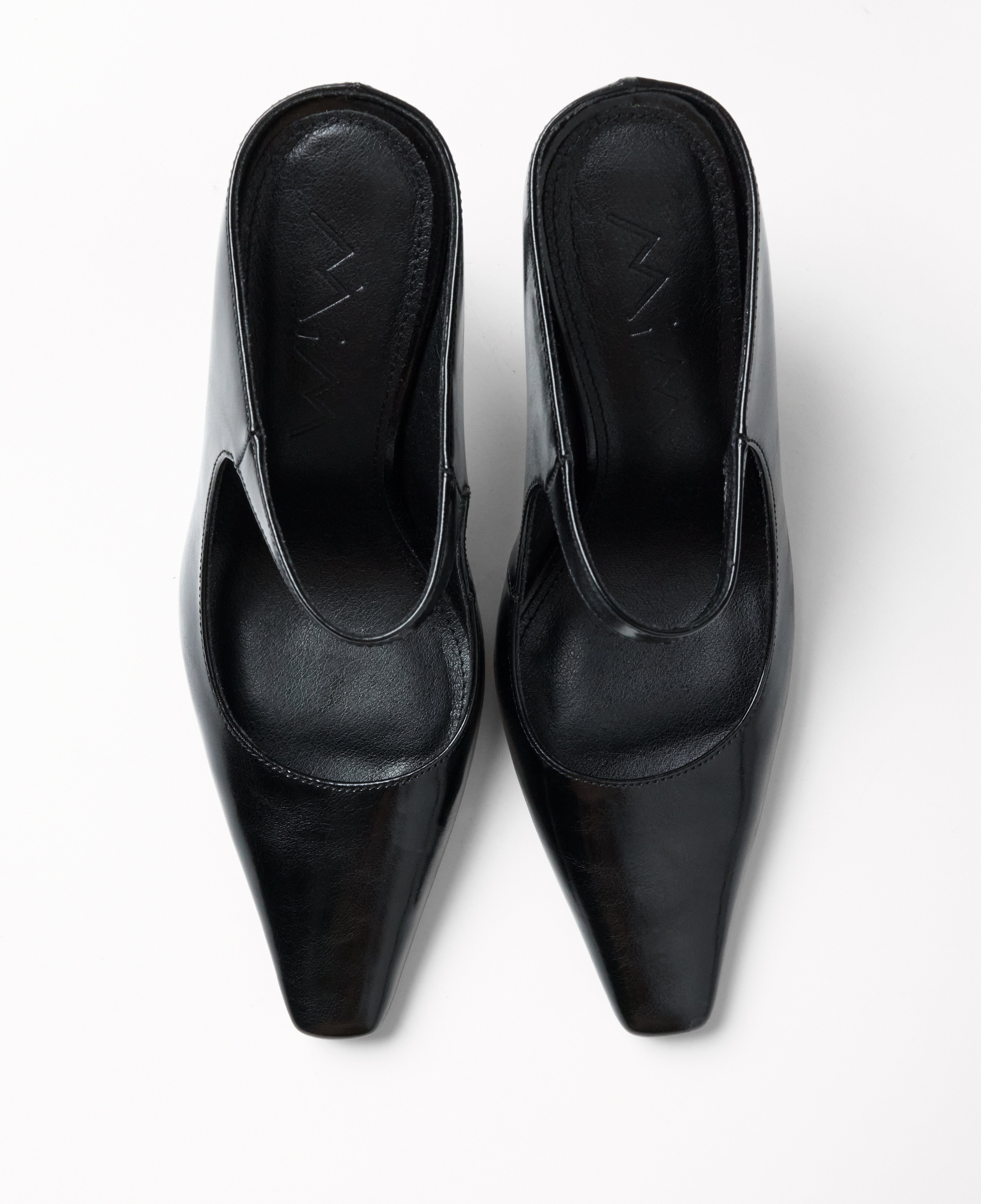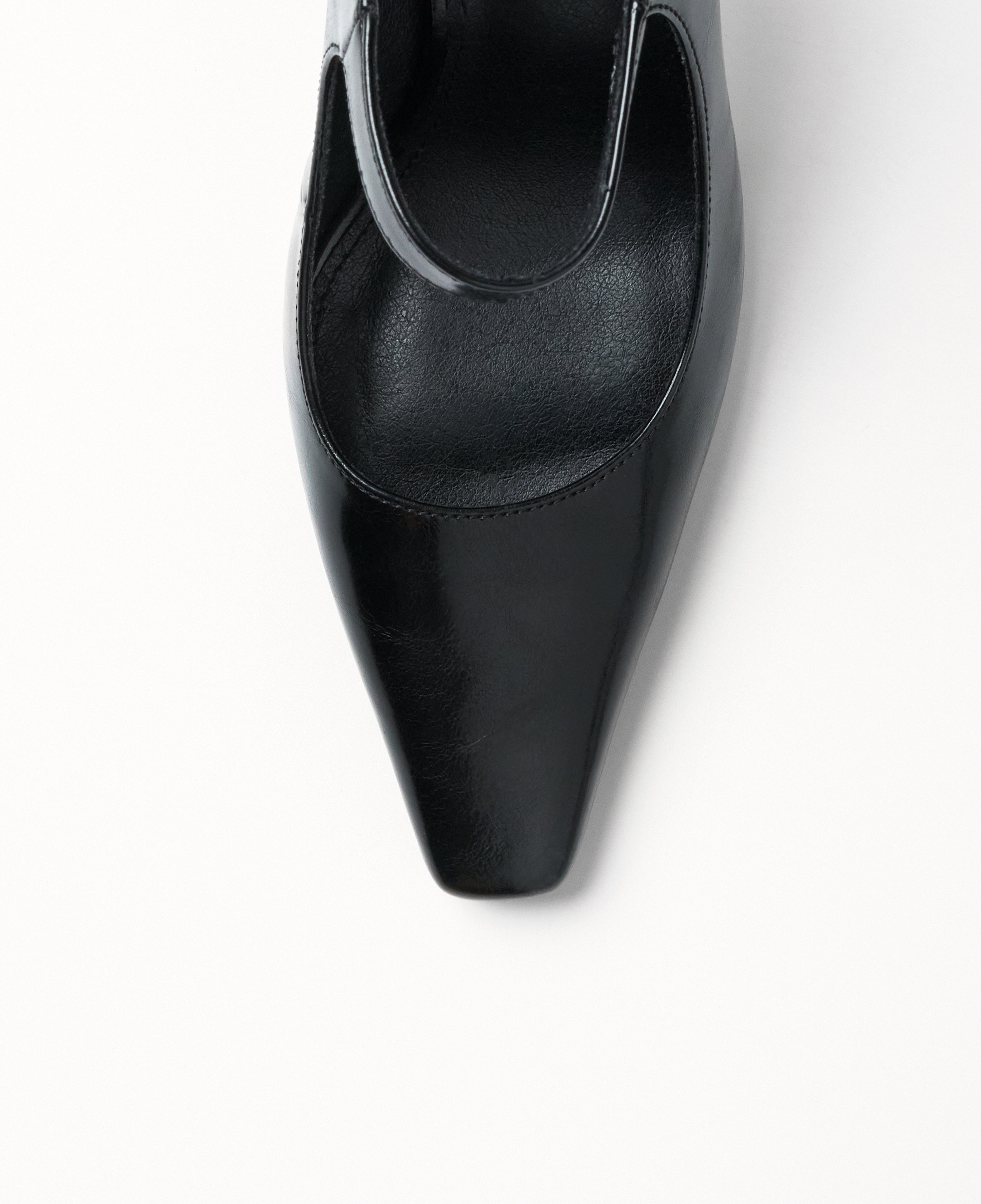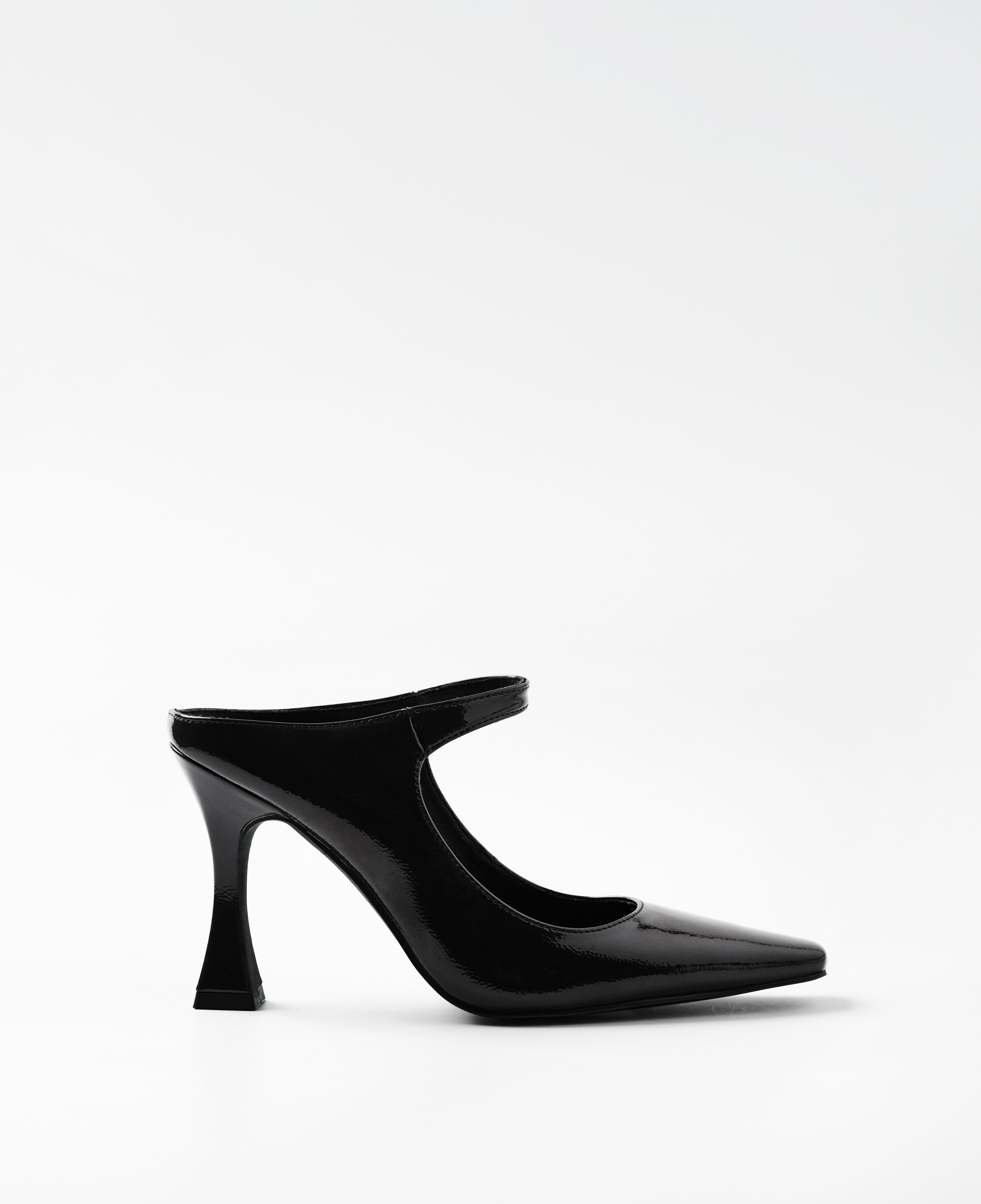Zapato de tacón cerrado con parte delantera en punta color negro efecto charol. Parte trasera destalonada con tira en el empeine para la sujeción.