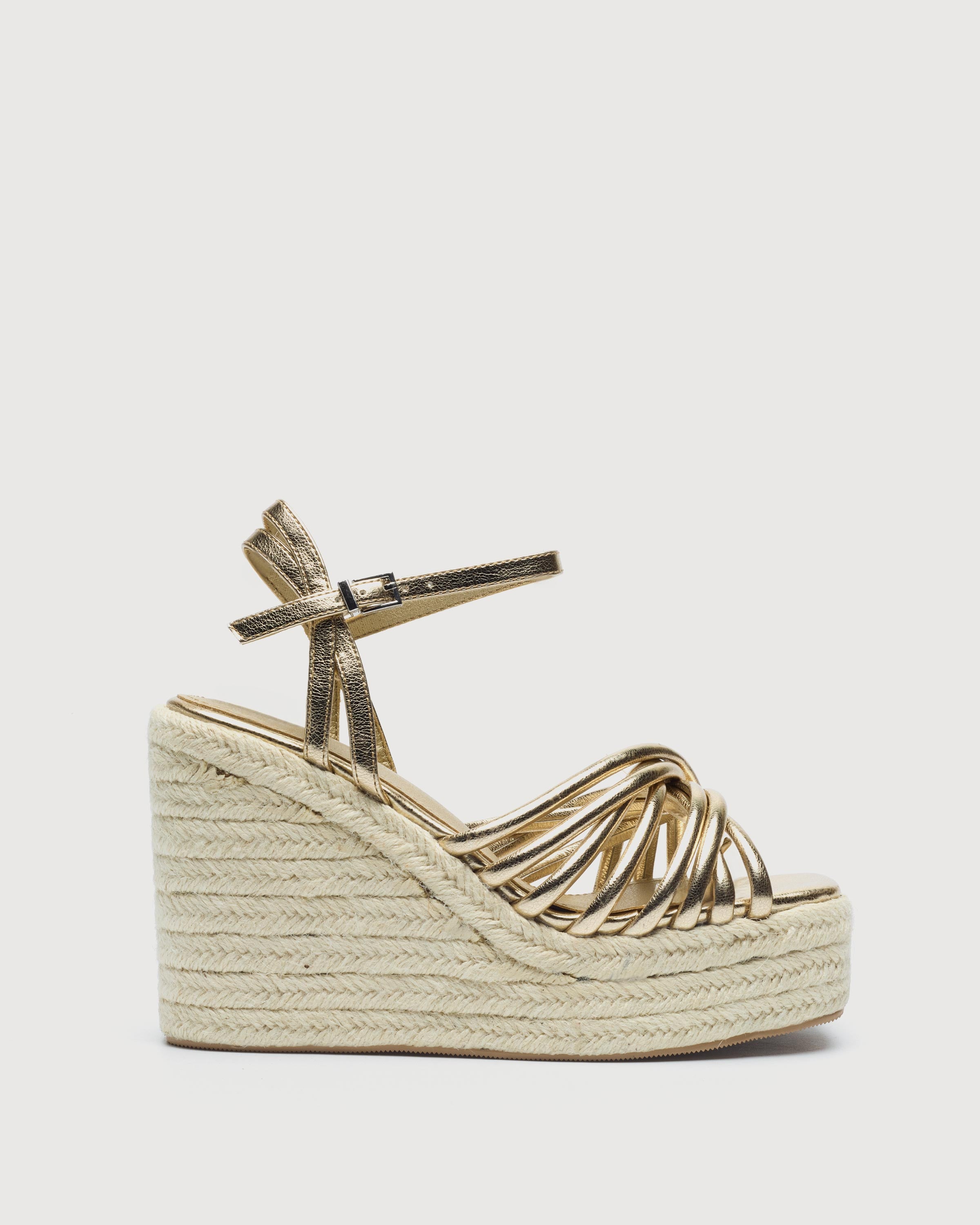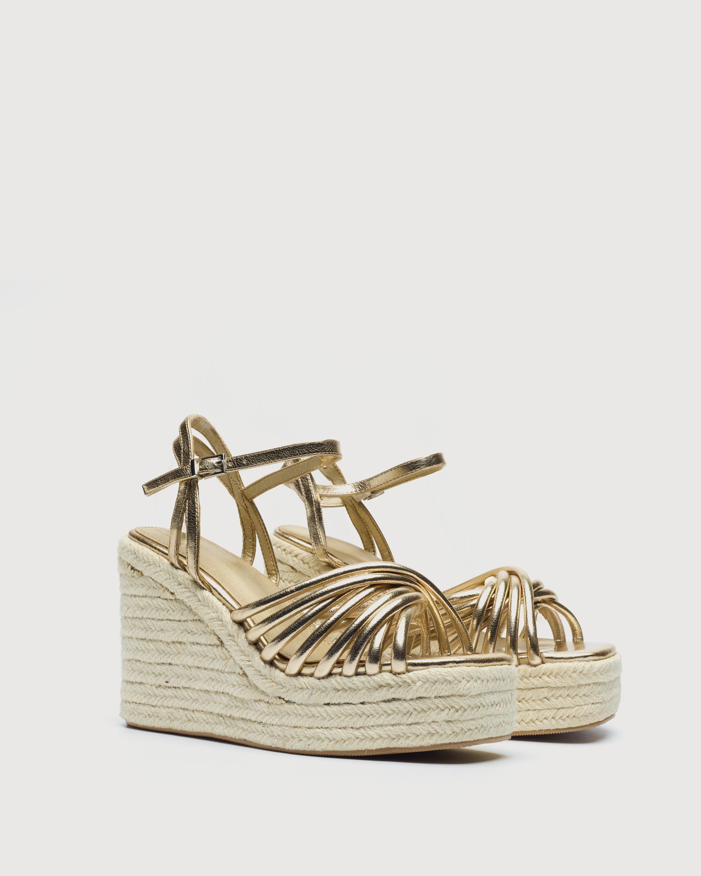 Sandalia de plataforma de esparto con tacón en color dorado brillante. Parte delantera con tiras y cierre al tobillo con hebilla metálica.