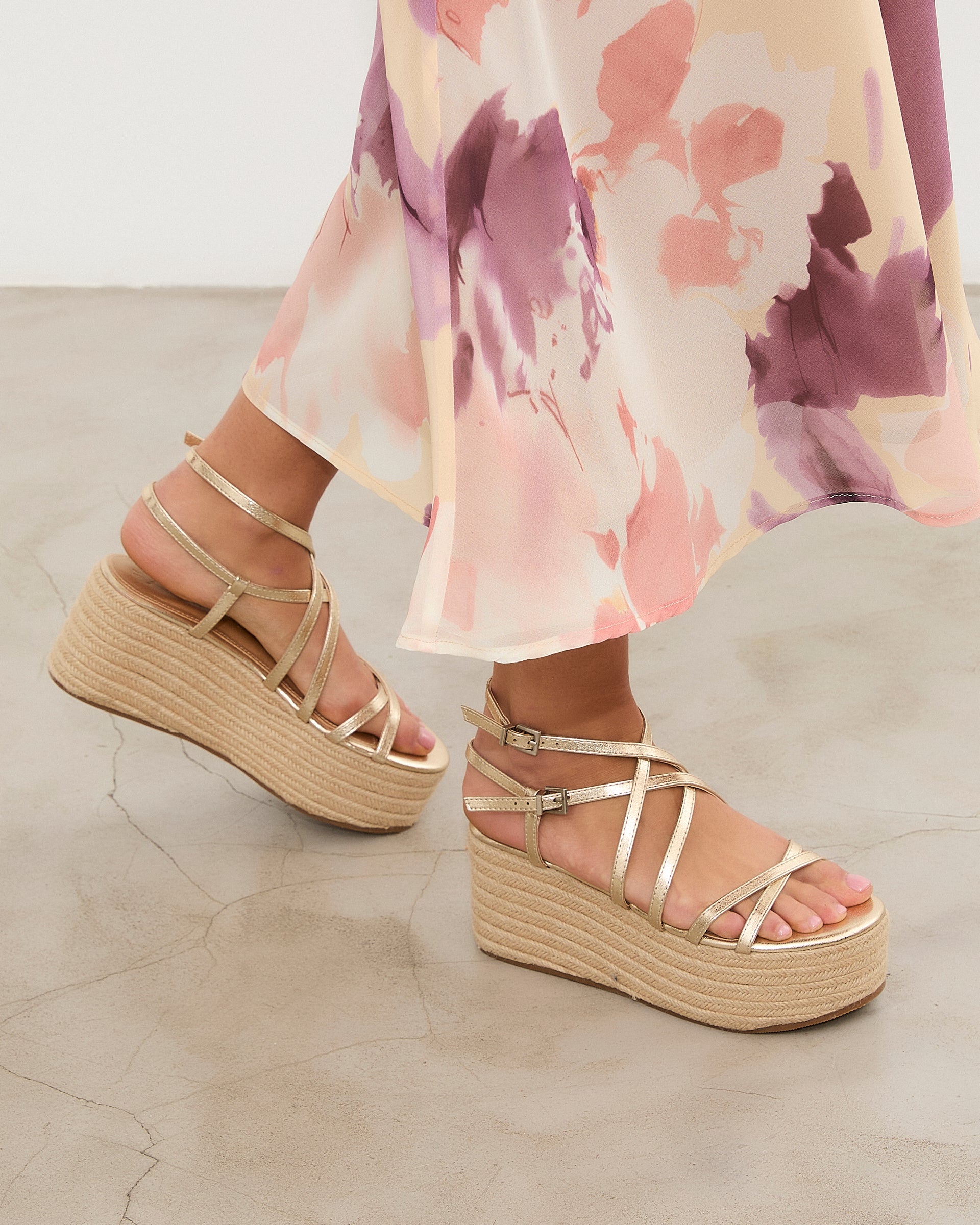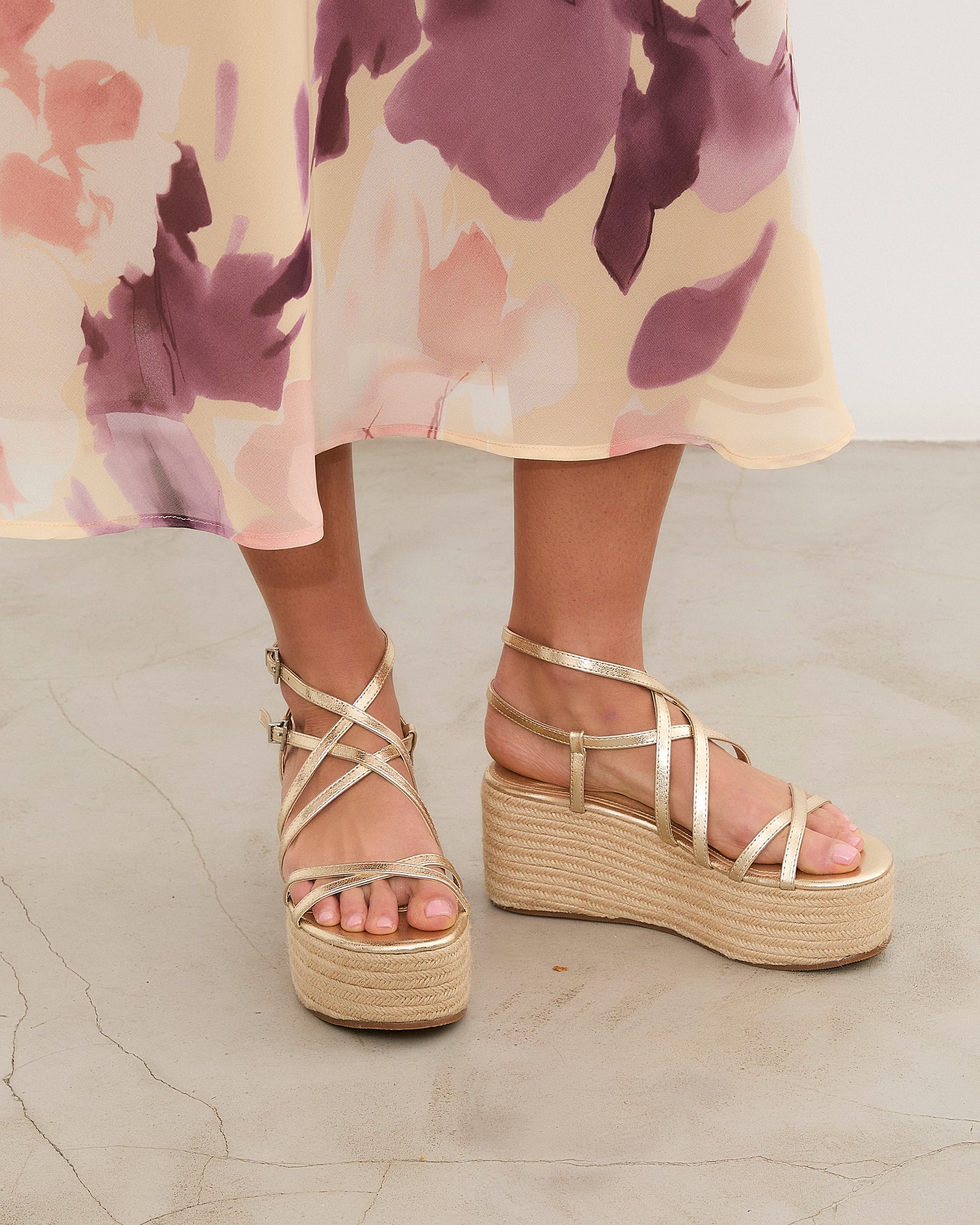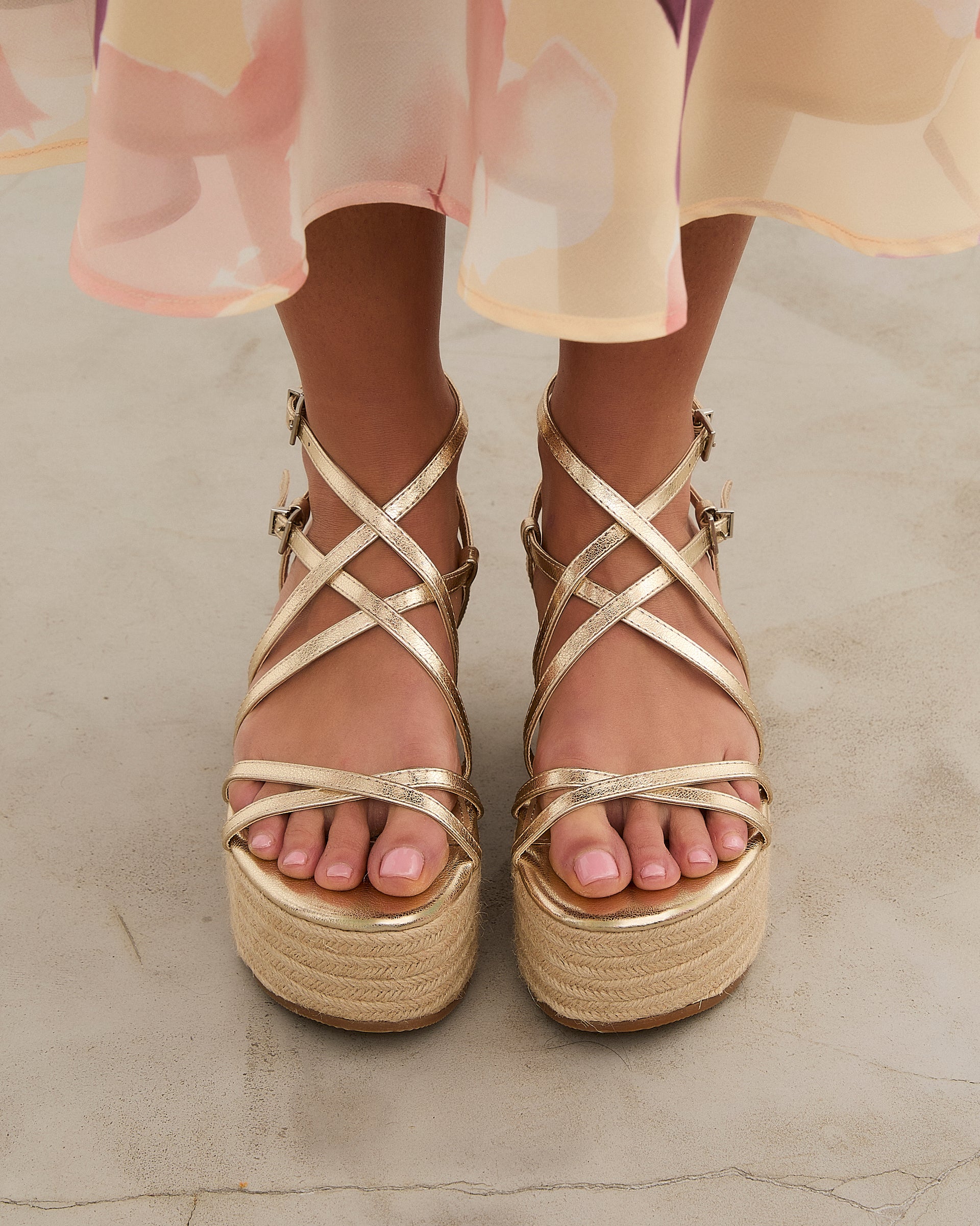 Sandale plate-forme espadrille en cuir vegan doré avec des lanières à différents niveaux et une double boucle à nouer autour de la cheville.