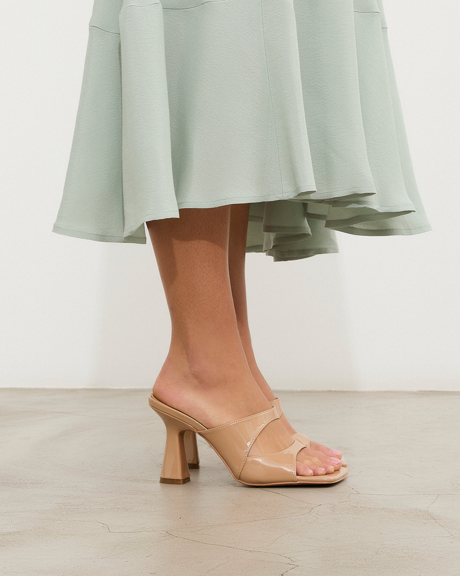 Sandalia de tacón tipo mule en color nude con puntera cuadrada. Dos tira delanteras superpuestas en el lateral. Tacón tipo aguja de base ancha.
