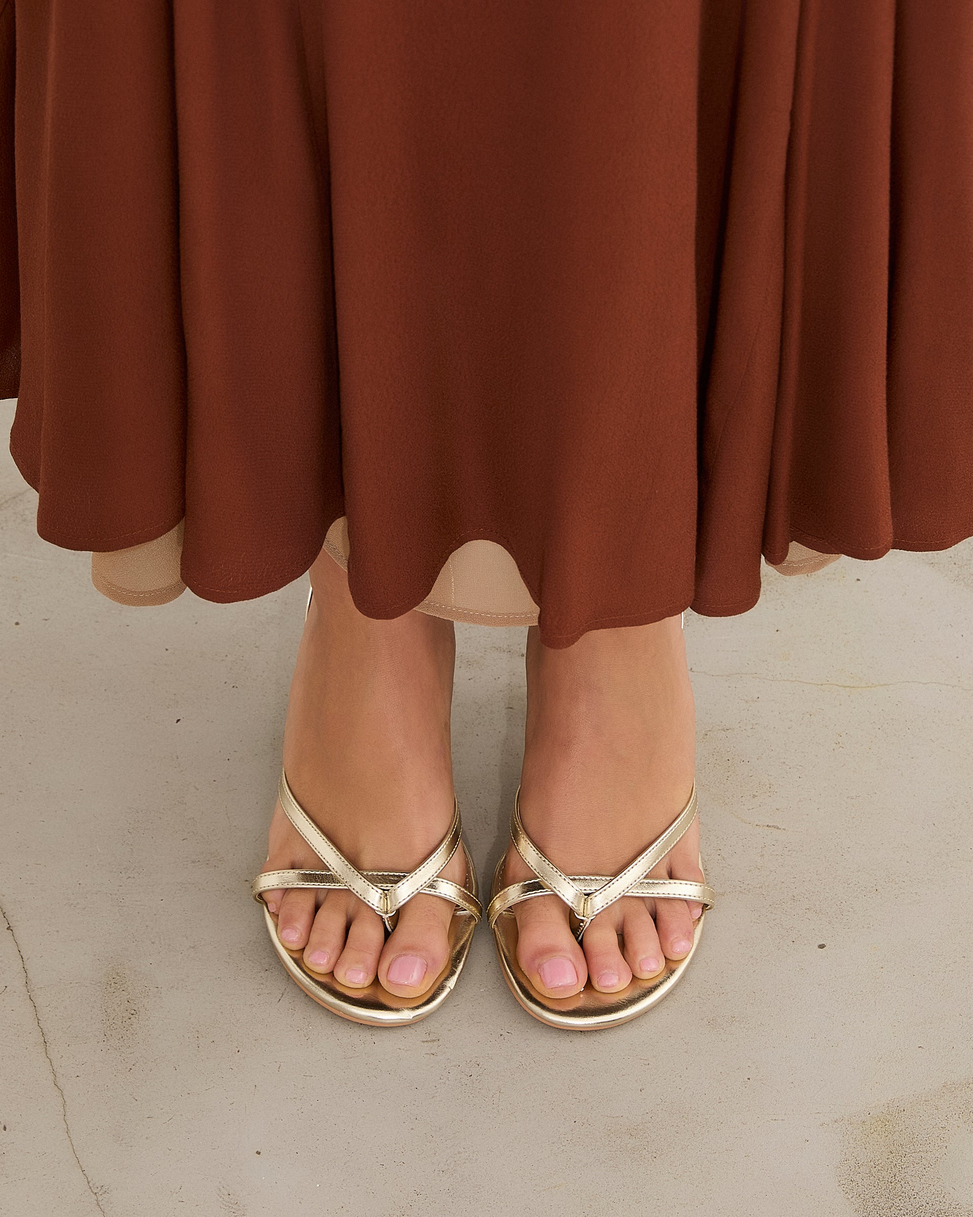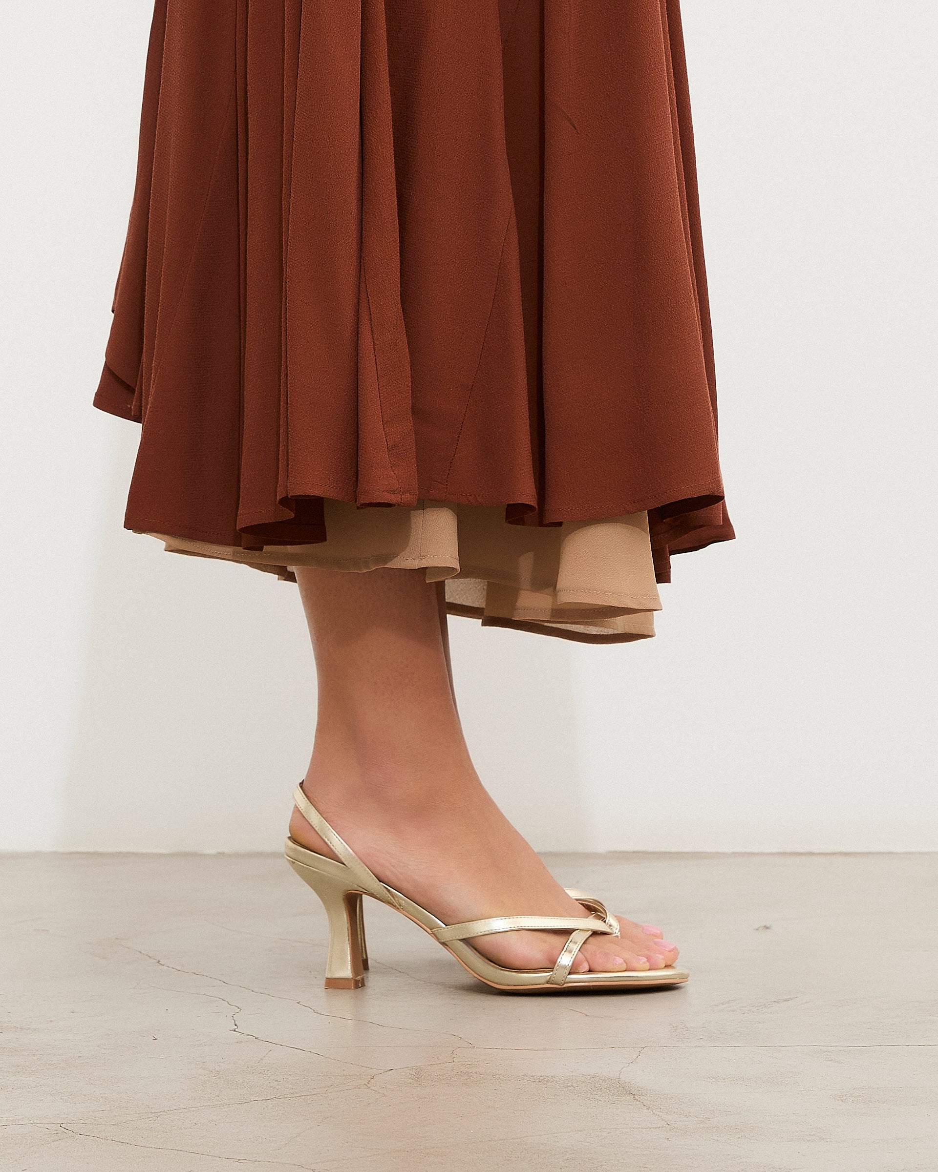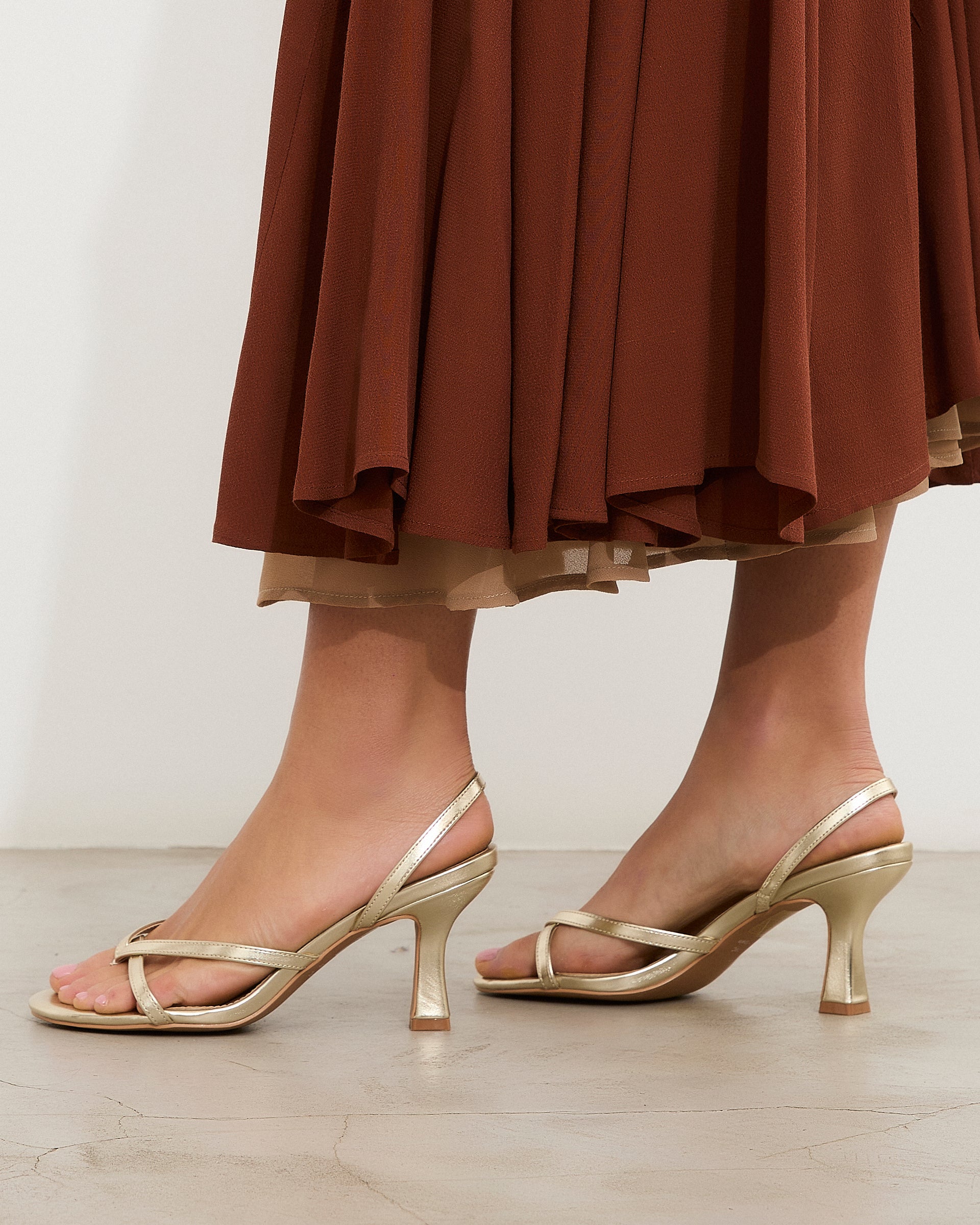 Sandalia de tacón con puntera redondeada en color dorado. Tiras finas cruzadas en la parte delantera. Tira trasera con elástico para ajuste en talón. Tacón tipo aguja de base ancha.