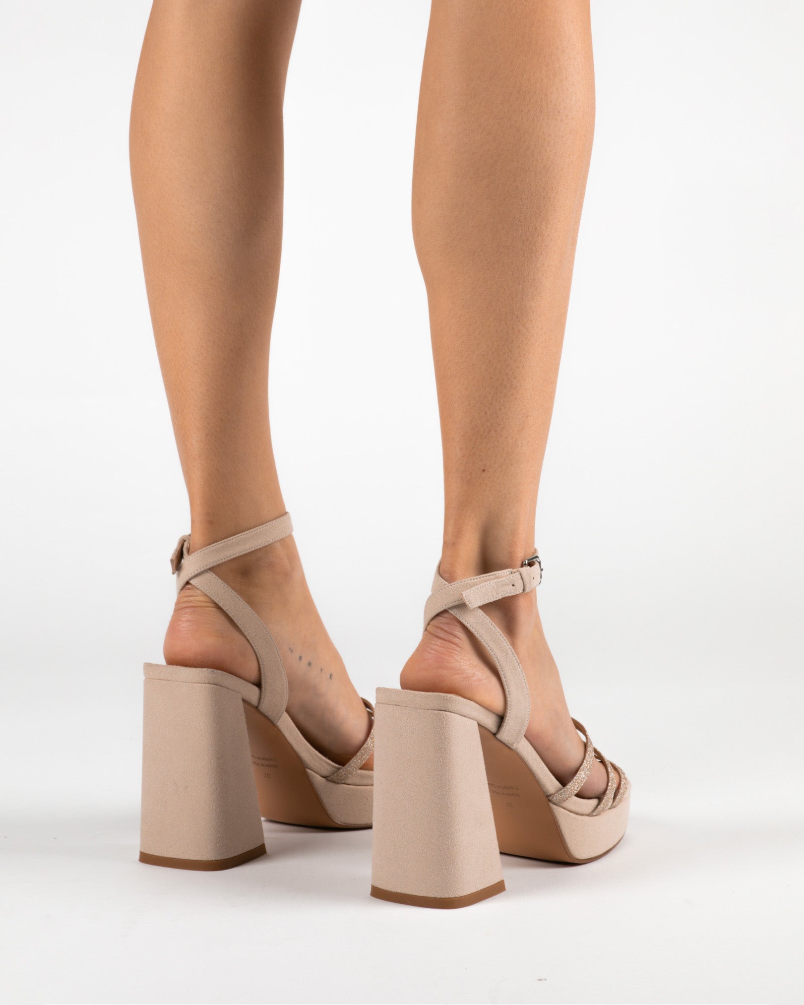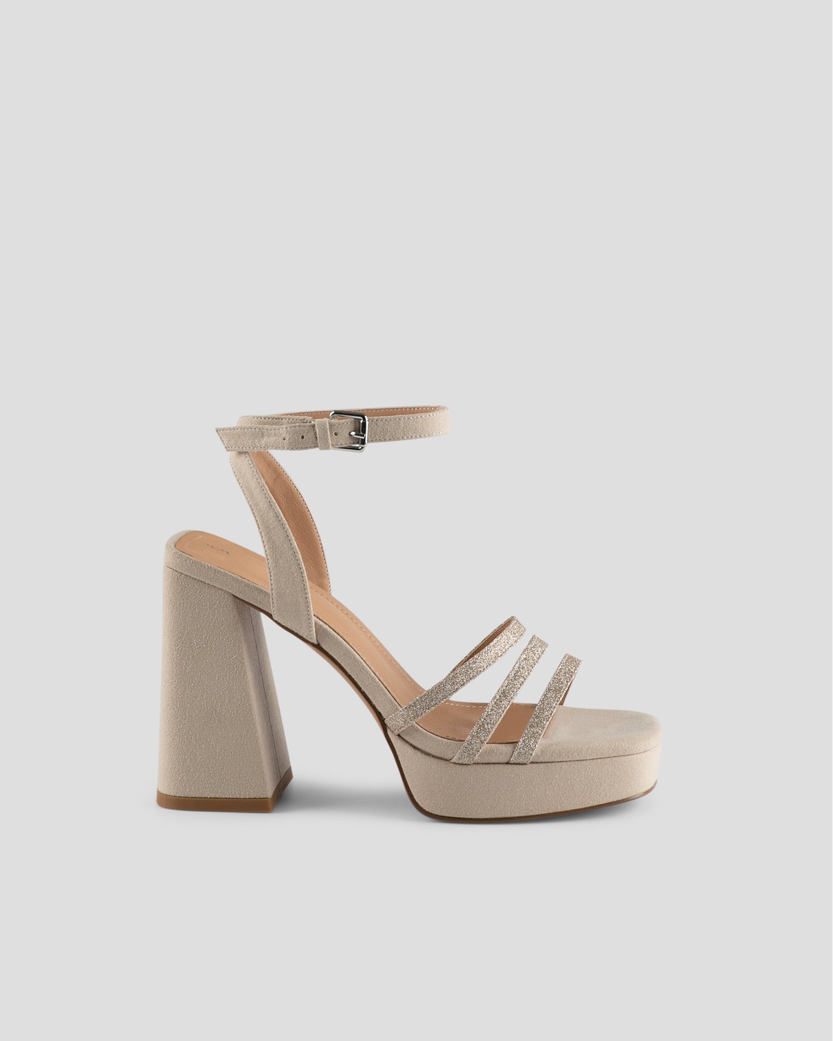Sandalia de tacón en piel vegano en color ecru. Parte superior delantera formado por tres tiras con glitter. Tira trasera con hebilla para anudar en el tobillo.