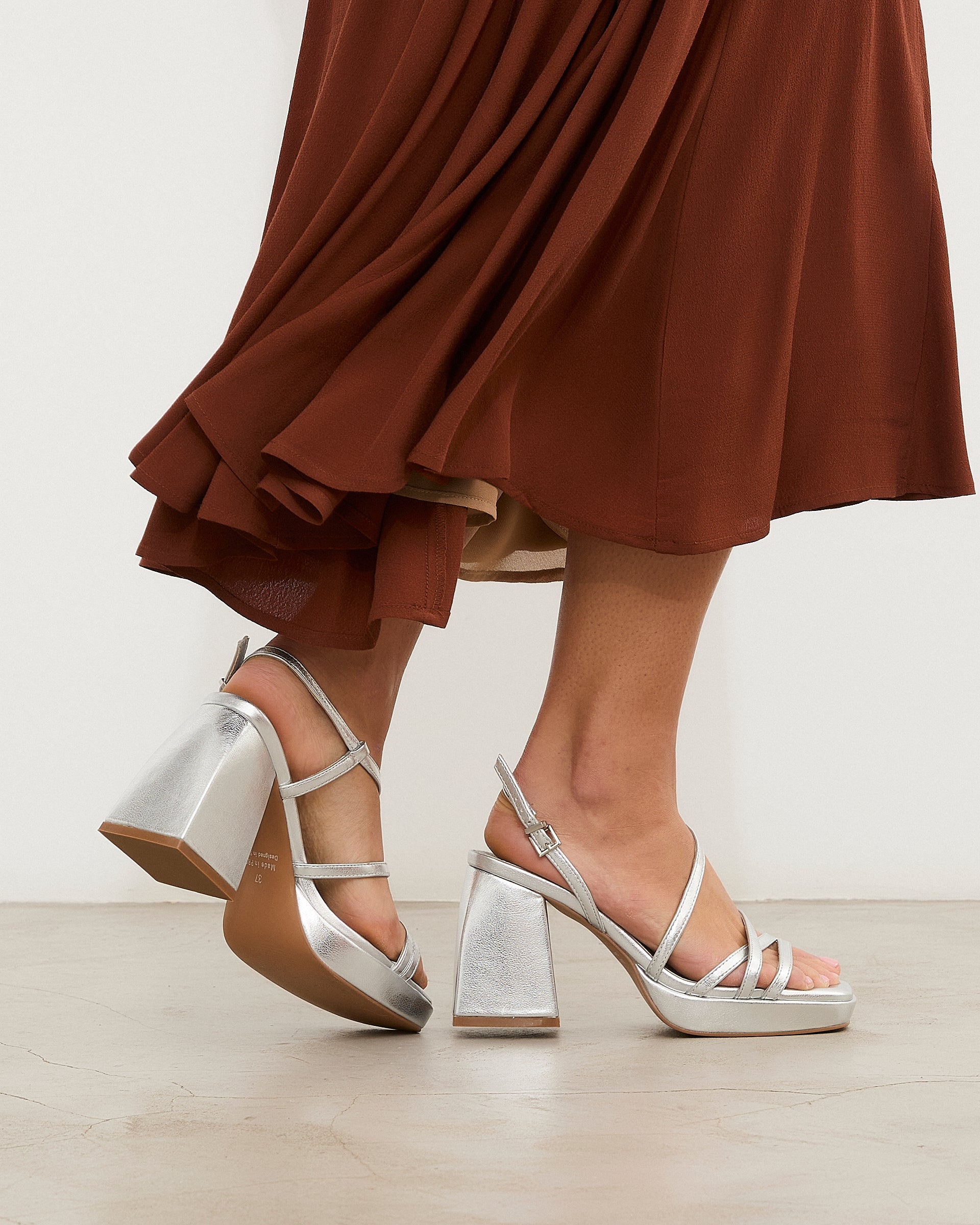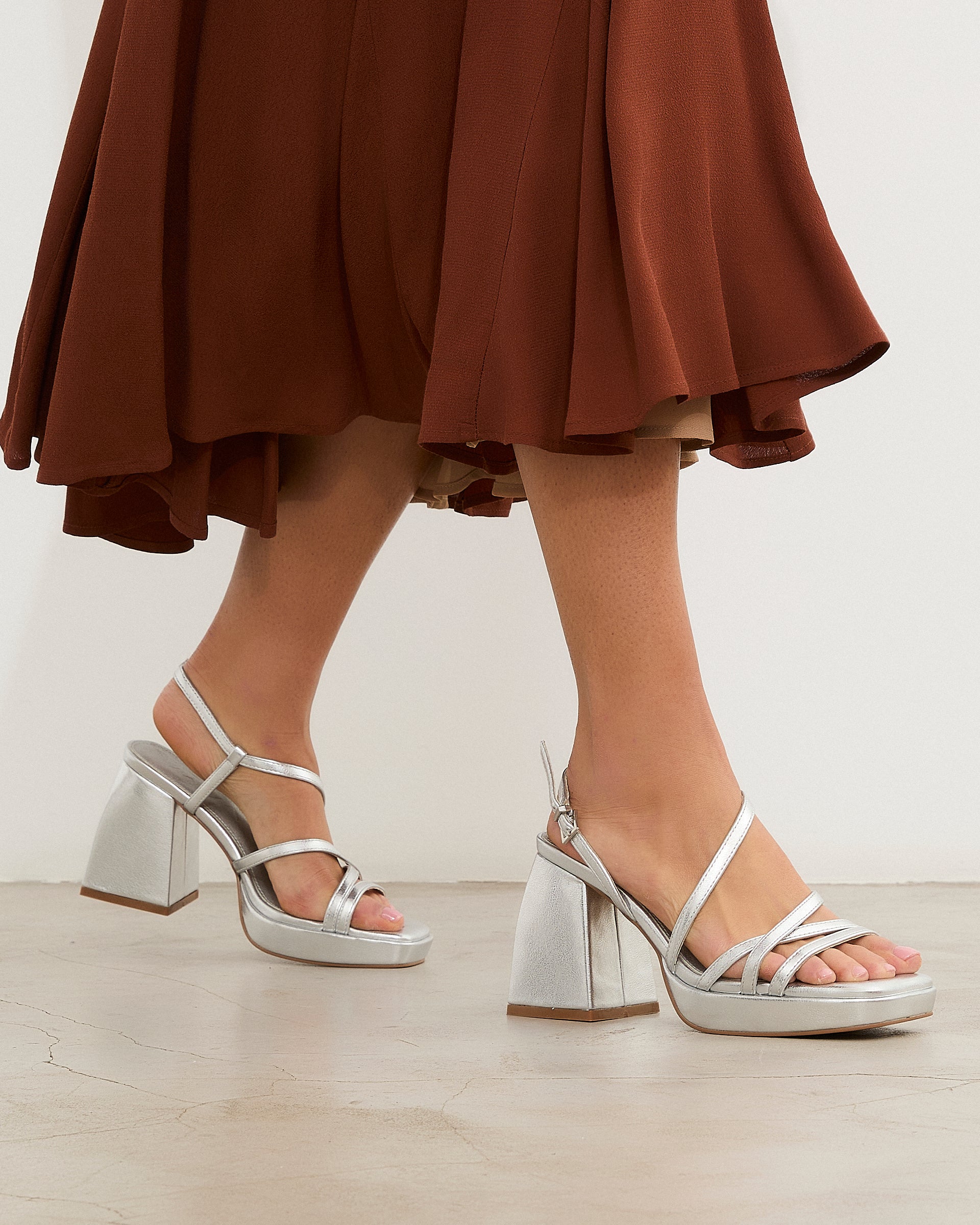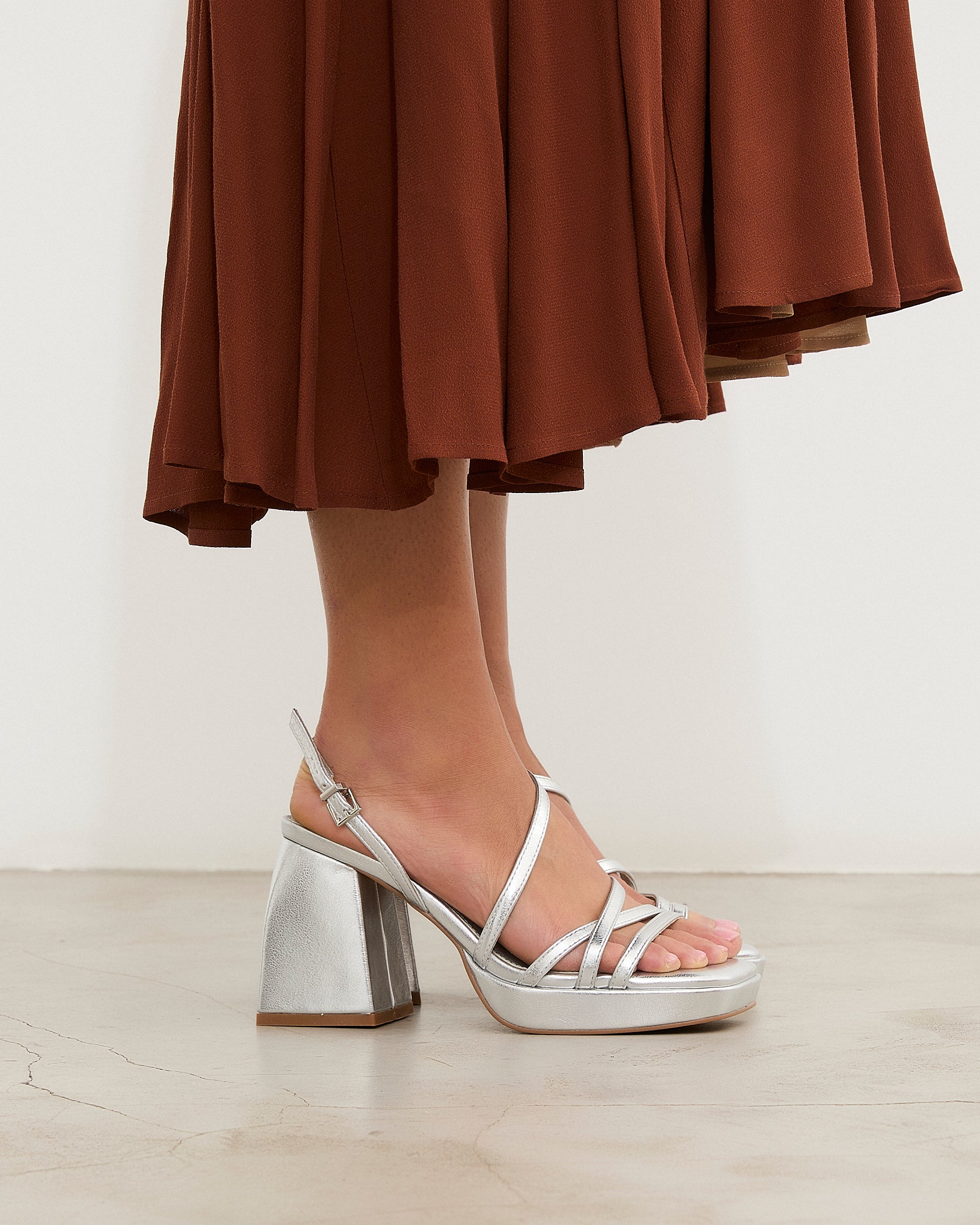 Sandalia de tacón en color plata. Parte delantera abierta con varias tiras tubulares. Tacón cuadrado. Cierre de pulsera al tobillo con hebilla metálica.
