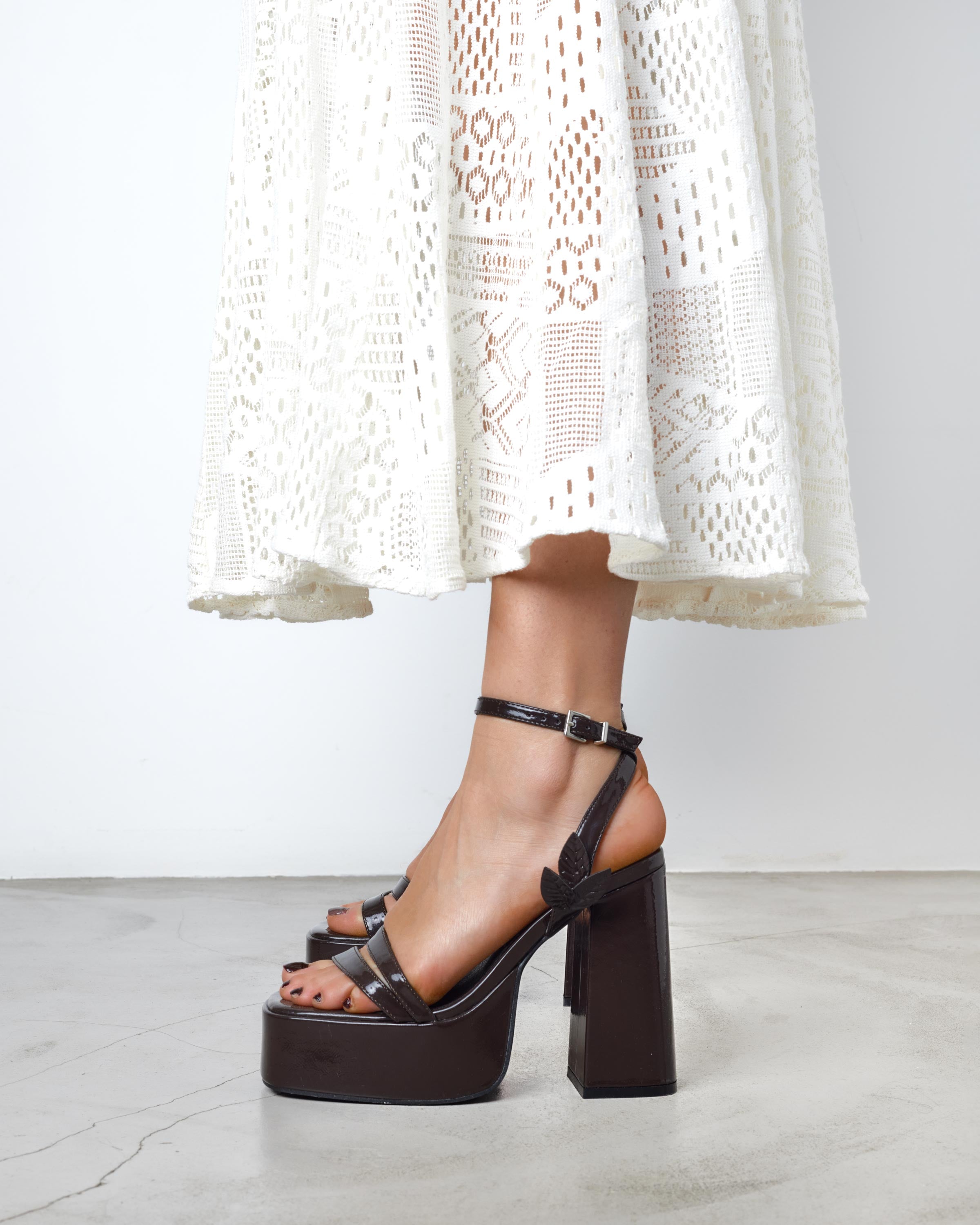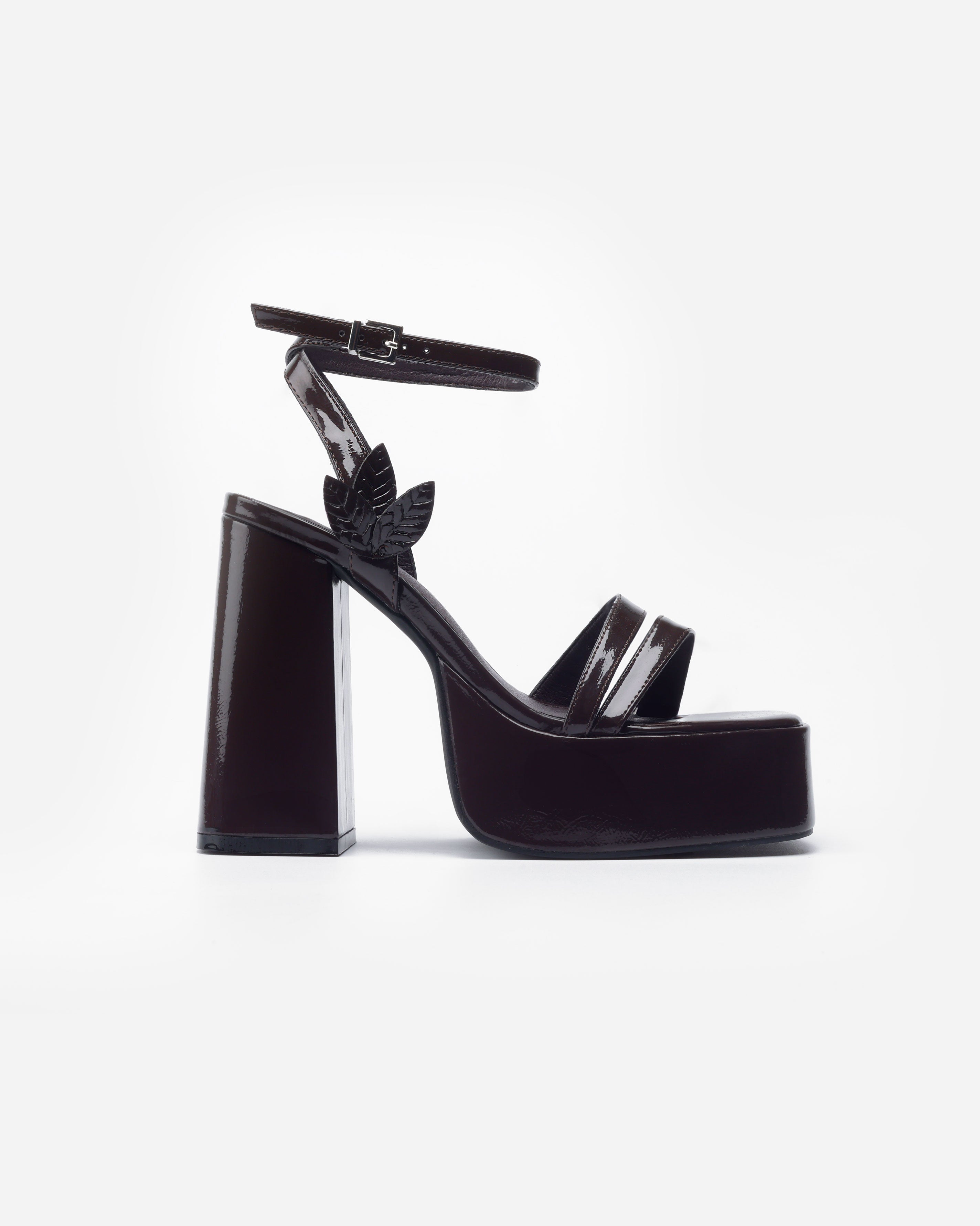 Sandalia de tacón y plataforma en color chocolate. Parte delantera cuadrada abierta con tira unica y tacón cuadrado. Cierre de pulsera al tobillo con detalles de hojas y hebilla metálica.
