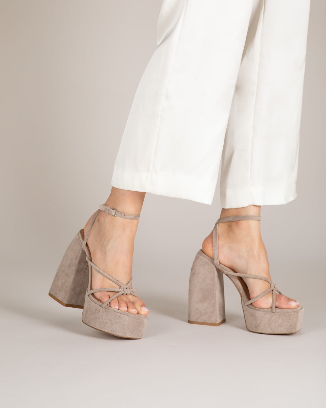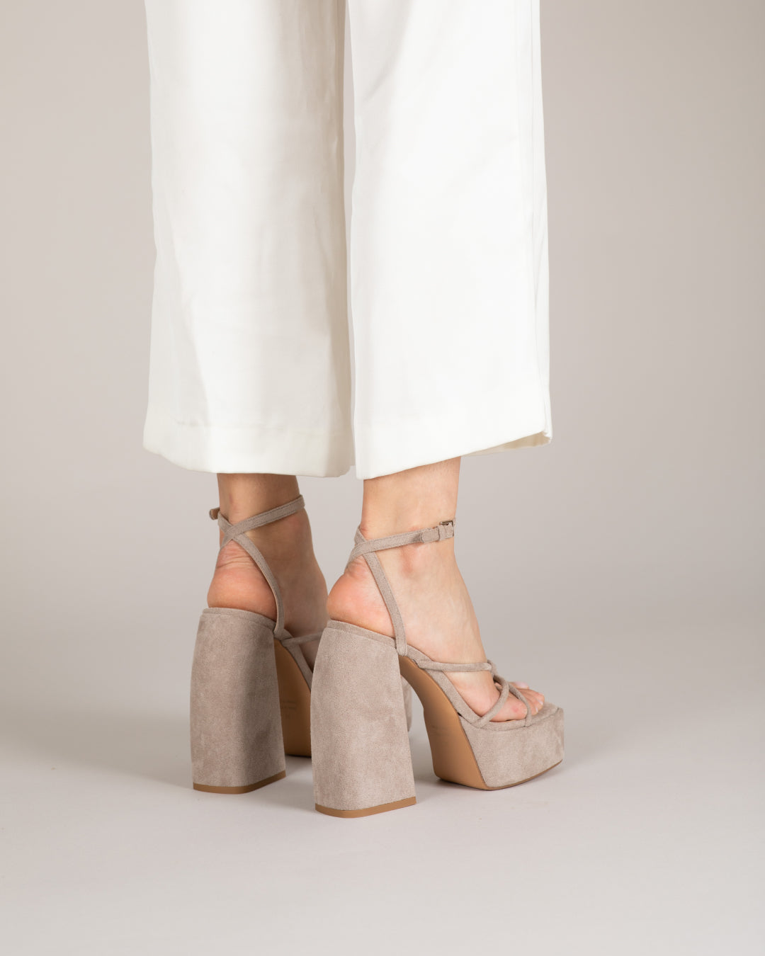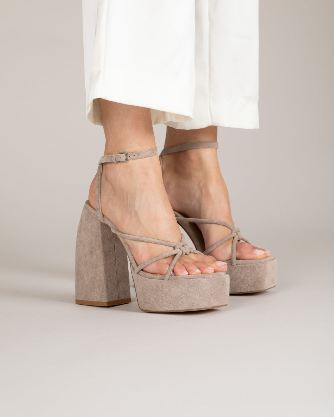 Sandalia de tacón en ante vegano color topo. Parte delantera abierta con tiras en estrella y plataforma. Cierre de pulsera al tobillo con hebilla metálica. Altura de tacón: 15 cm Altura de plataforma: 5 cm
