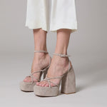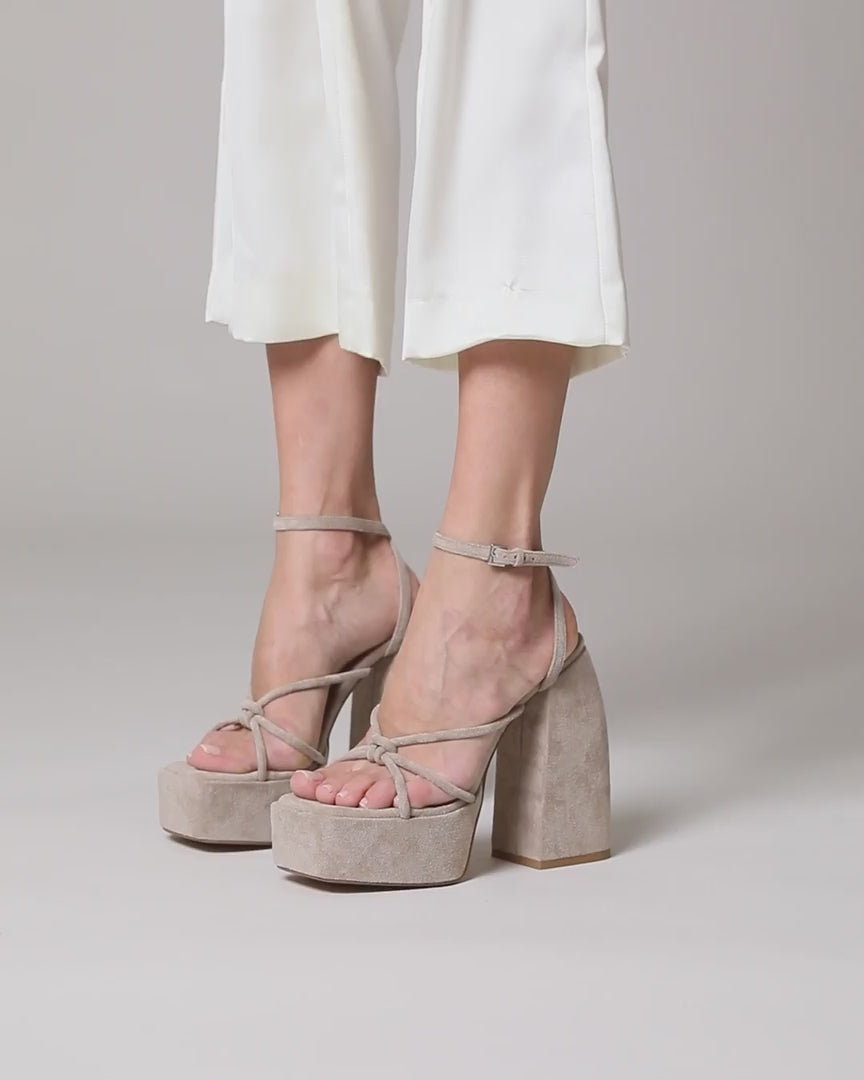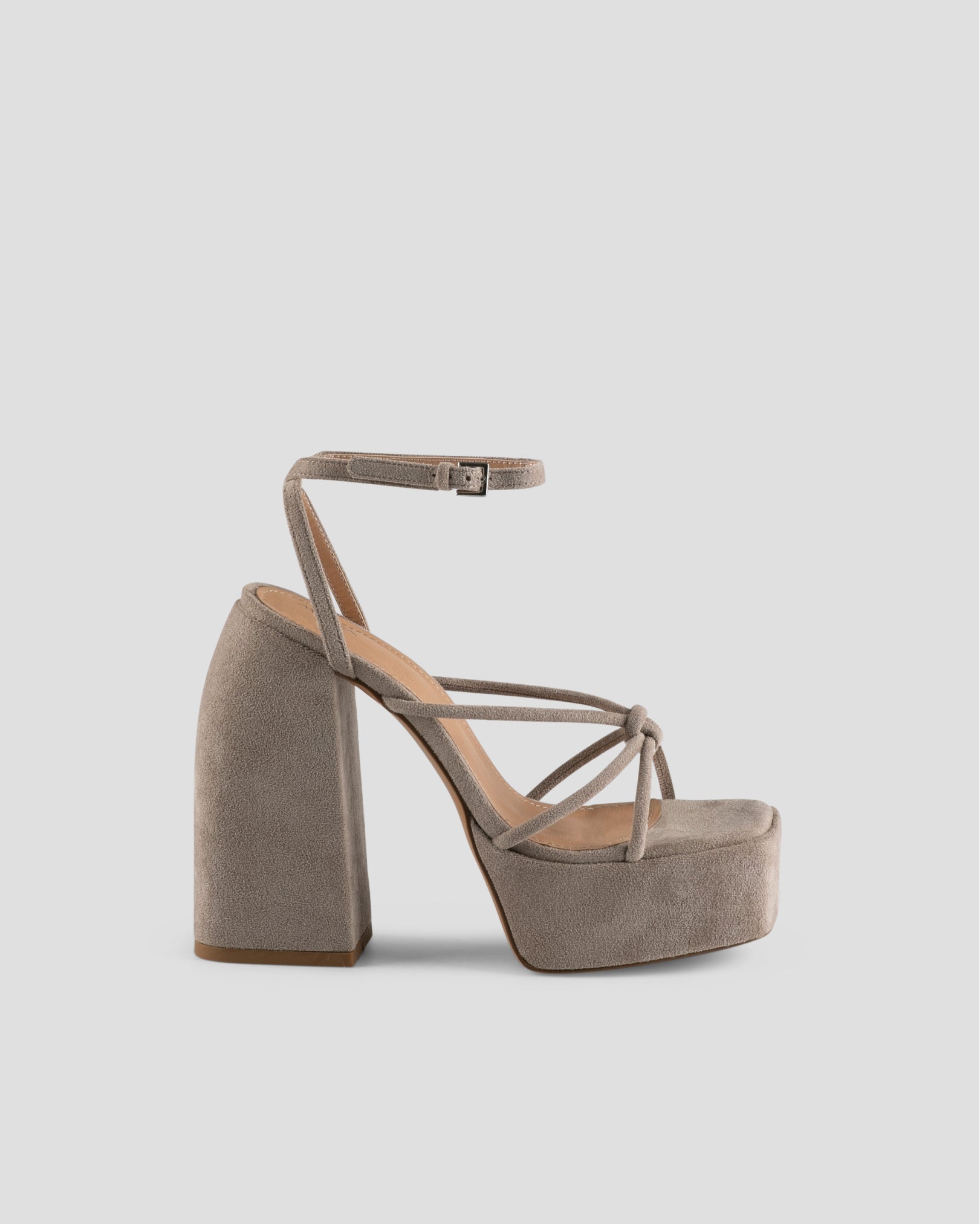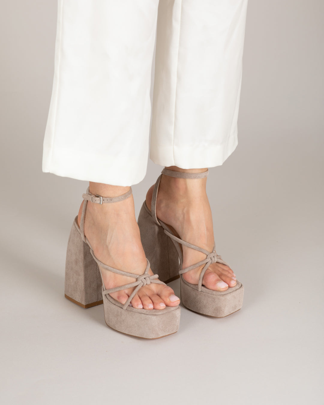 Sandalia de tacón en ante vegano color topo. Parte delantera abierta con tiras en estrella y plataforma. Cierre de pulsera al tobillo con hebilla metálica. Altura de tacón: 15 cm Altura de plataforma: 5 cm