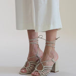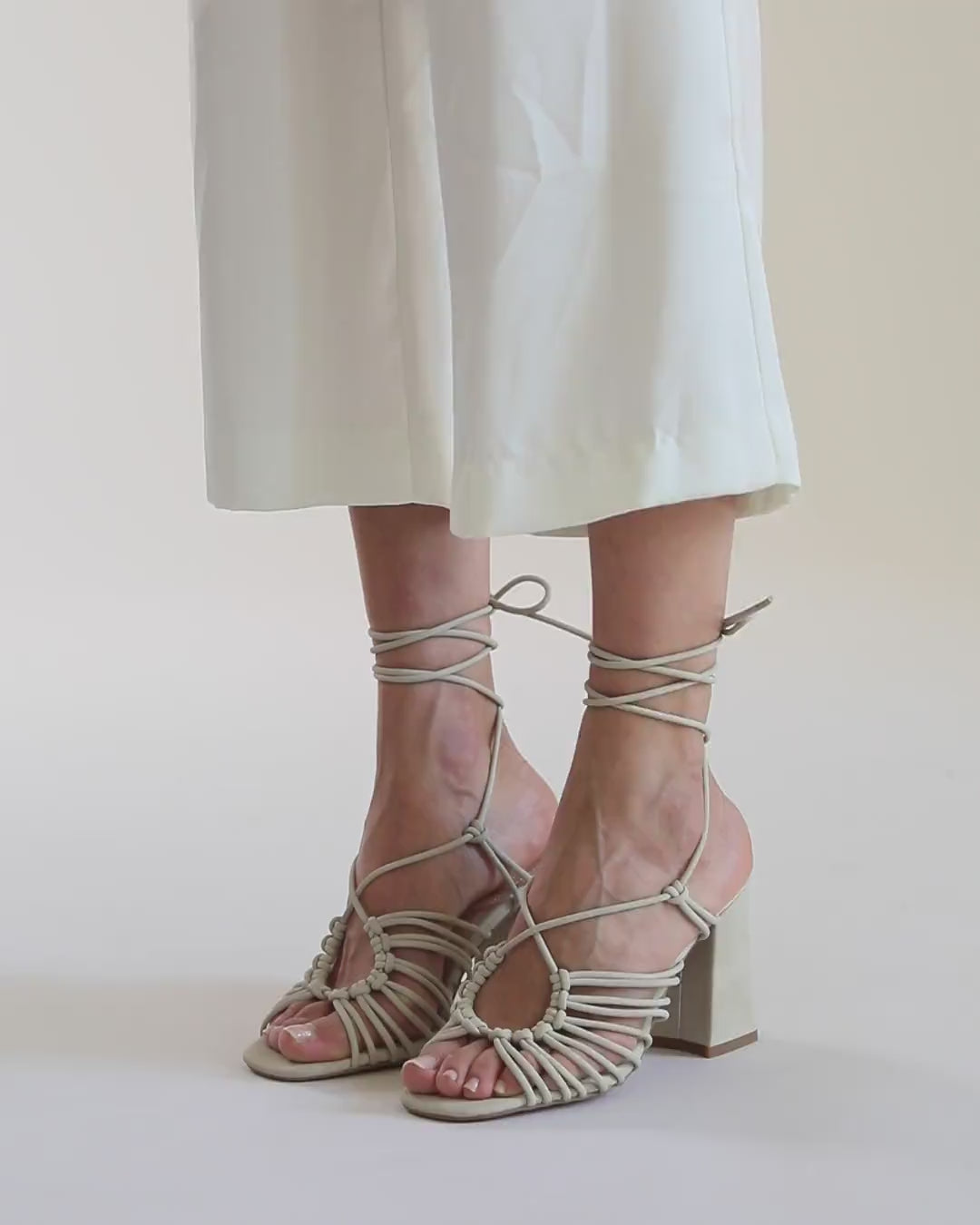 Sandalia de tacón en piel vegana color negro. Parte superior con varias tiras recogidas con una cuerda lagra para anudar en el tobillo.
