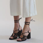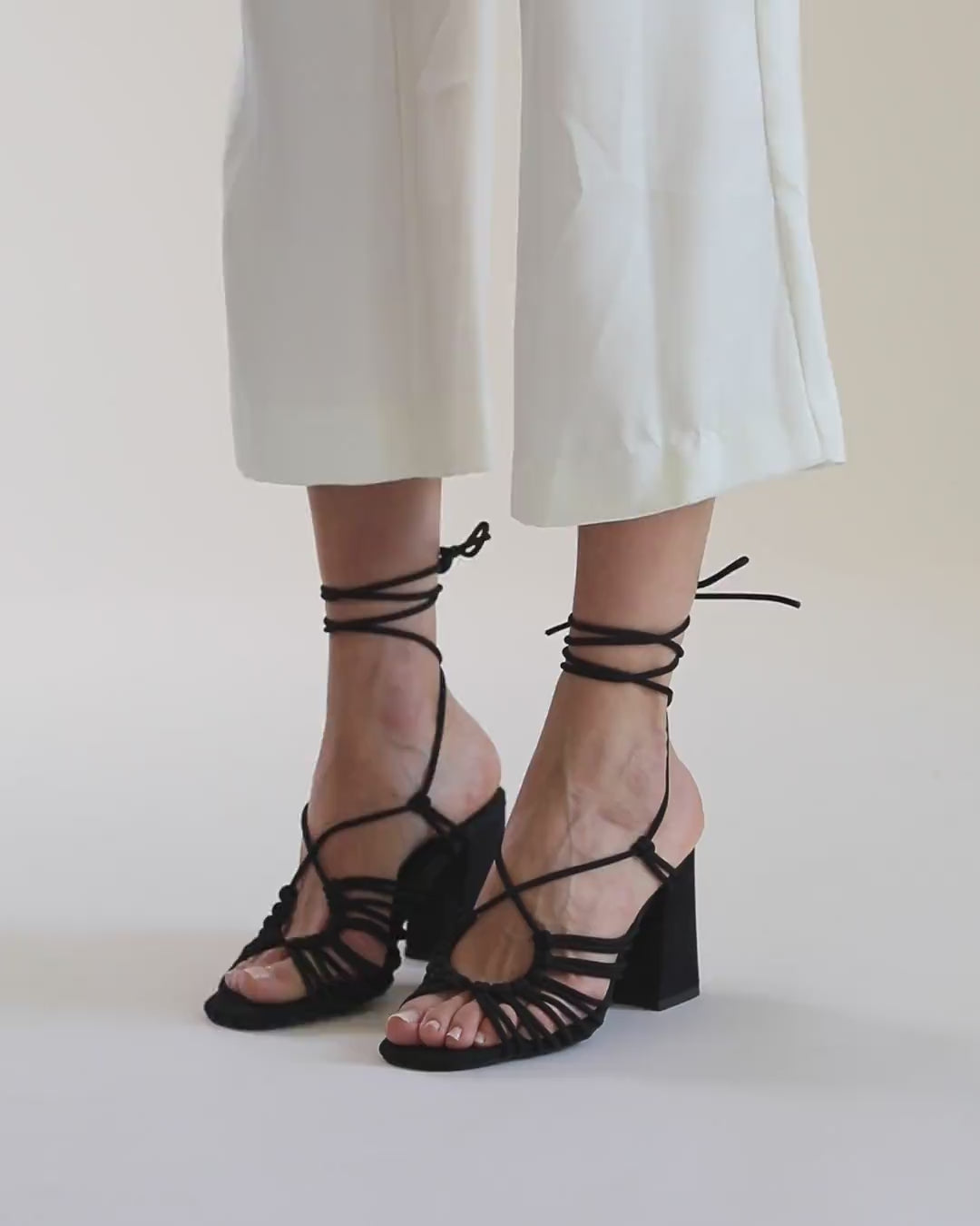Sandalia de tacón en piel vegana color ecru. Parte superior con varias tiras recogidas con una cuerda lagra para anudar en el tobillo.