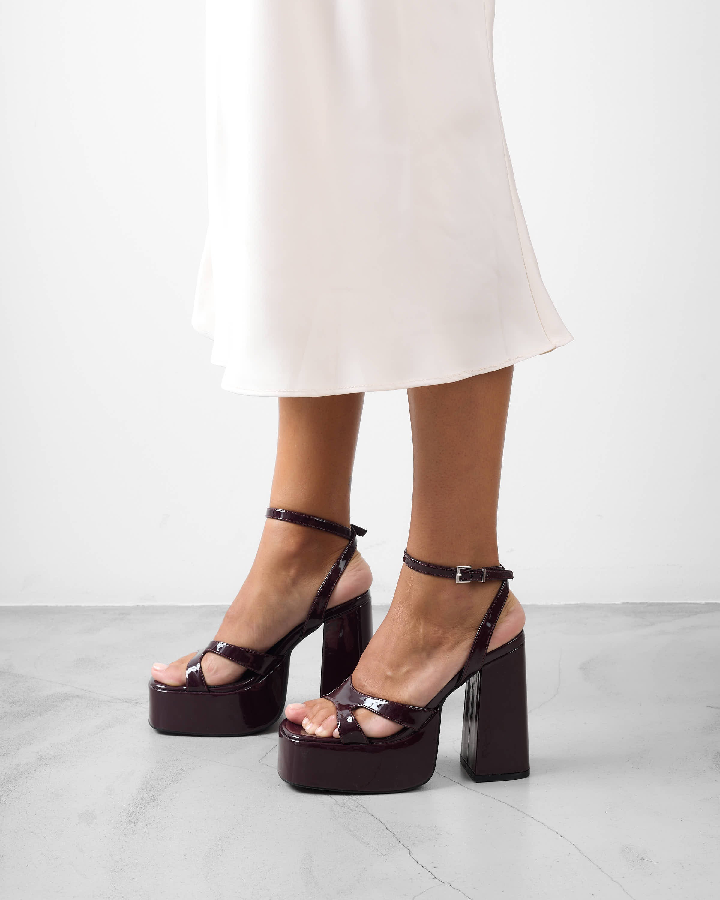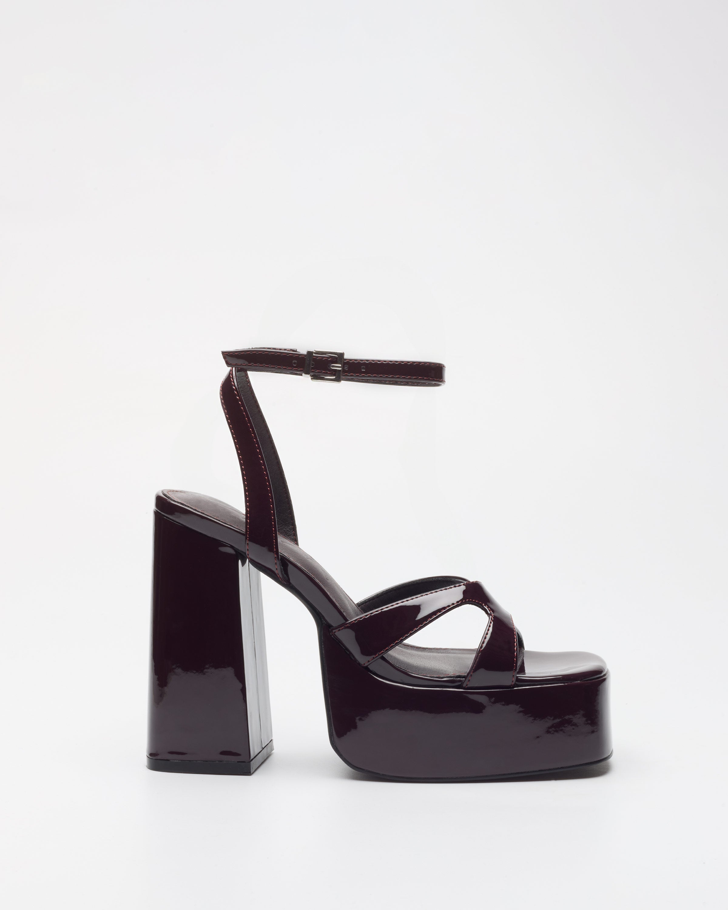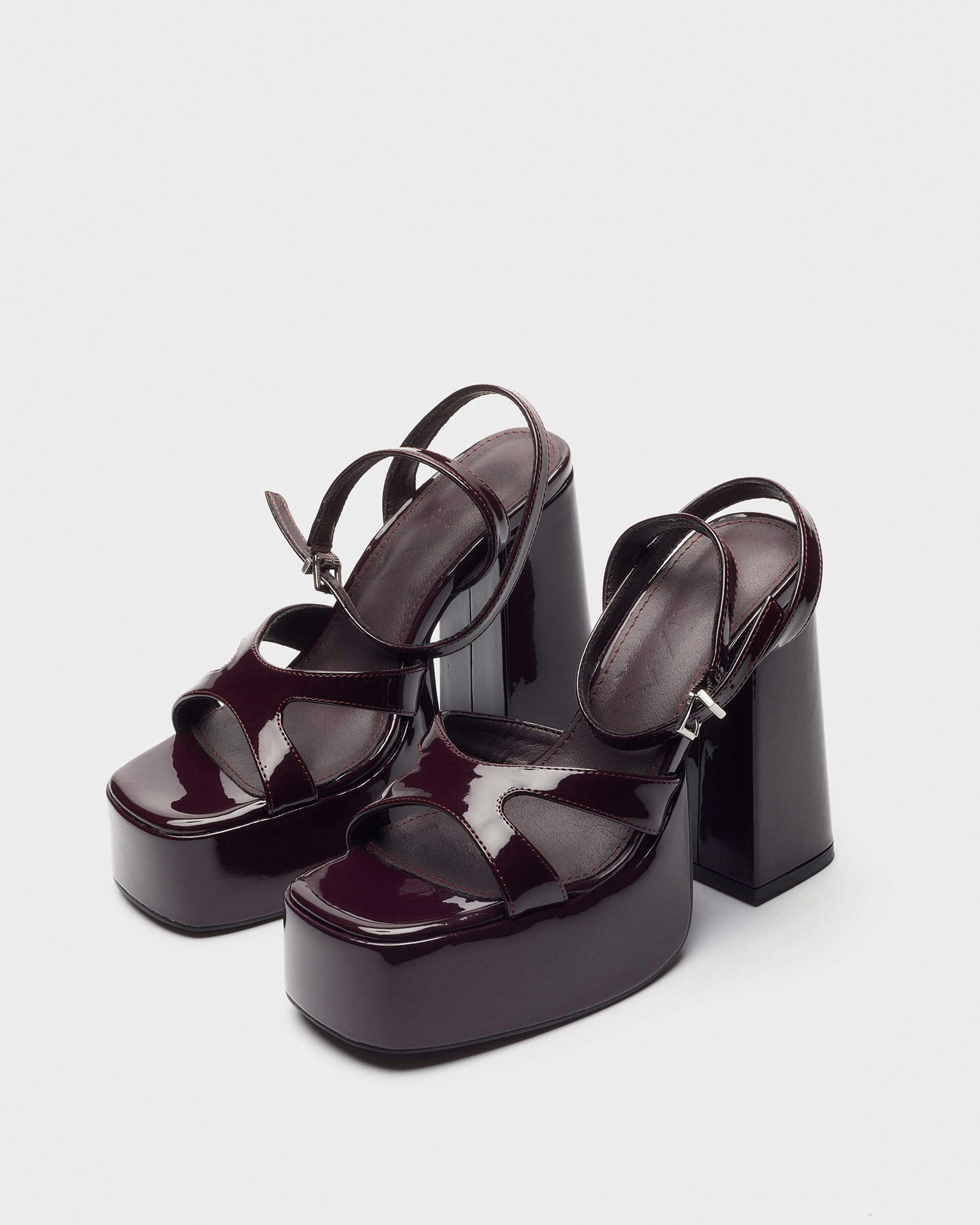 Sandalia de tacón con plataforma en charol color burdeos. Parte delantera abierta con dos tiras cruzadas y cierre de pulsera al tobillo con hebilla. Tacón cuadrado.
