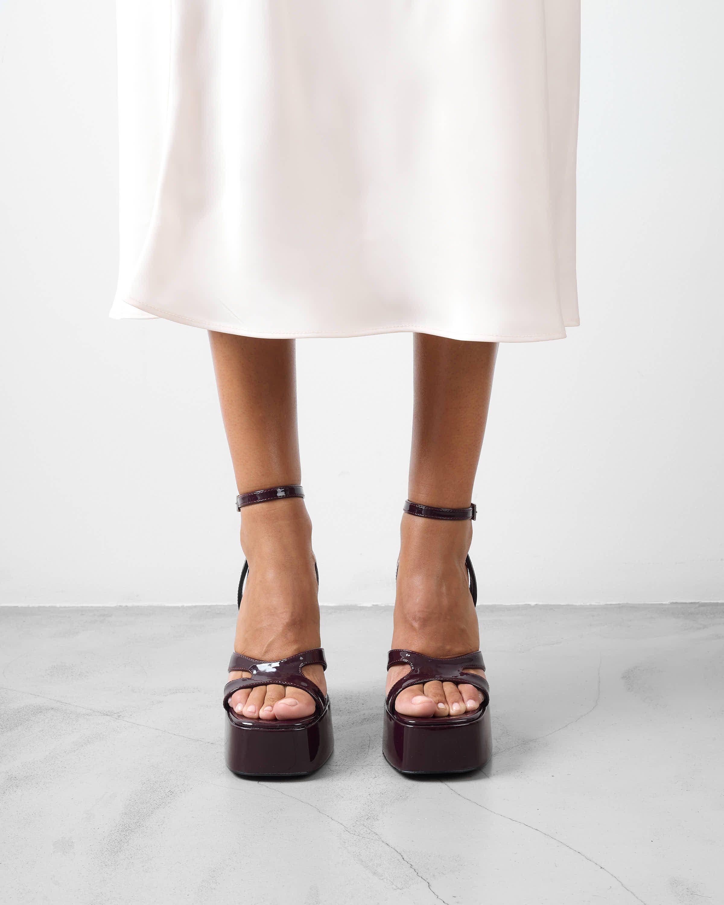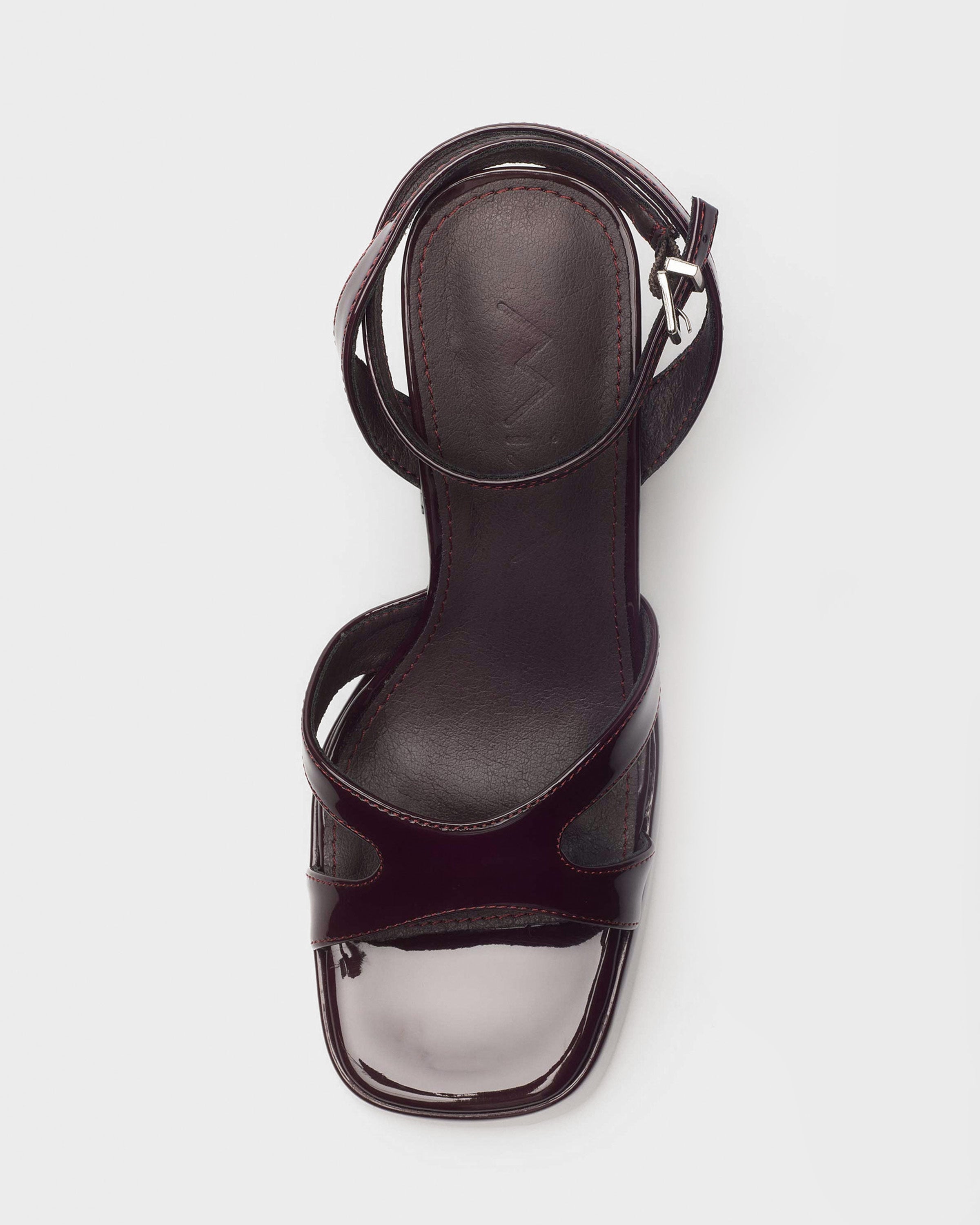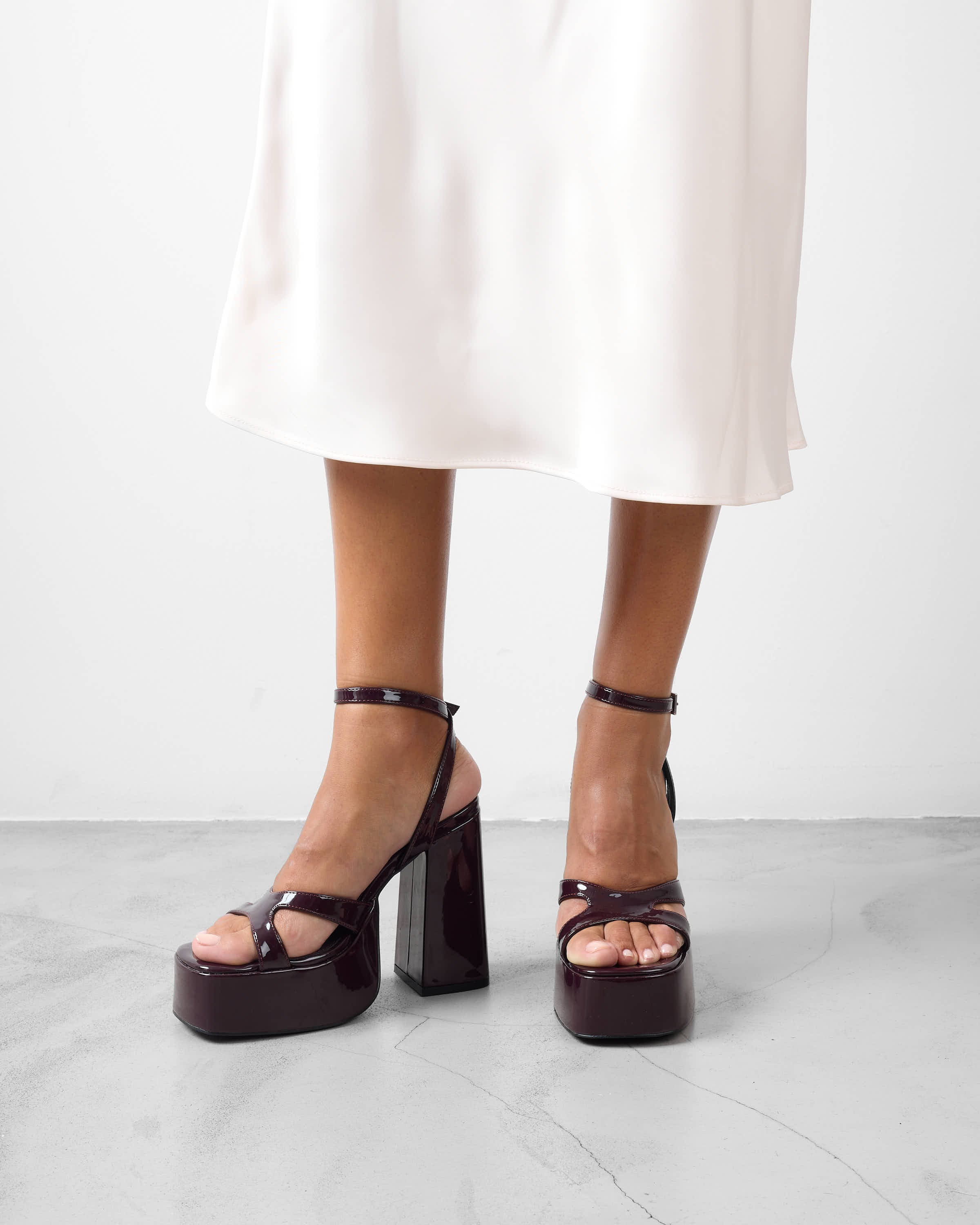 Sandalia de tacón con plataforma en charol color burdeos. Parte delantera abierta con dos tiras cruzadas y cierre de pulsera al tobillo con hebilla. Tacón cuadrado.