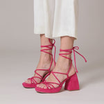 Sandalia de tacón en ante vegano color fucsia. Parte delantera abierta y plataforma con varias tiras en cruz y tacón cuadrado. Cierre de pulsera con tiras al tobillo.