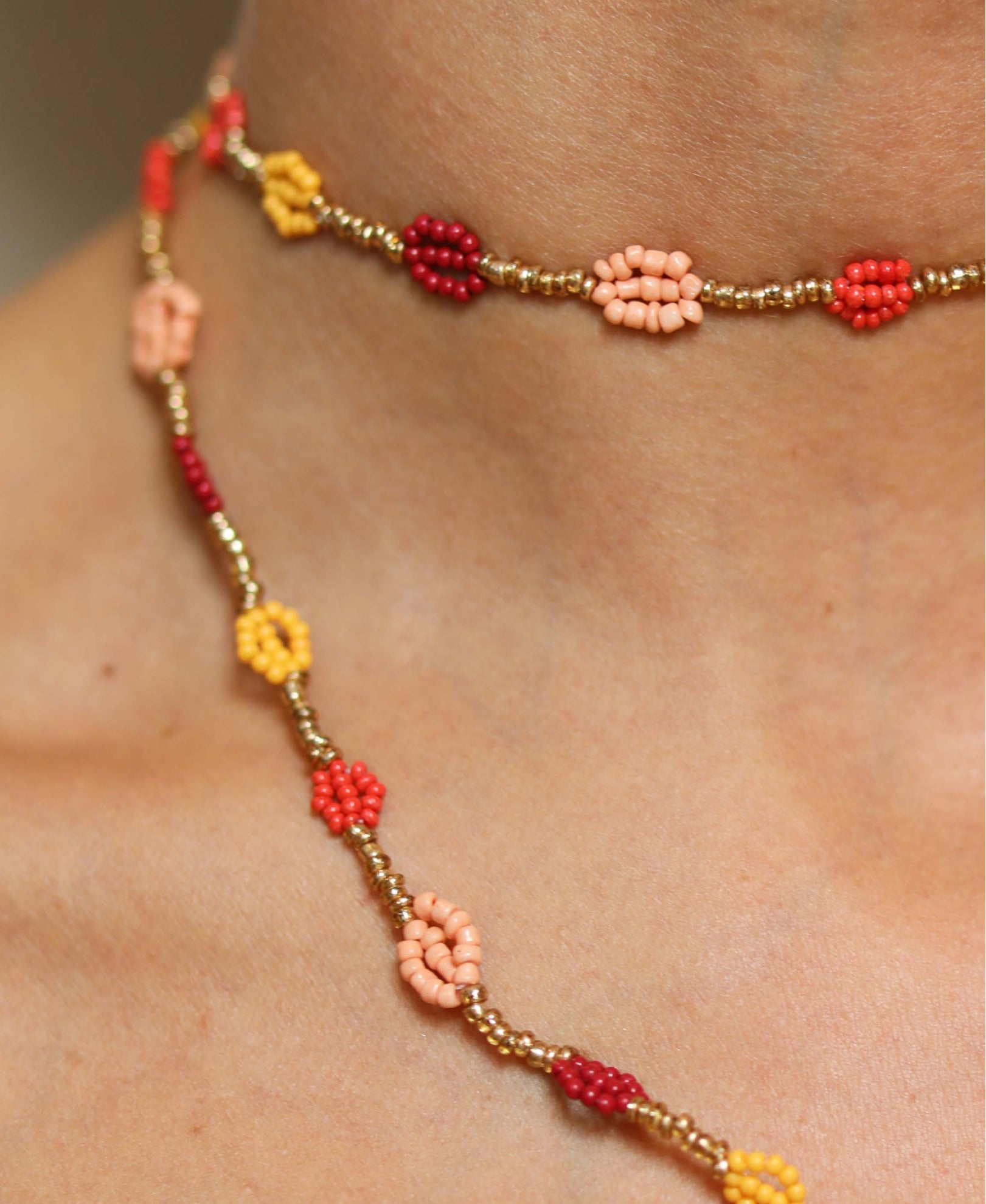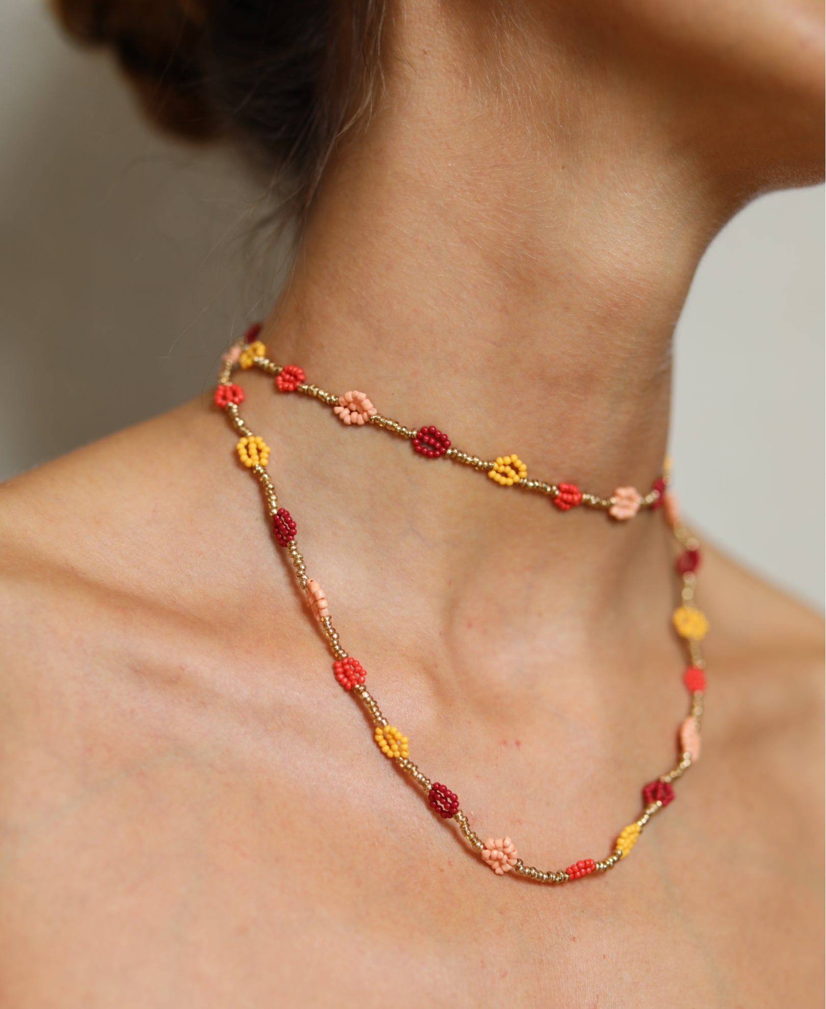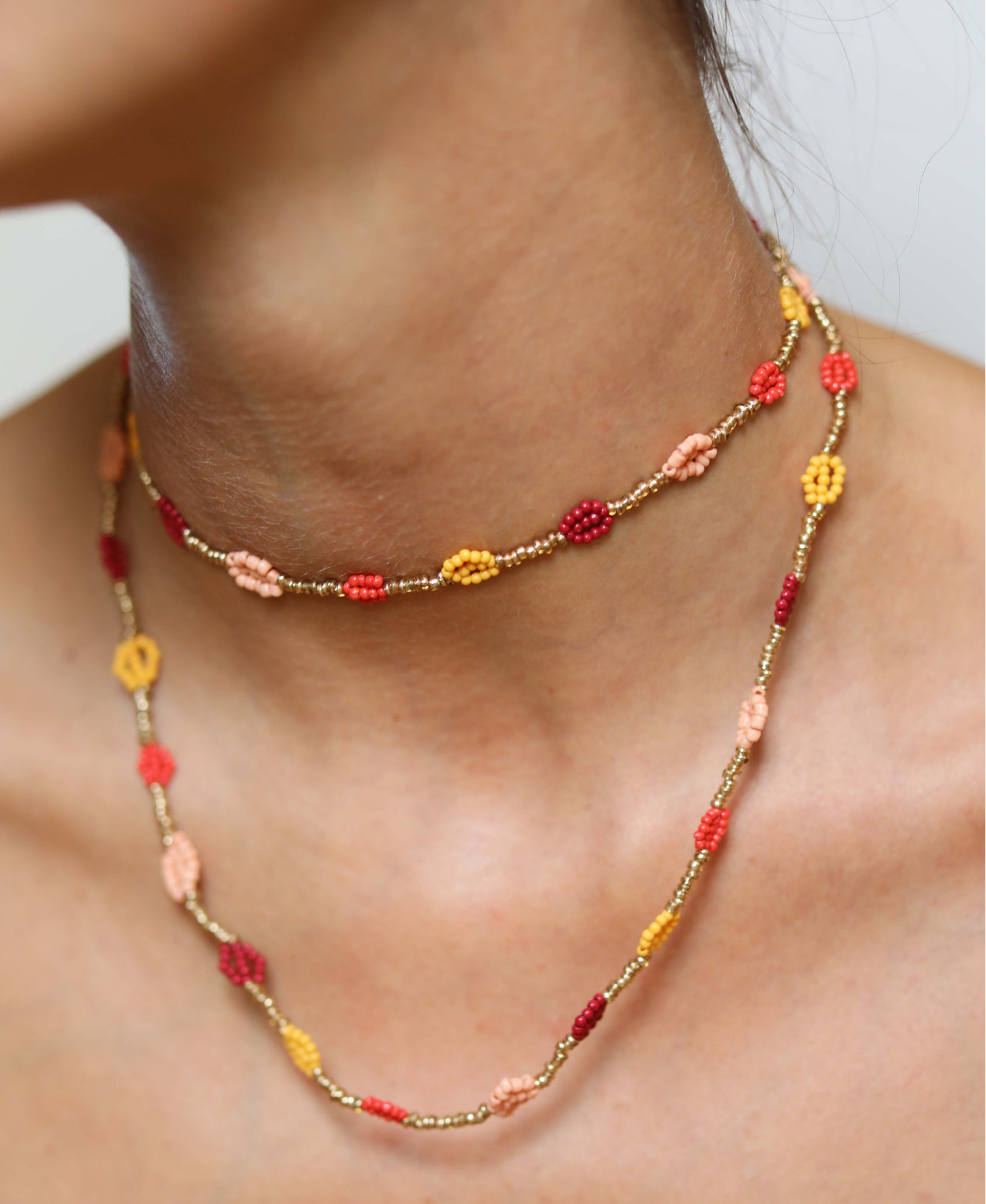 Collar, con dos tiras, una larga y otra corta de abalorios dorados y florecitas en tonos granates, naranjas y amarillos. Cierre dorado en la parte trasera.