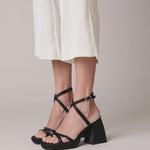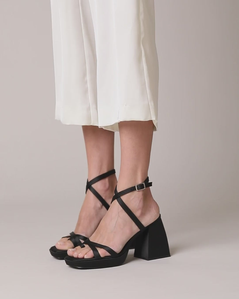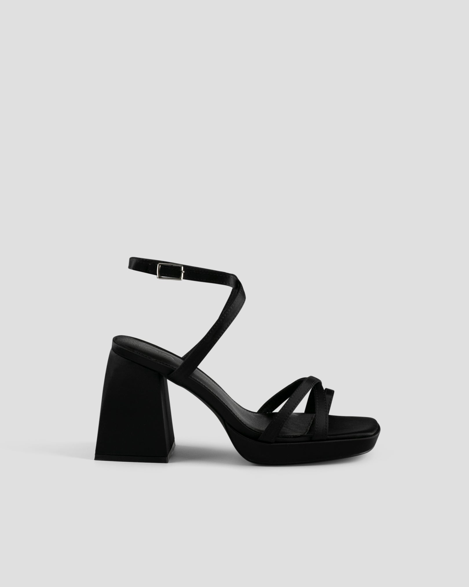 Sandalia de tacón en satén color negro. Parte delantera abierta con tira en el dedo y tiras en cruz, plataforma y tacón cuadrado. Cierre de tiras al tobillo con hebilla metálica.