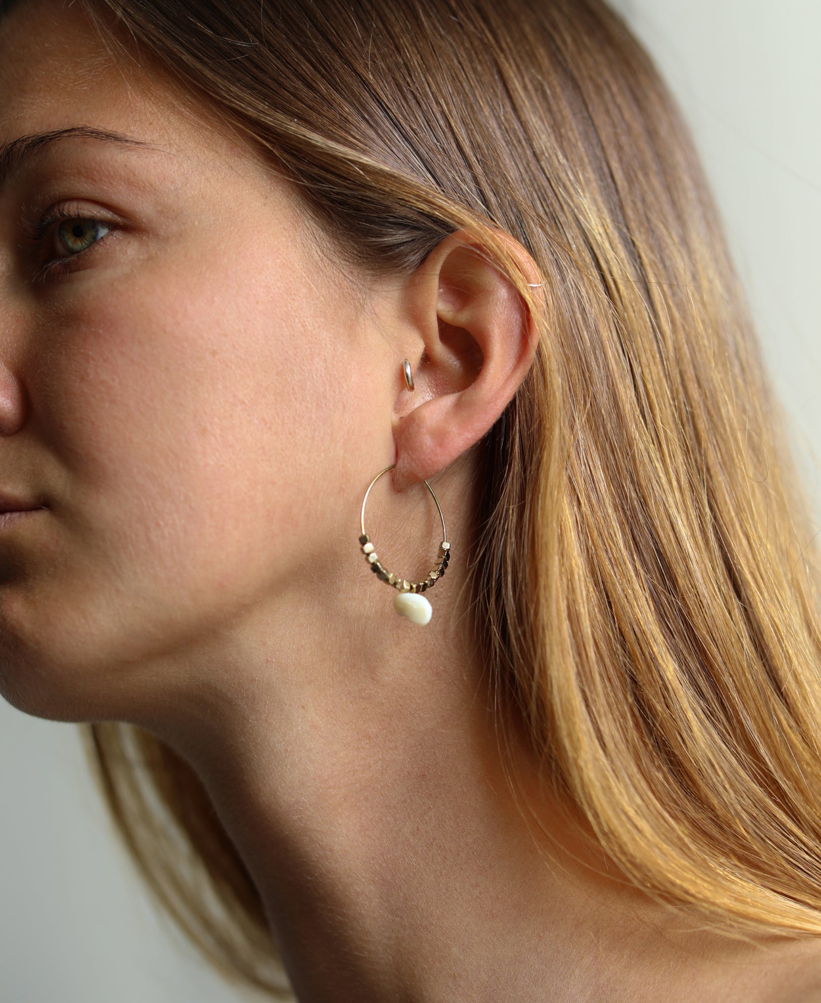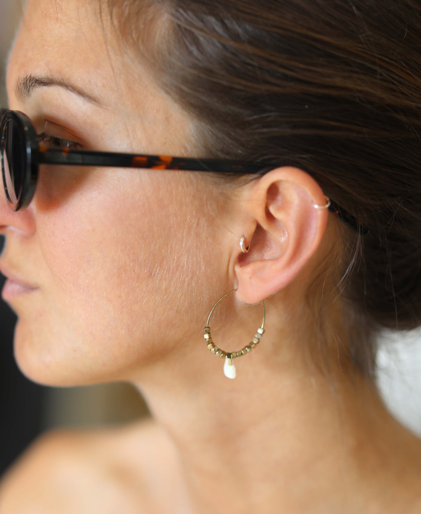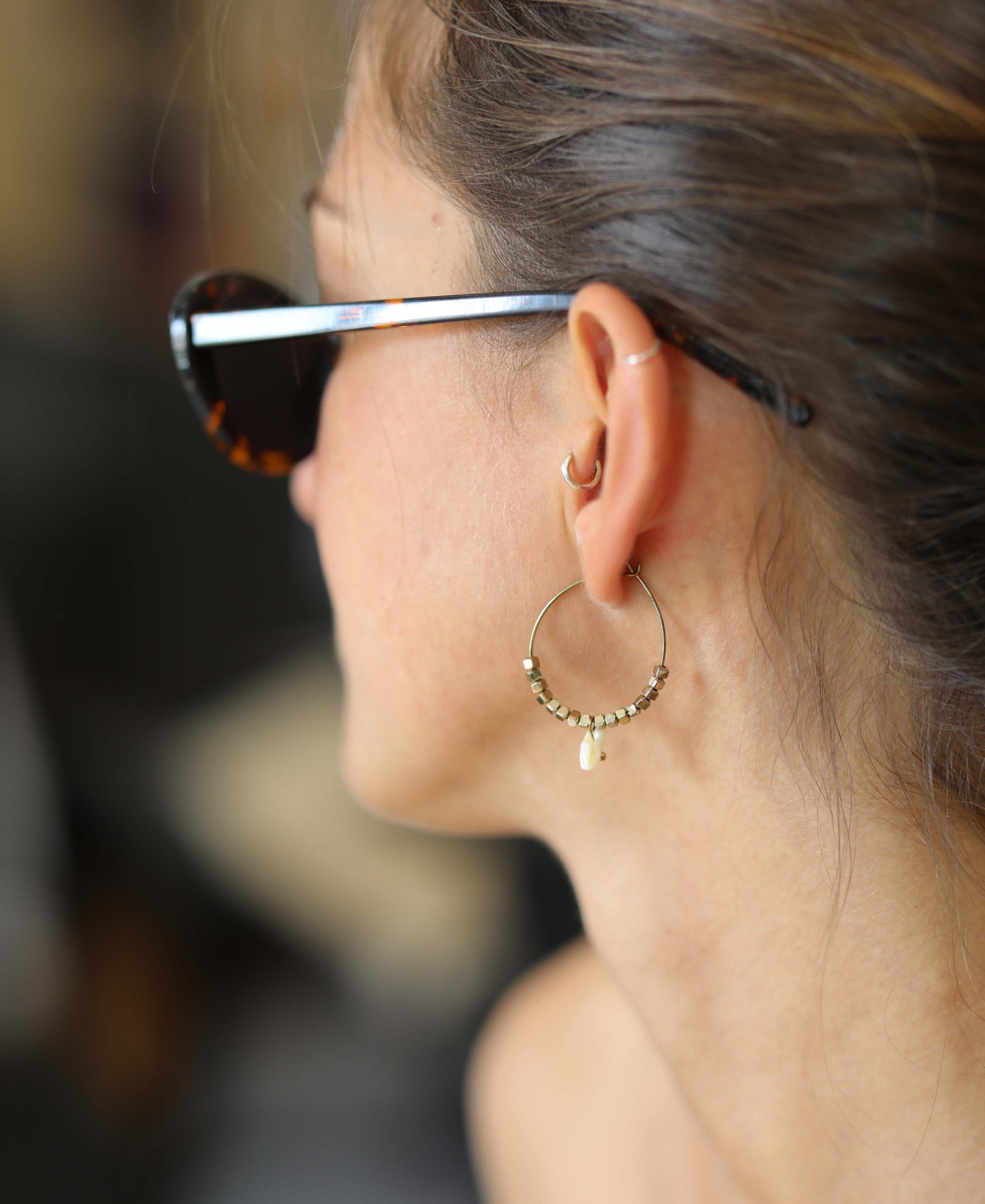 Pendientes de aro tamaño mediano con un cierre fácil para mayor comodidad. Con bolitas doradas y piedrecita blanca colgante