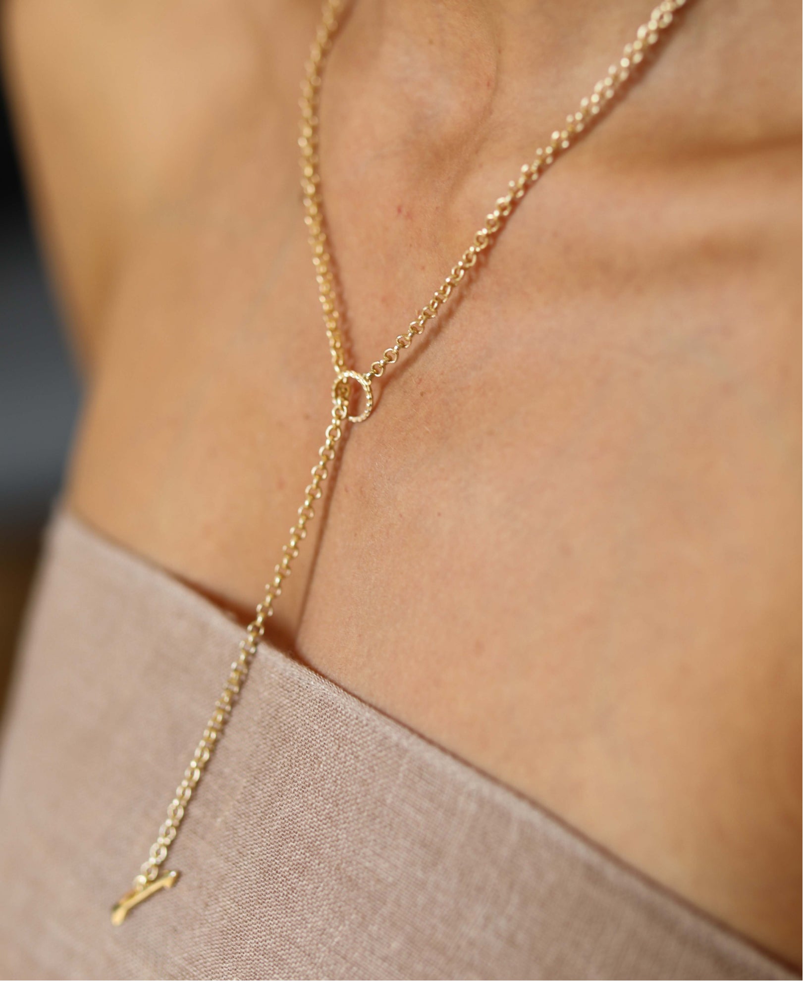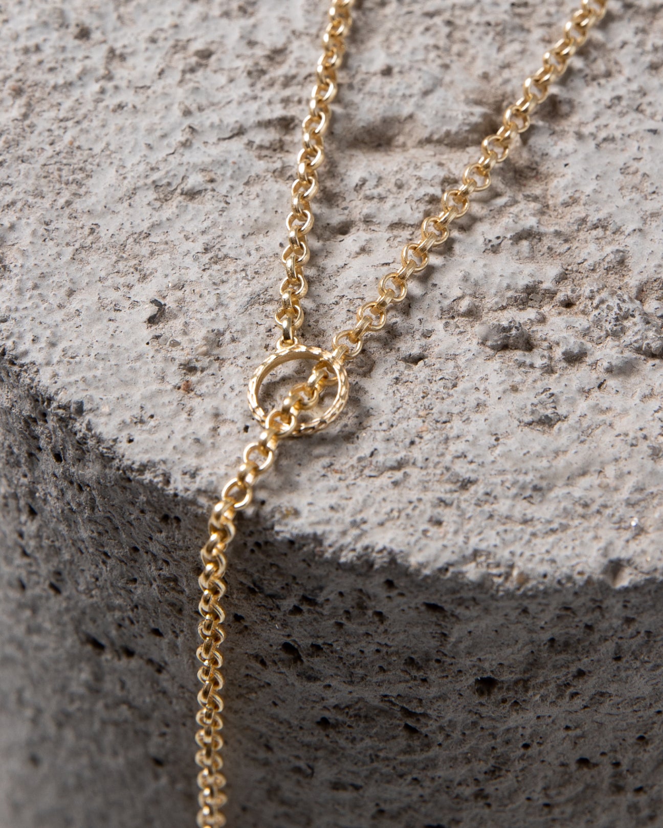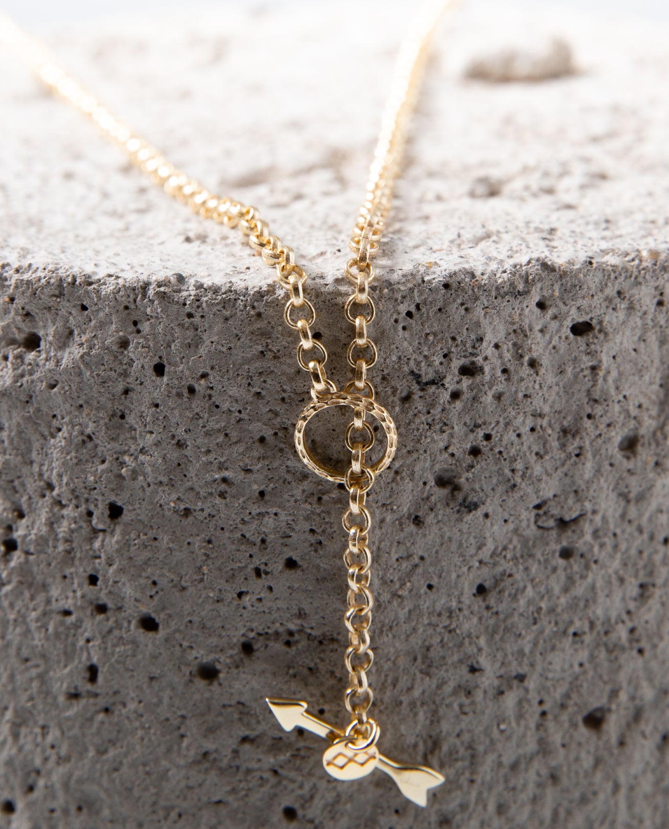 Cadena dorada, con un aro en un extremo y en el otro una flecha. Estos elementos forman a su vez el cierre, que se encuentra en la parte delantera quedando la flecha colgando.
