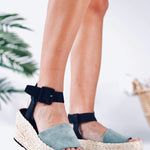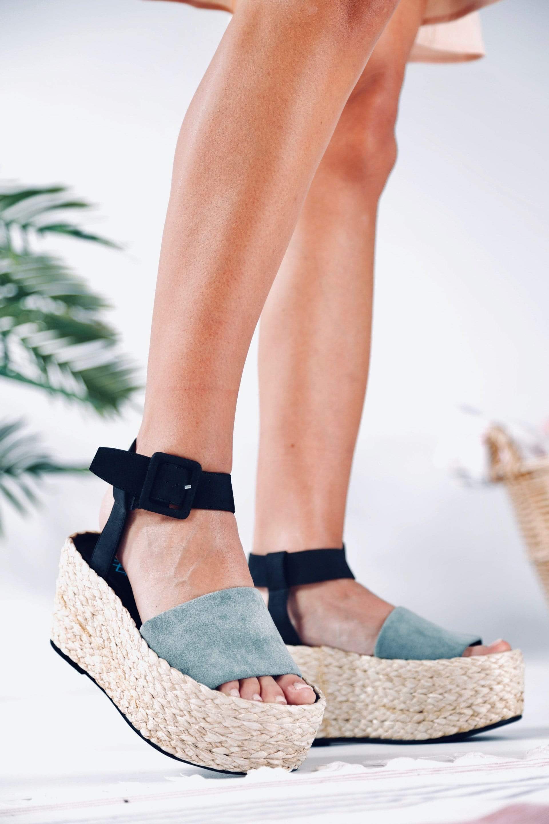 Sandalia con plataforma de esparto con parte delantera azul y cinta del tobillo negra. Detalle de sujeción en pulsera alrededor del tobillo.