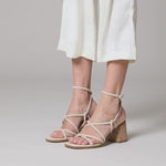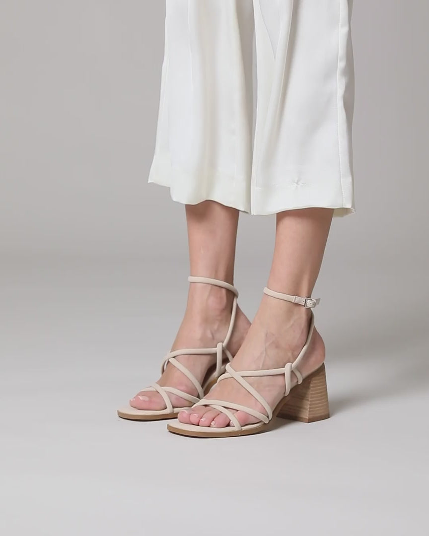 Sandalia de tacón en ante vegano color ecru. Parte delantera abierta con varias tiras y enganches. Tacón de madera con cierre de pulsera al tobillo con hebilla metálica.