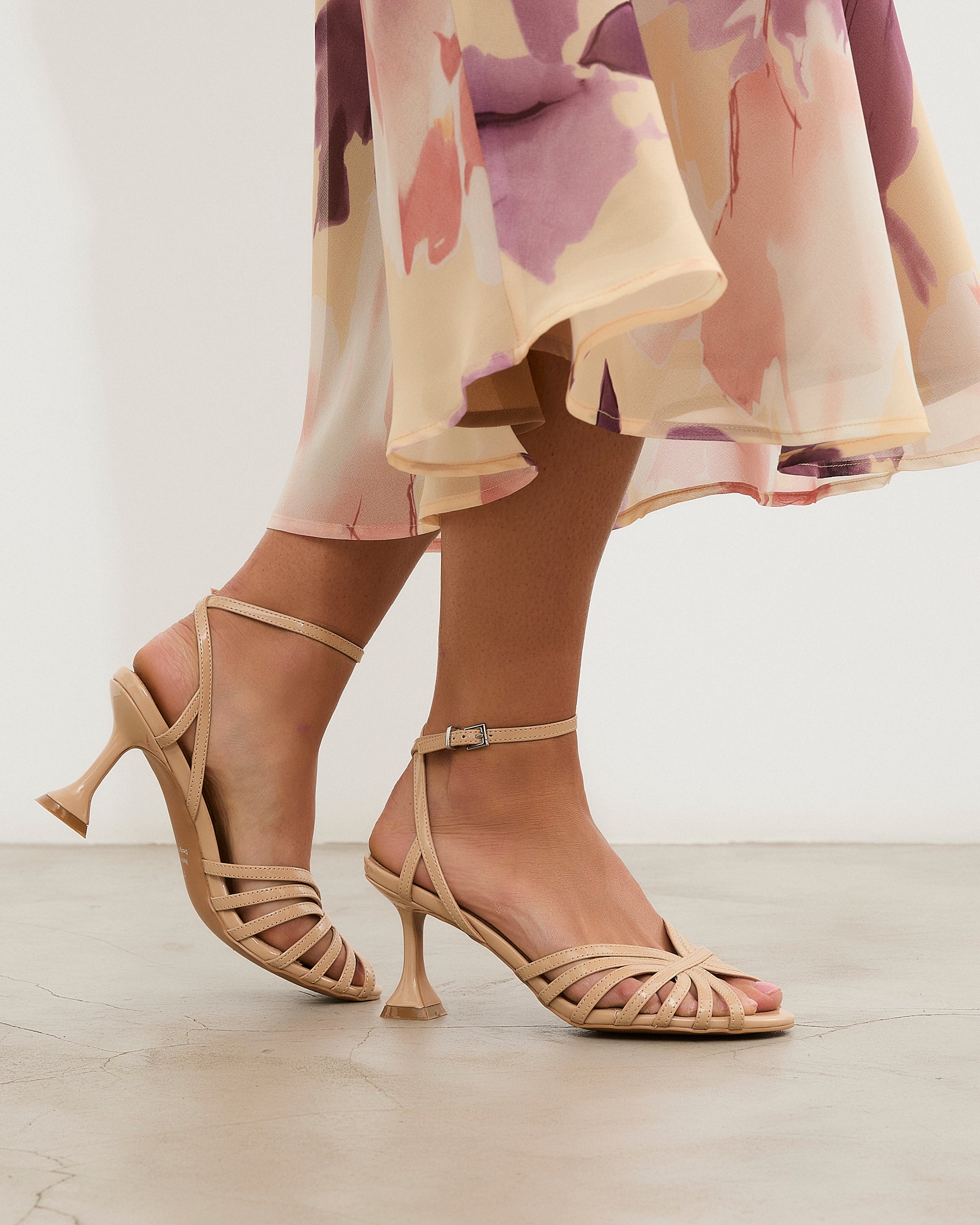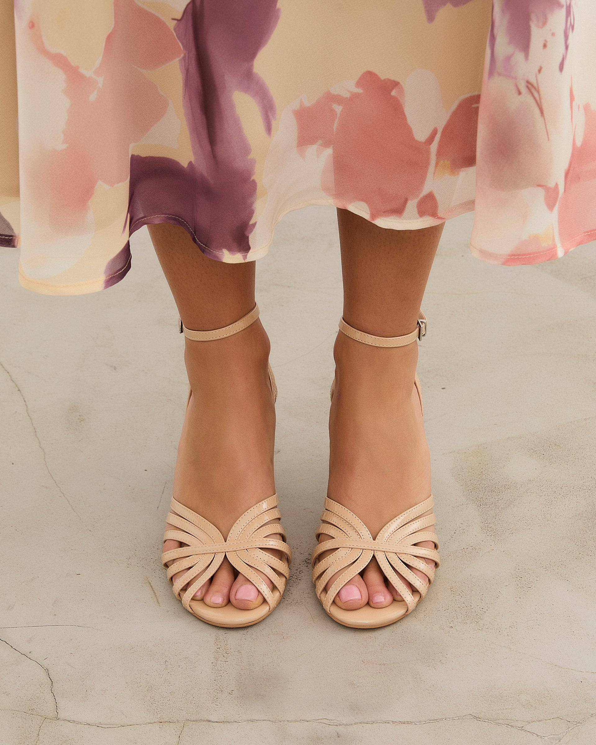 Sandalia de tacón con punta redondeada en color nude. Parte delantera formada por multiples tiras unidadas por otra tira central. Tira trasera para cierre en tobillo con hebilla. Tacón de aguja fino con base ancha.