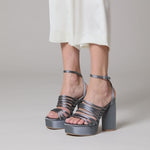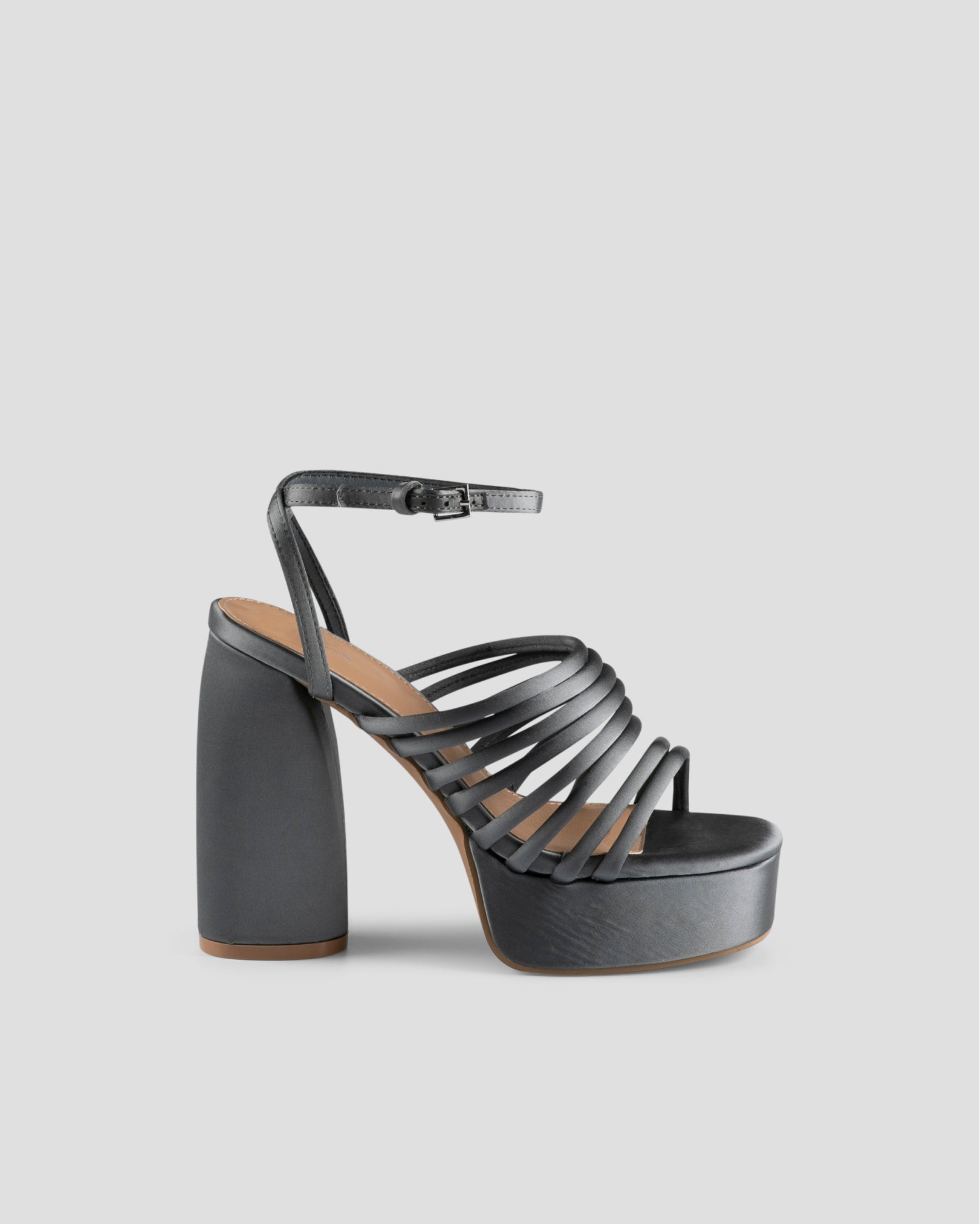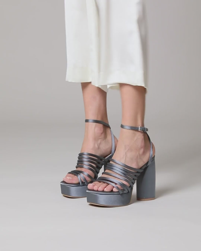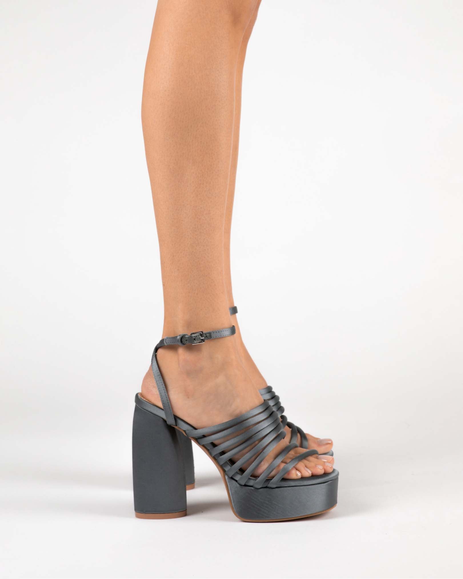 Sandalia de tacón en satén color gris. Parte delantera abierta en redondo con plataforma y varias tiras delanteras. Cierre de pulsera al tobillo con hebilla metálica.