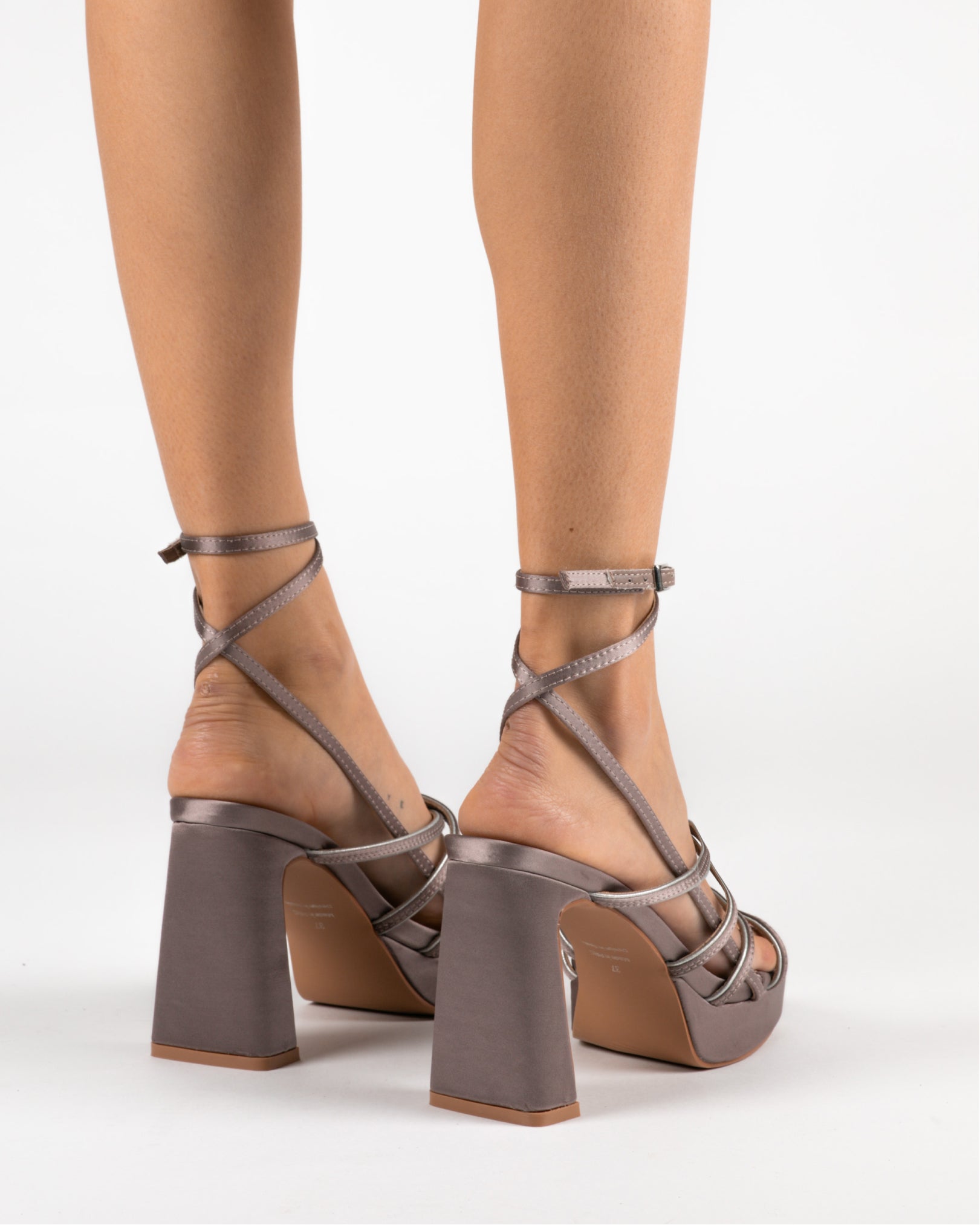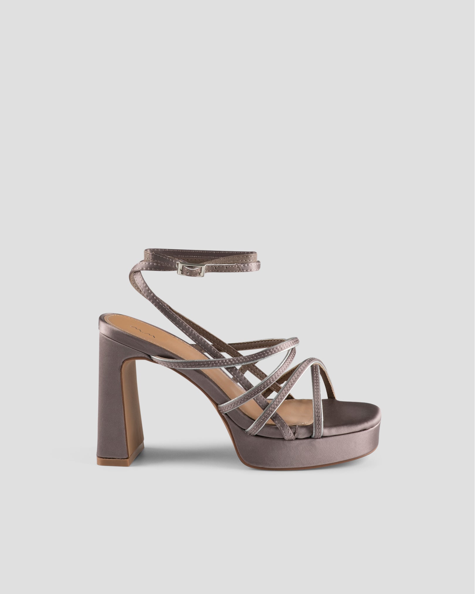 Sandalia de tacón en satén color malva y plataforma. Parte delantera abierta con varias tiras asimétricas y tacón rectangular. Cierre en tiras al tobillo con hebilla metálica.