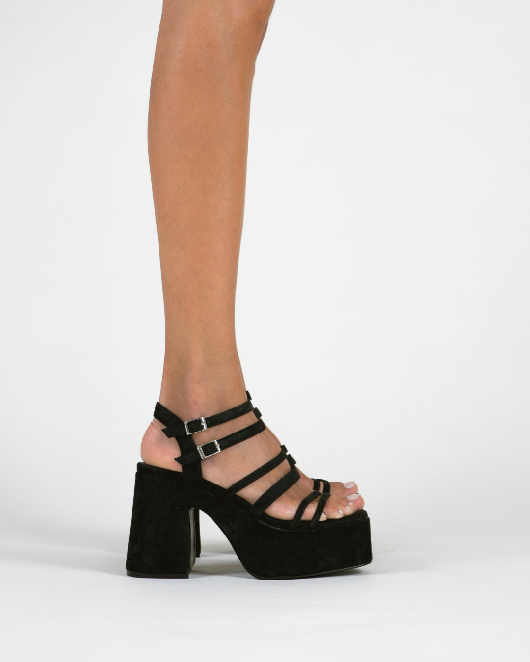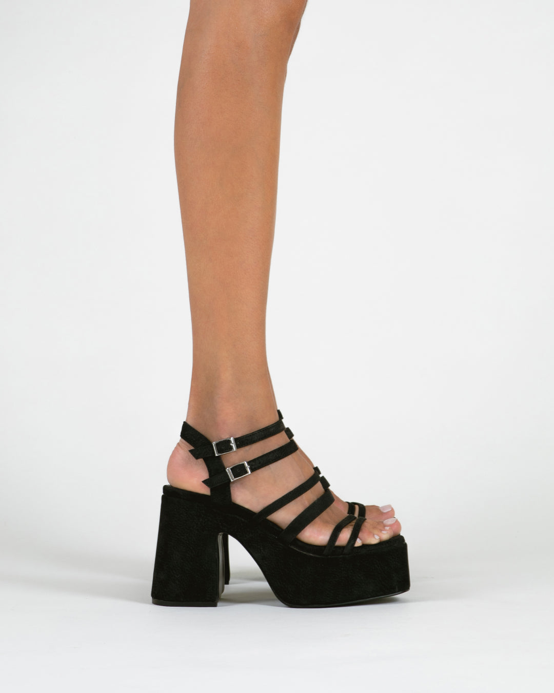 Sandalia de tacón con plataforma en cuero vegano color negro Cuatro tiras en la parte frontal con diferentes grosores con glitter y tira de pulsera en el tobillo con hebilla plateada para el cierre.