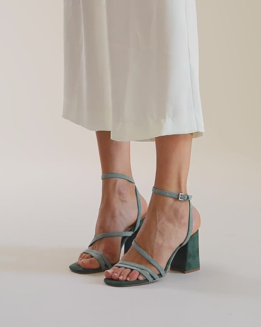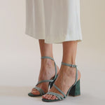 Sandalia de tacón en ante vegano color aguamarina. Parte delantera abierta sin plataforma con dos tiras simétricas delanteras y cierre en tiras al tobillo con hebilla metálica.