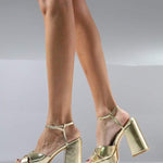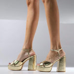 Sandalia de tacón con plataforma dorada. Dos tiras delanteras cruzadas, y fina tira tobillera para el agarre. Cierre con pequeña hebilla cuadrada.