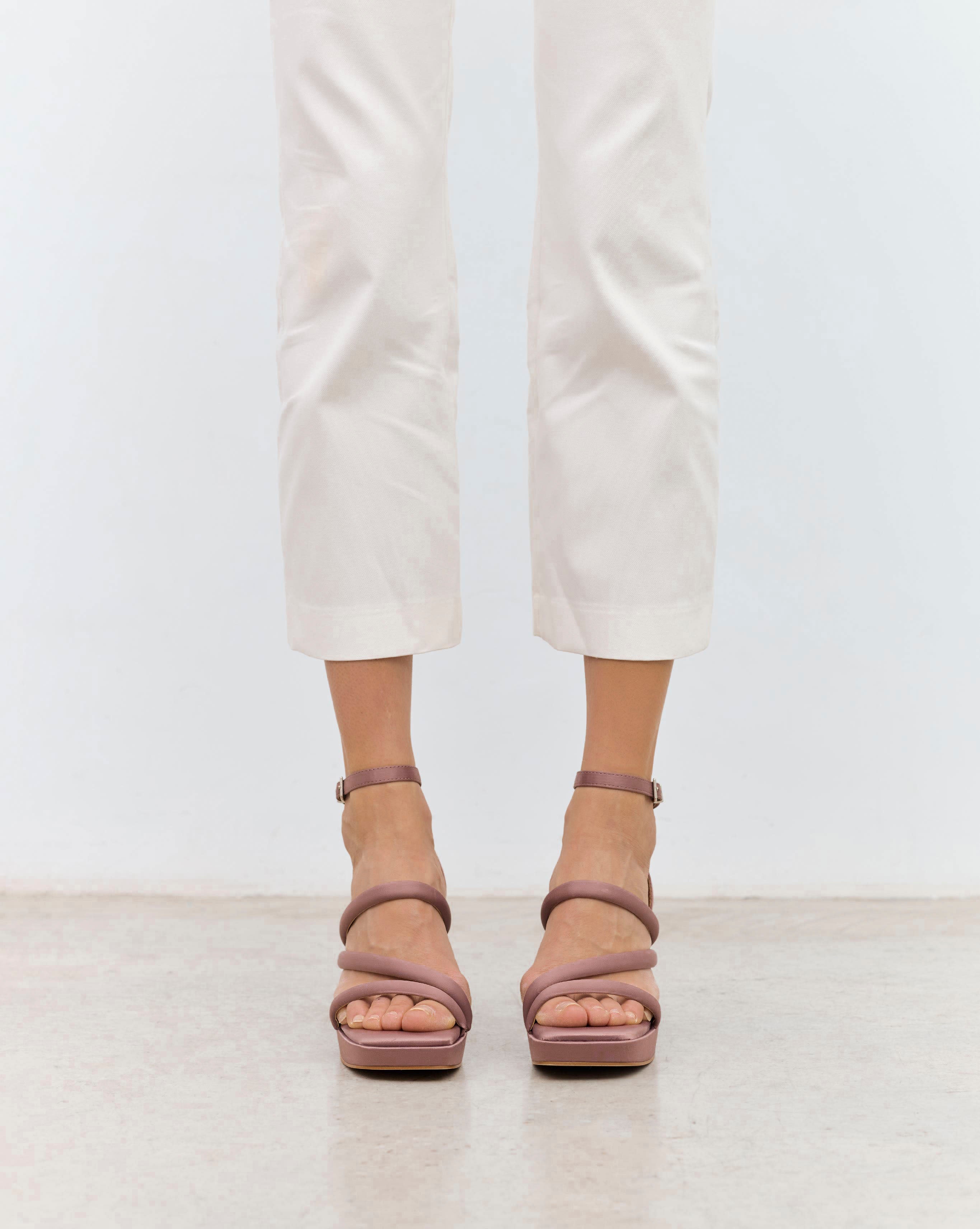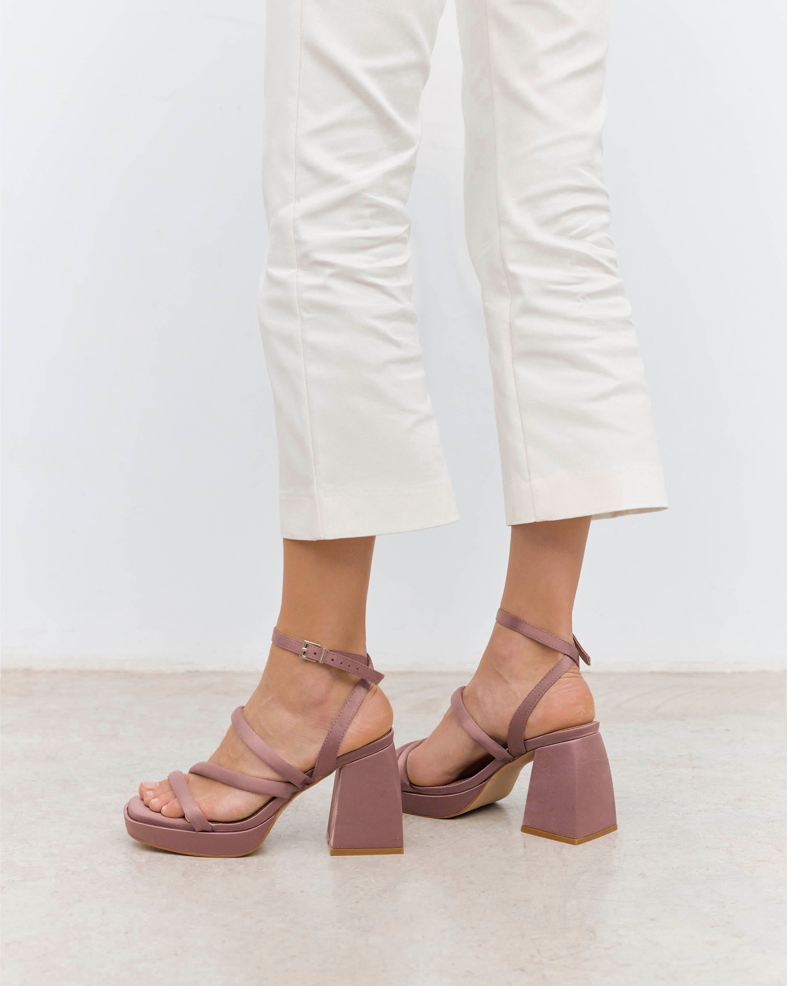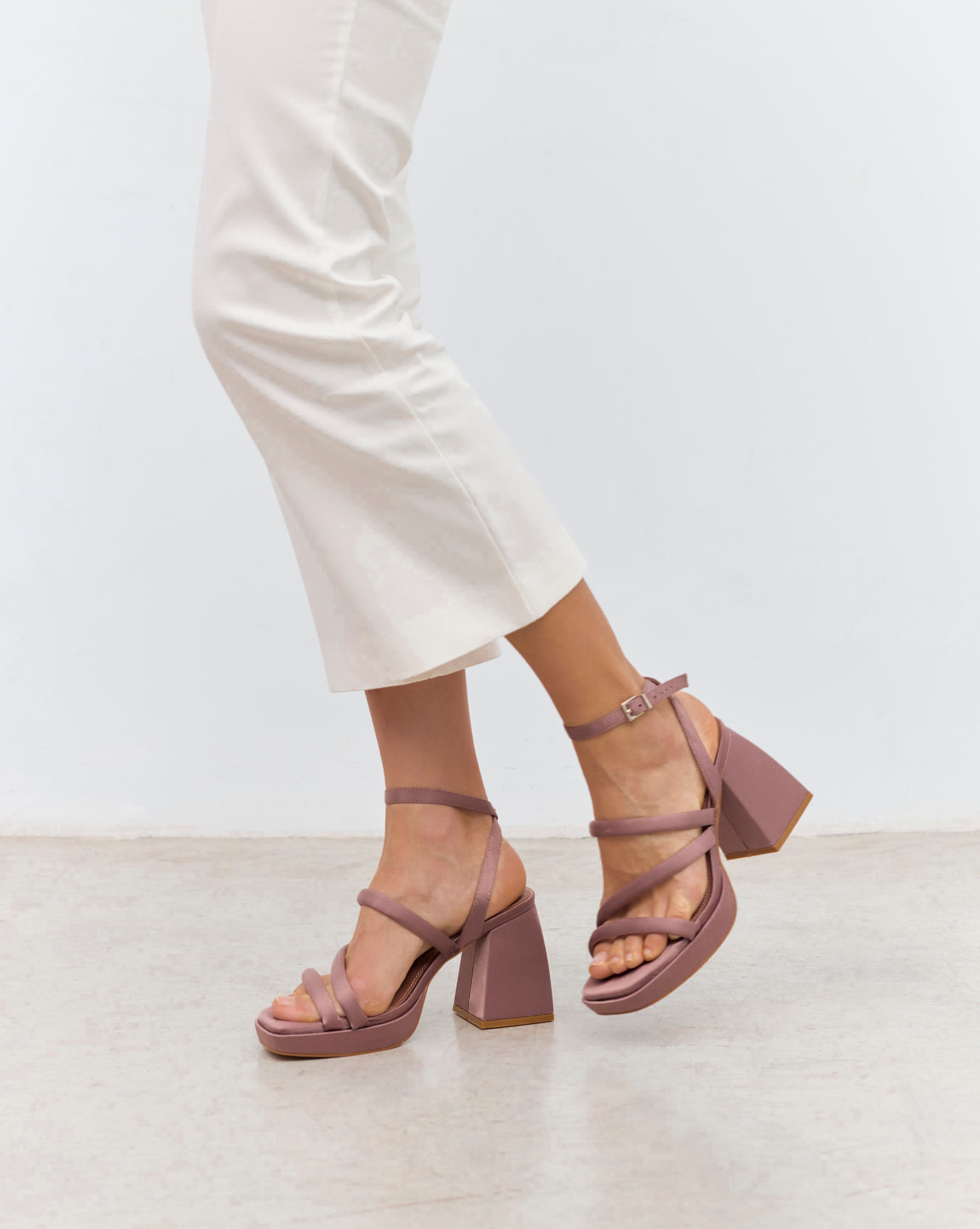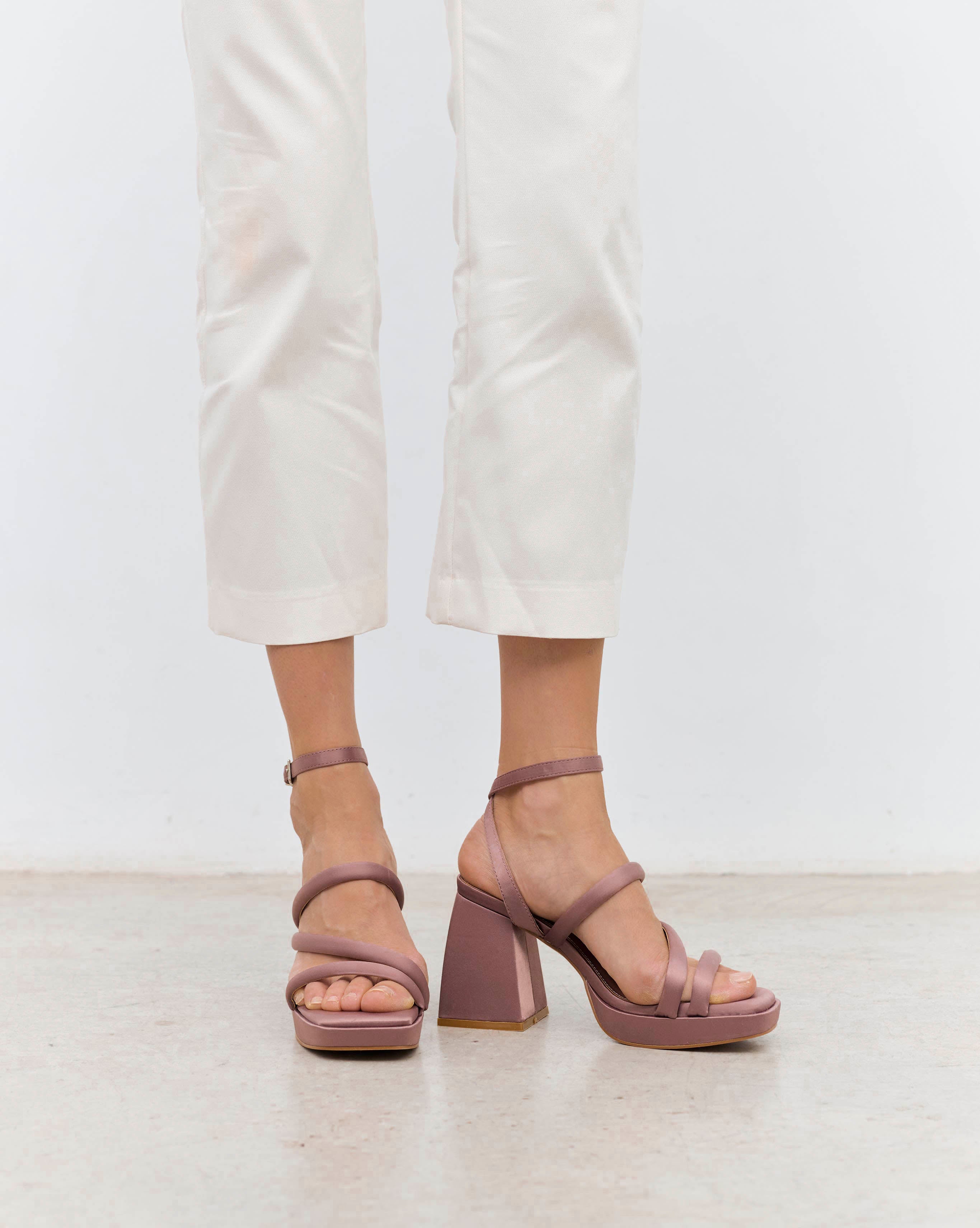 Sandalia de tacón en satín color malva. Parte delantera abierta con varias tiras tubulares. Tacón cuadrado. Cierre de pulsera al tobillo con hebilla metálica.