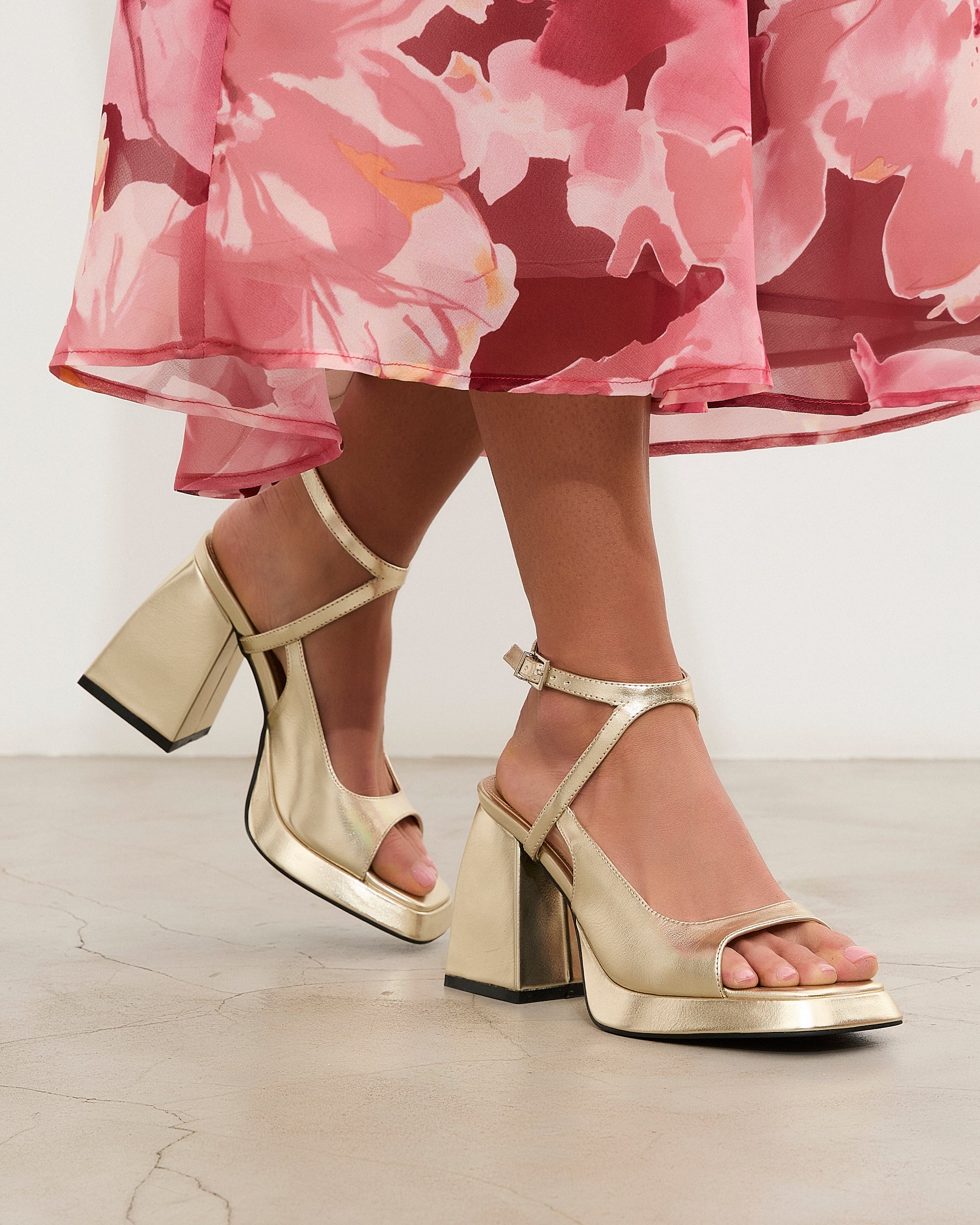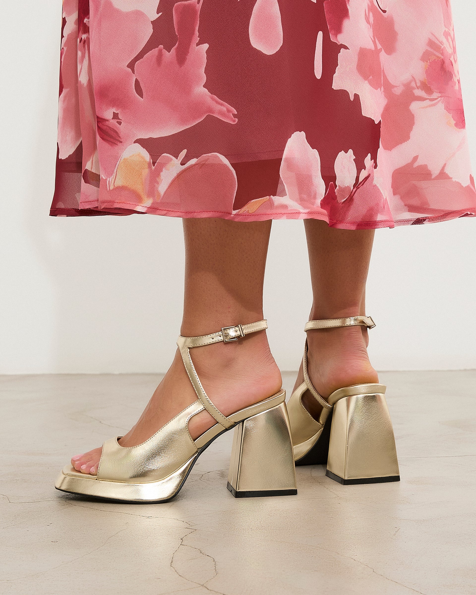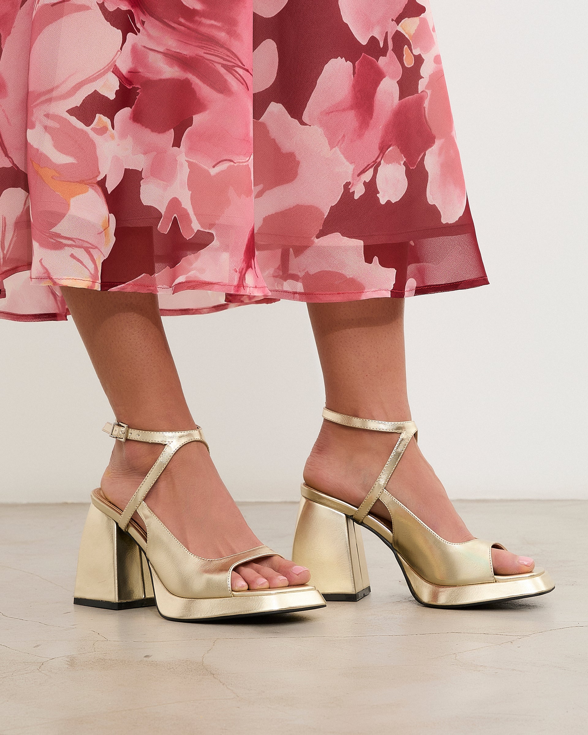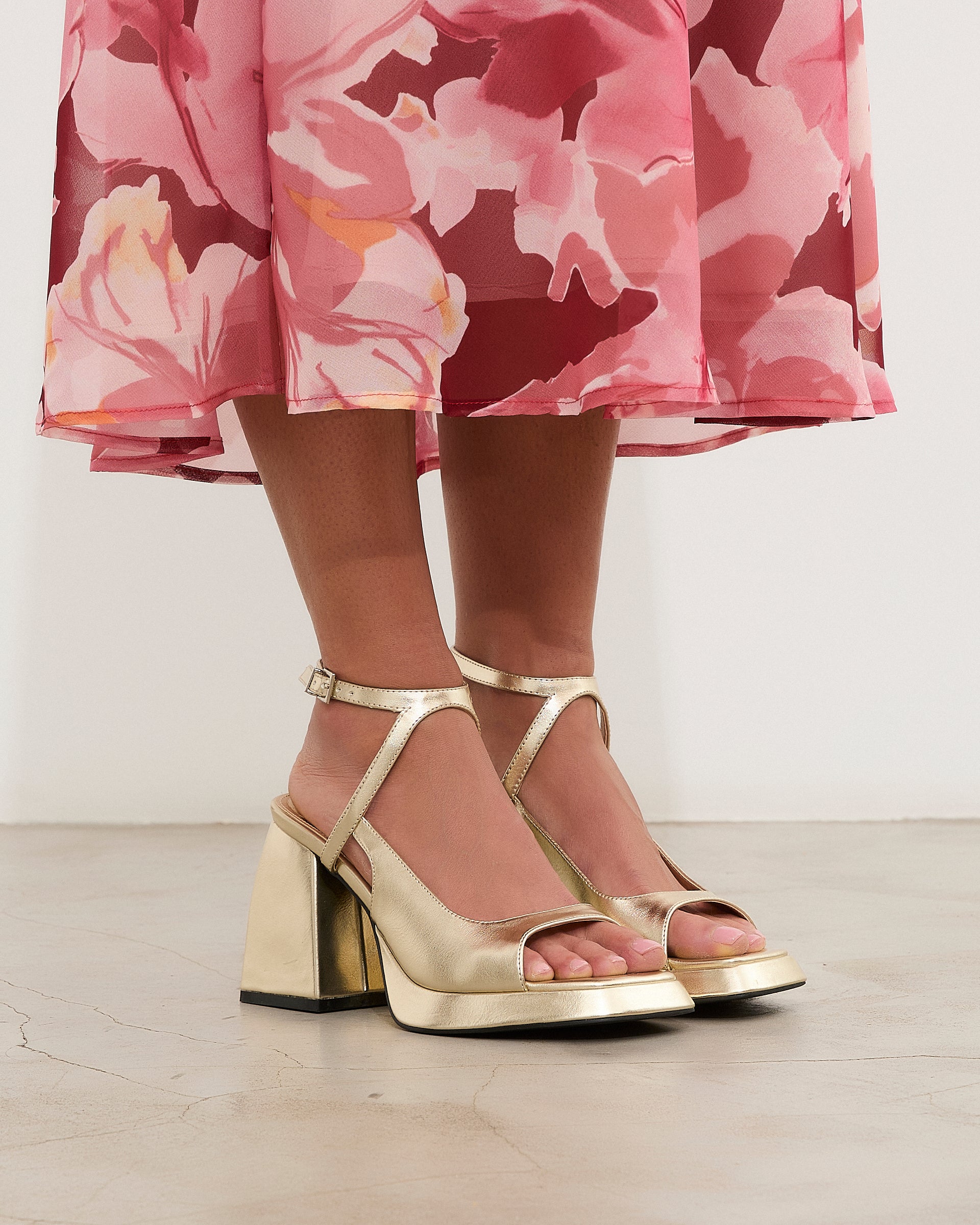 Sandalia de tacón con plataforma de puntera geometrica en color dorado.Tira delantera envolvente en laterales, unida a tira trasera con sujección de pulsera con hebilla en tobillo. Tacón alto ancho.