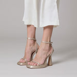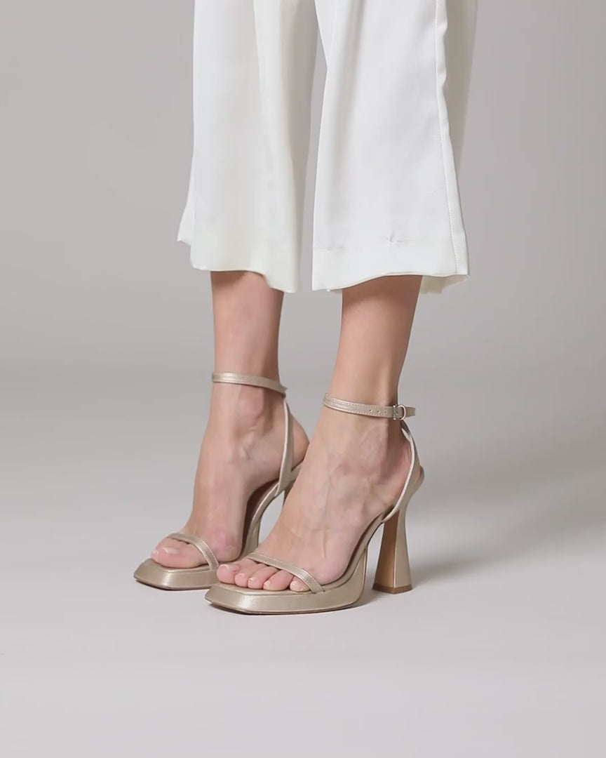 Sandalia de tacón en piel vegana color dorado y plataforma. Parte delantera abierta con una tira y tacón fino con plataforma cuadrada. Cierre de pulsera al tobillo con hebilla.