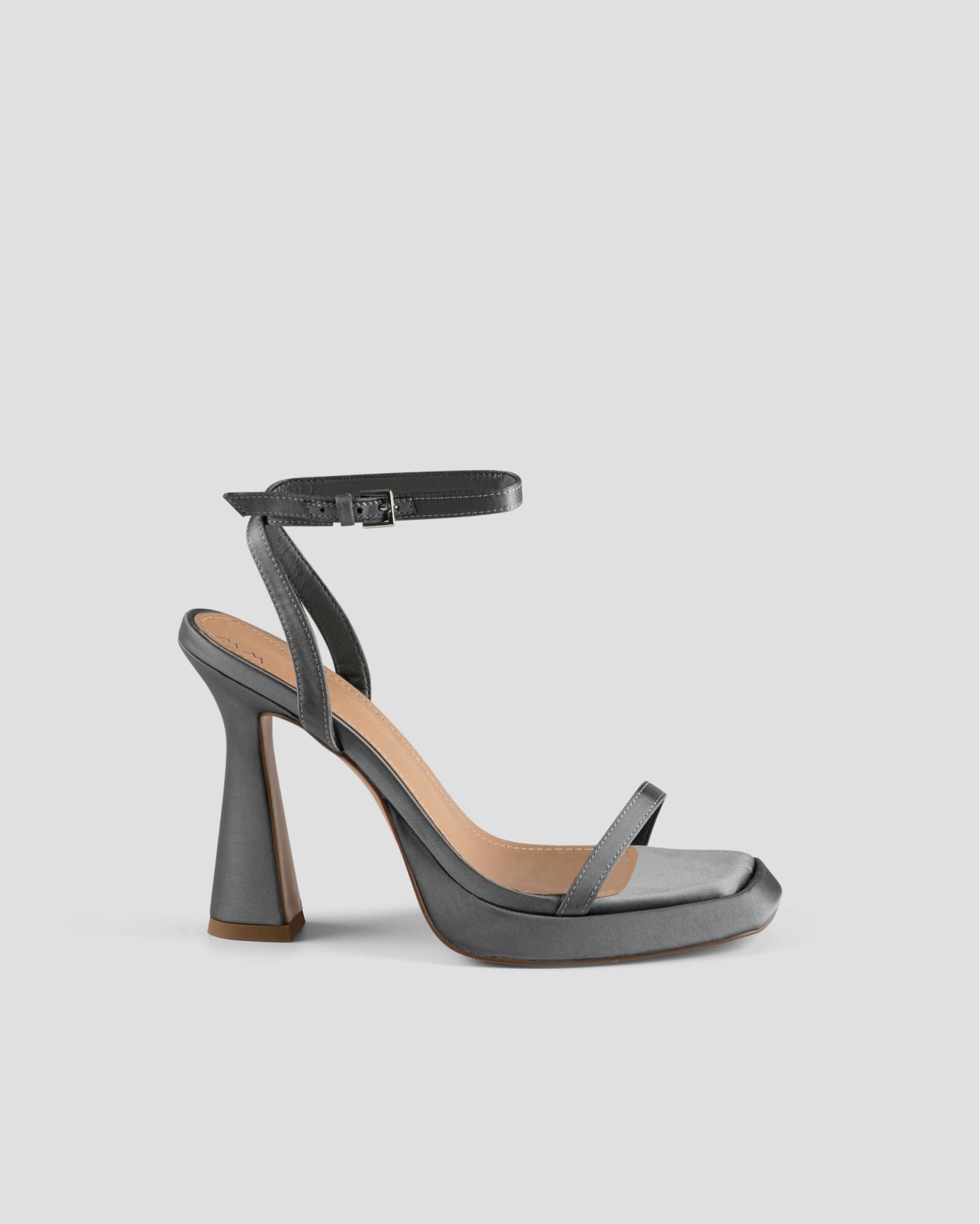 Sandalia de tacón en satén color gris y plataforma. Parte delantera abierta con una tira y tacón fino con plataforma cuadrada. Cierre de pulsera al tobillo con hebilla.