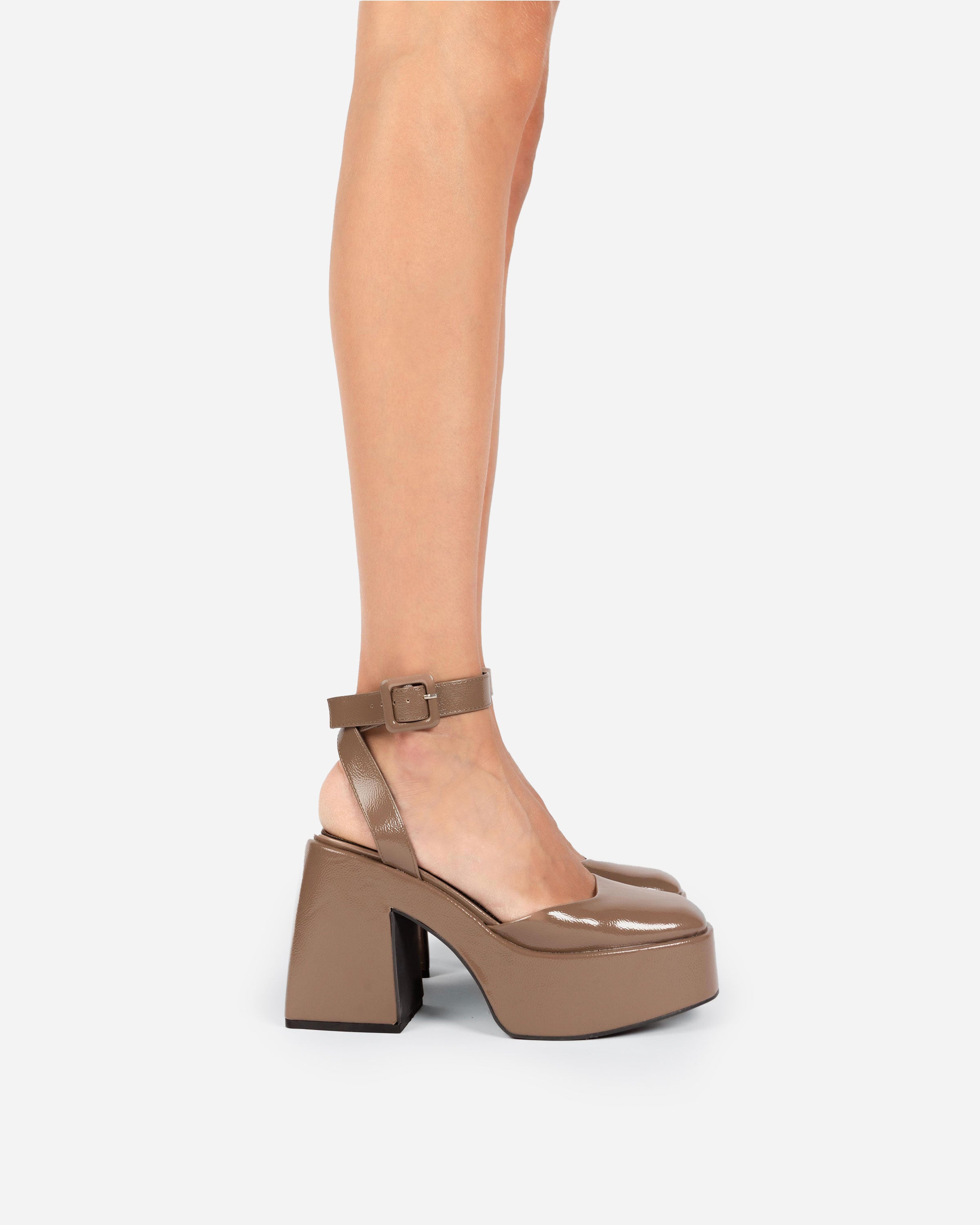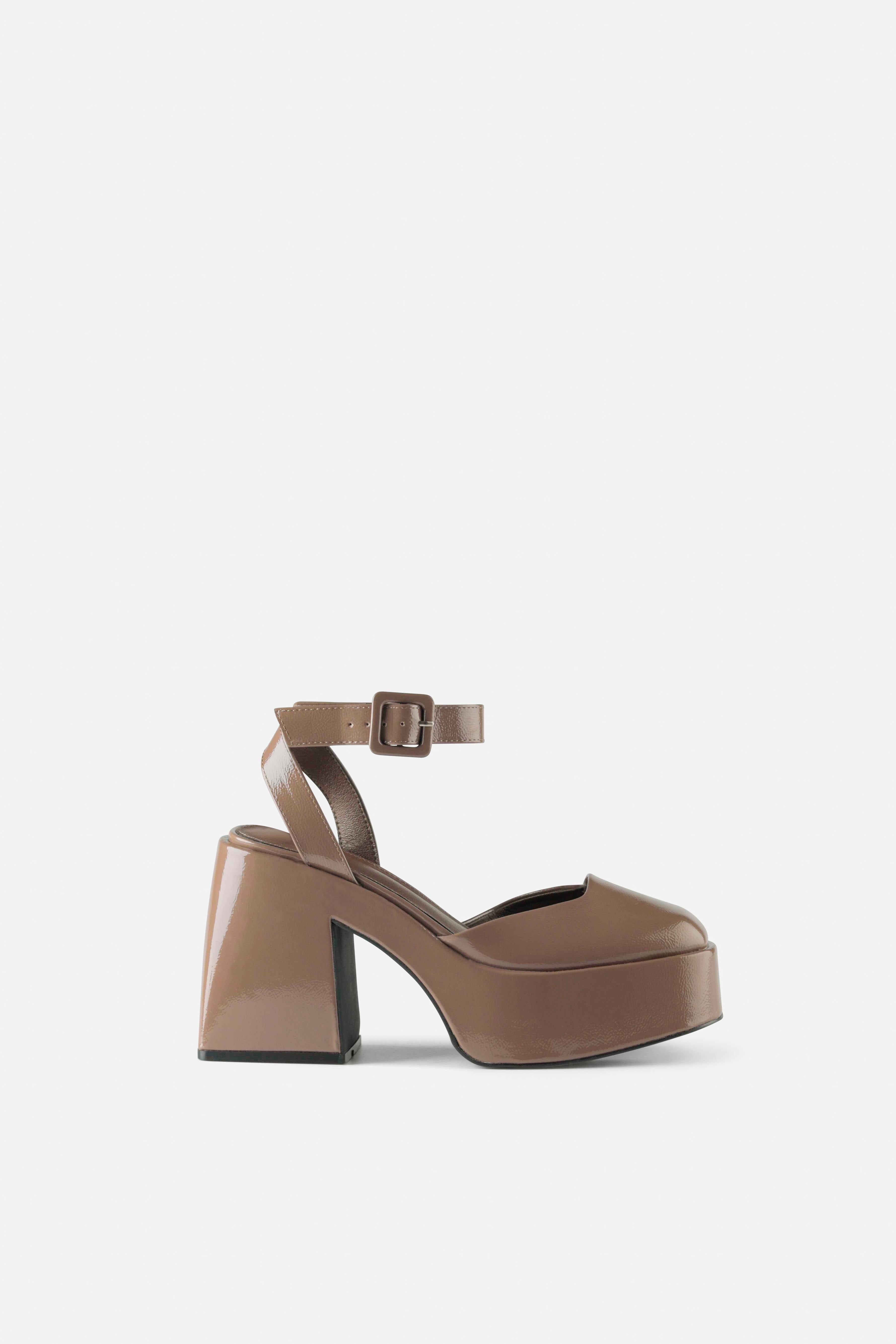 Sandalia de tacón con plataforma en color topo. Parte delantera cerrada, y pulsera en el tobillo con hebilla plateada para el cierre.