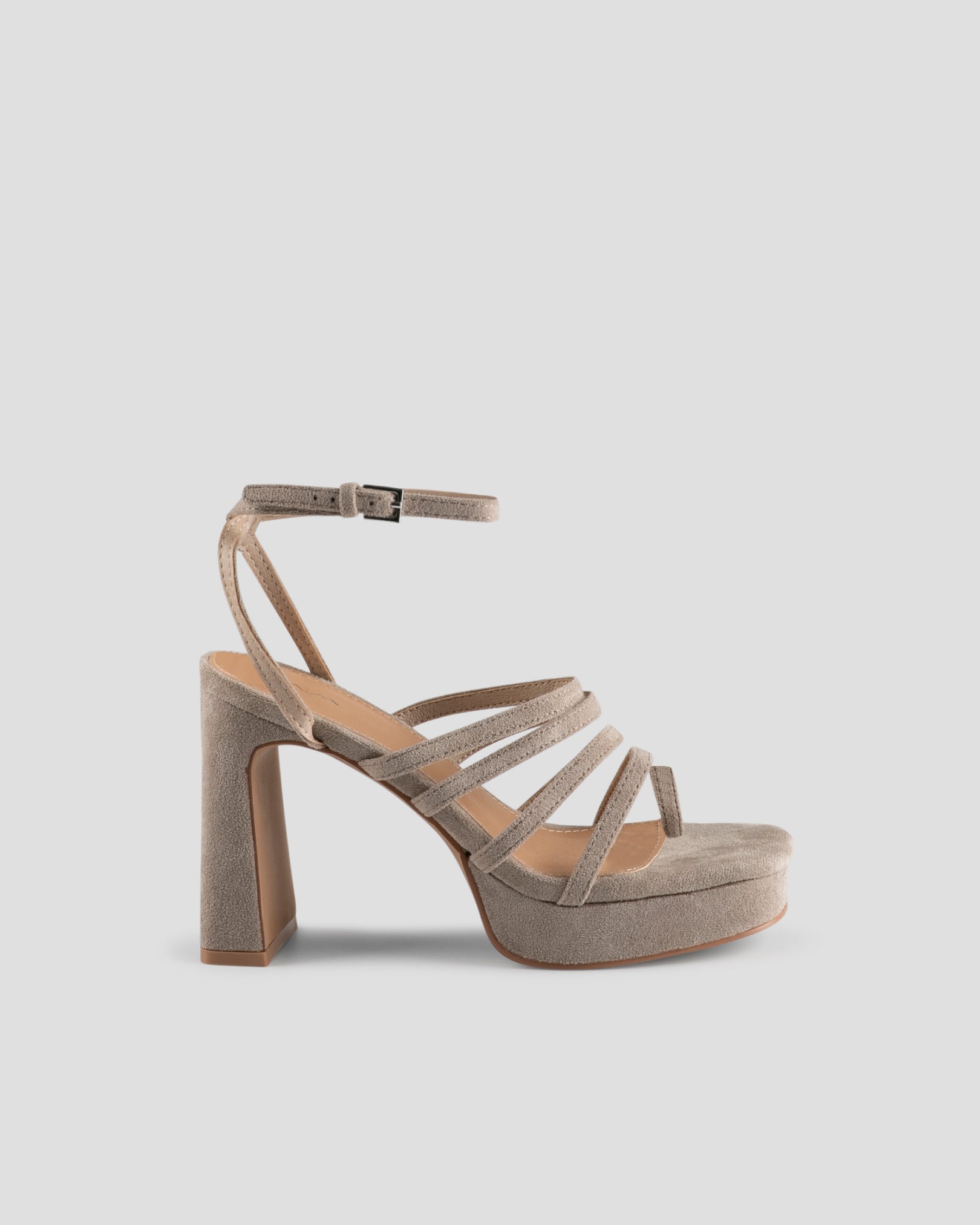 Sandalia de tacón en ante vegano color topo. Parte delantera abierta con varias tiras, plataforma con tira en el dedo y tacón rectangular. Cierre de pulsera al tobillo con hebilla metálica.