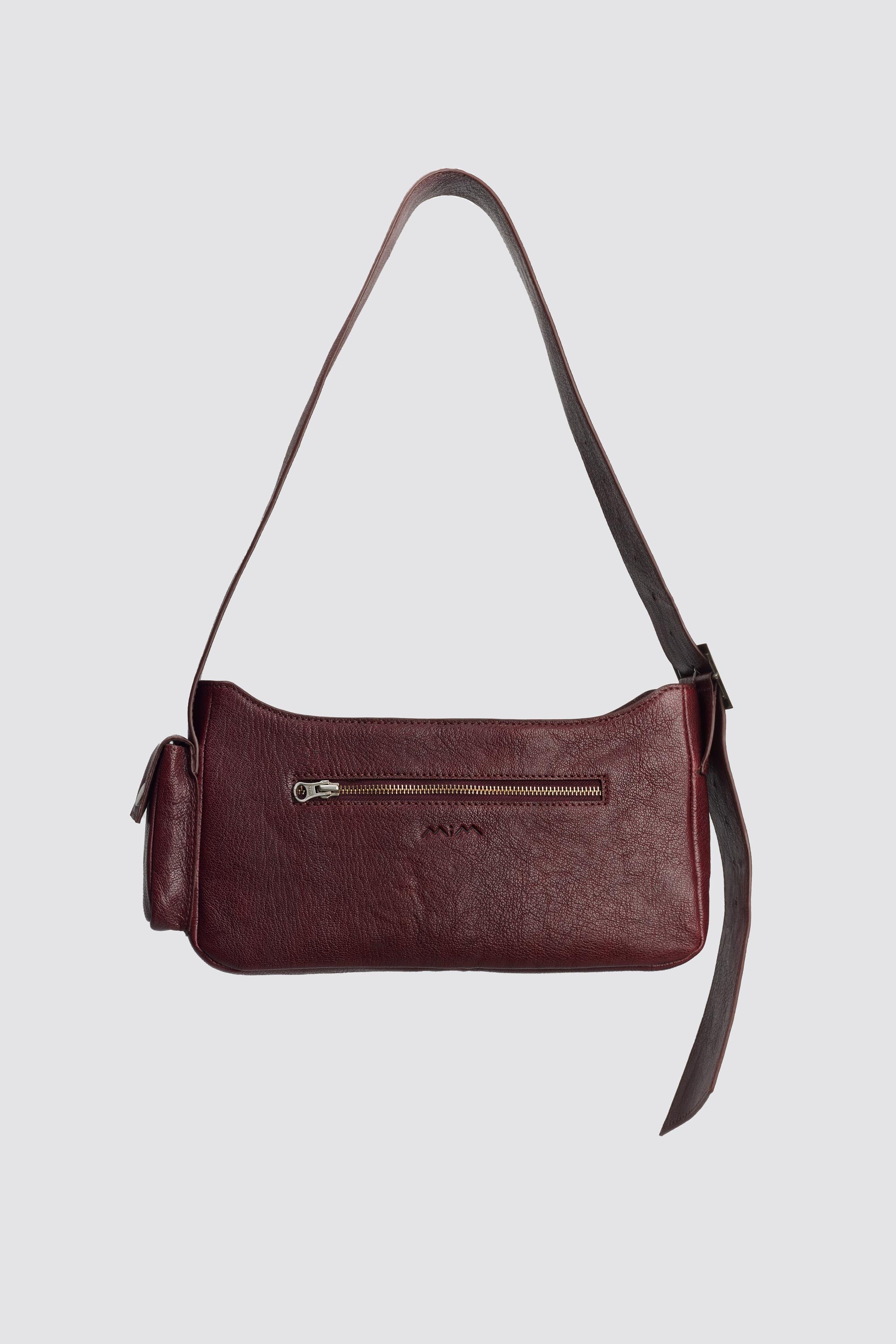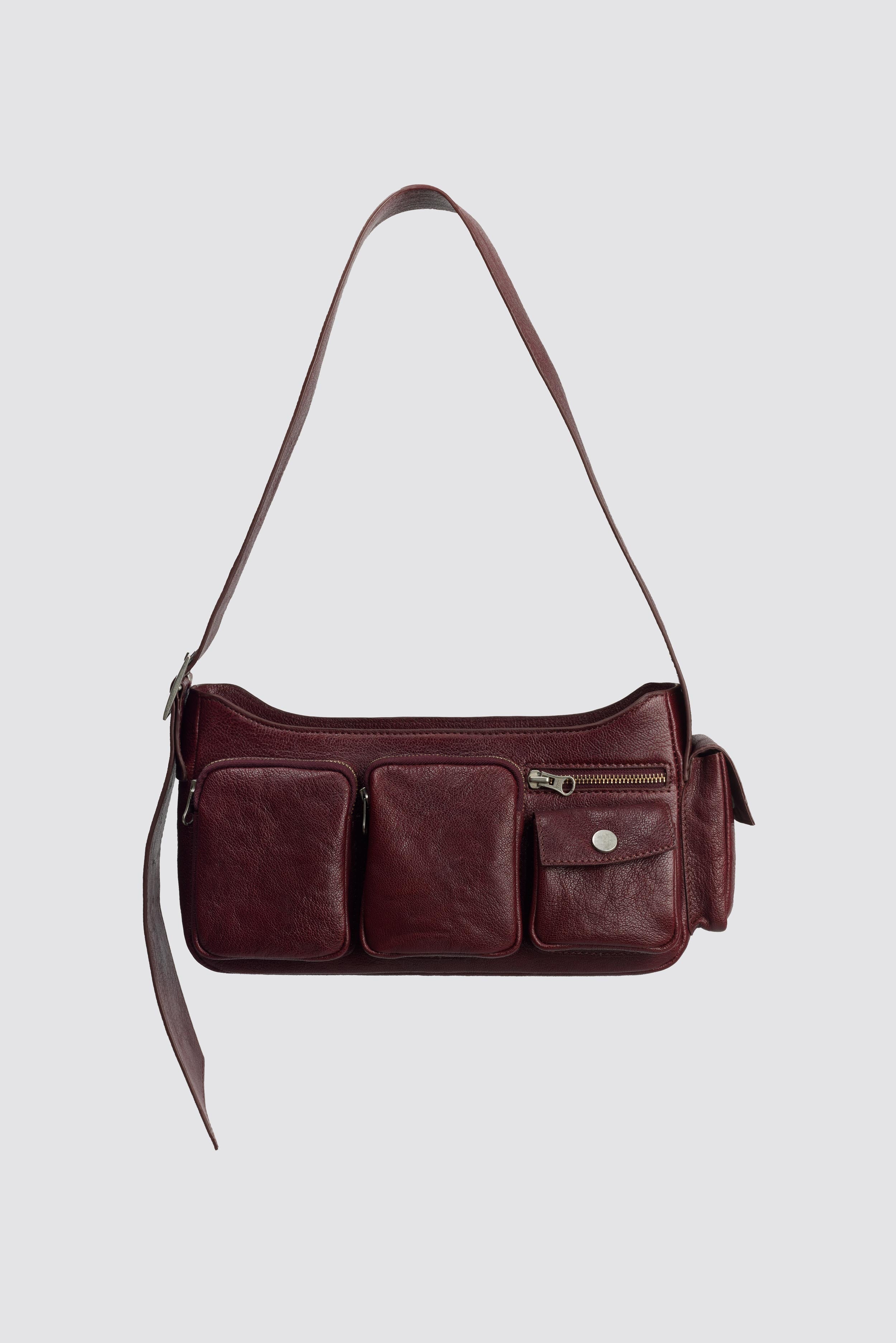 Bolso de hombro bandolera de piel en color burdeos. Compuesto por numerosos bolsillos,asa ancha y hebilla metálica.