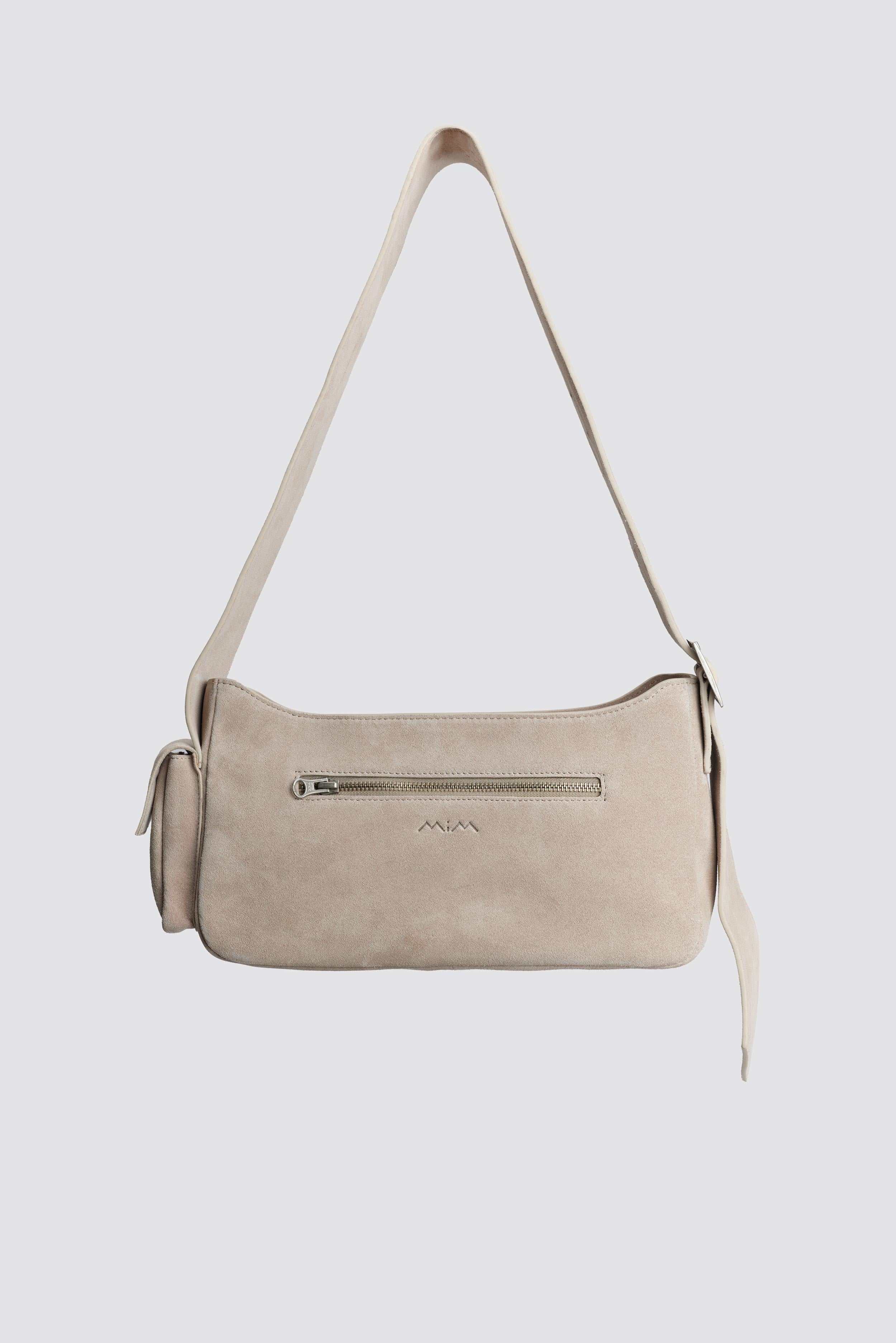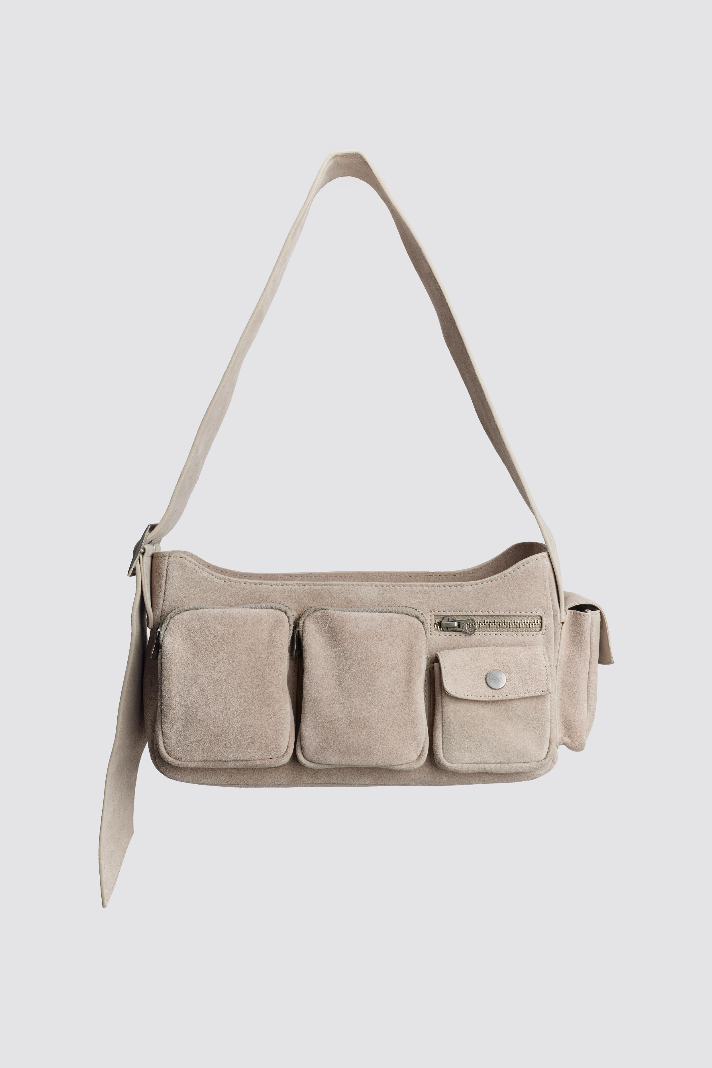 Bolso de hombro bandolera de piel en color topo. Compuesto por numerosos bolsillos, asa ancha y hebilla metálica.