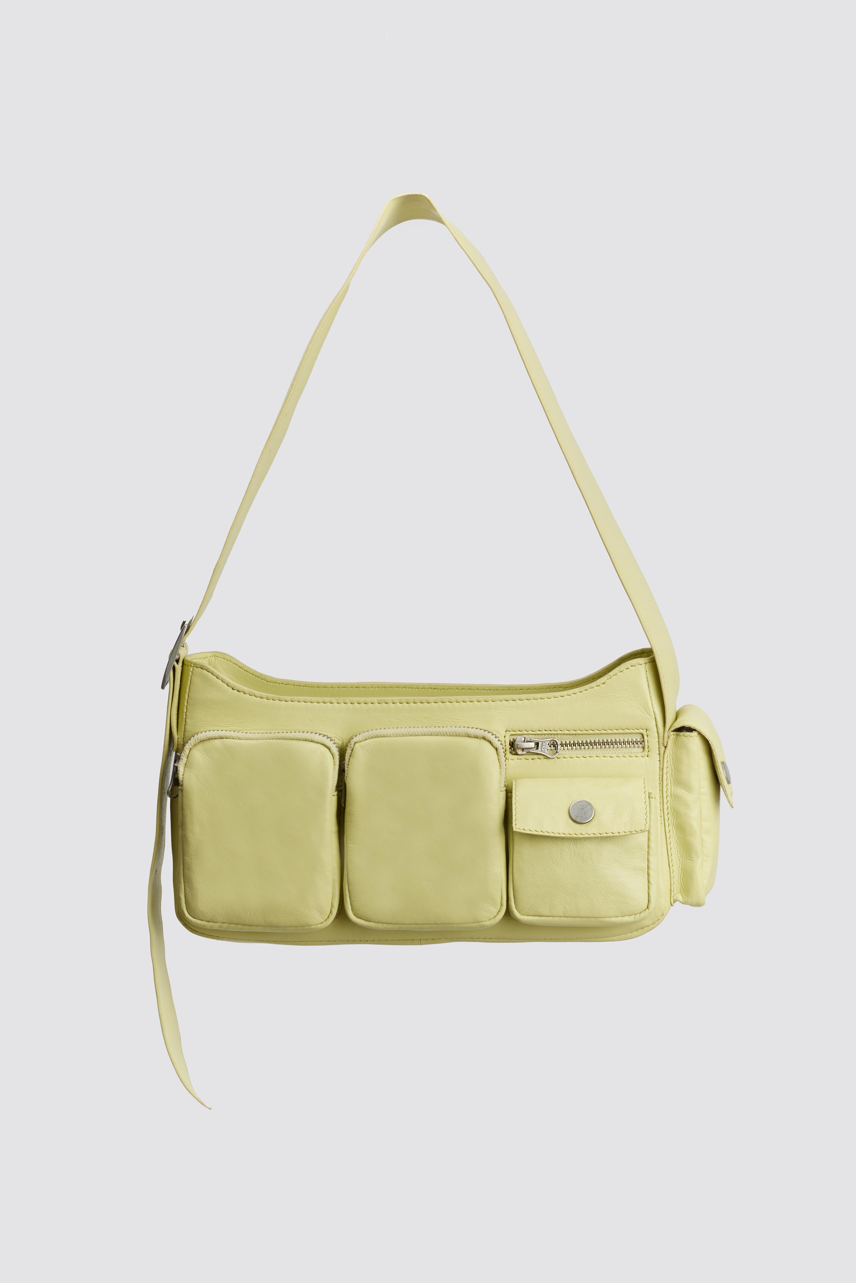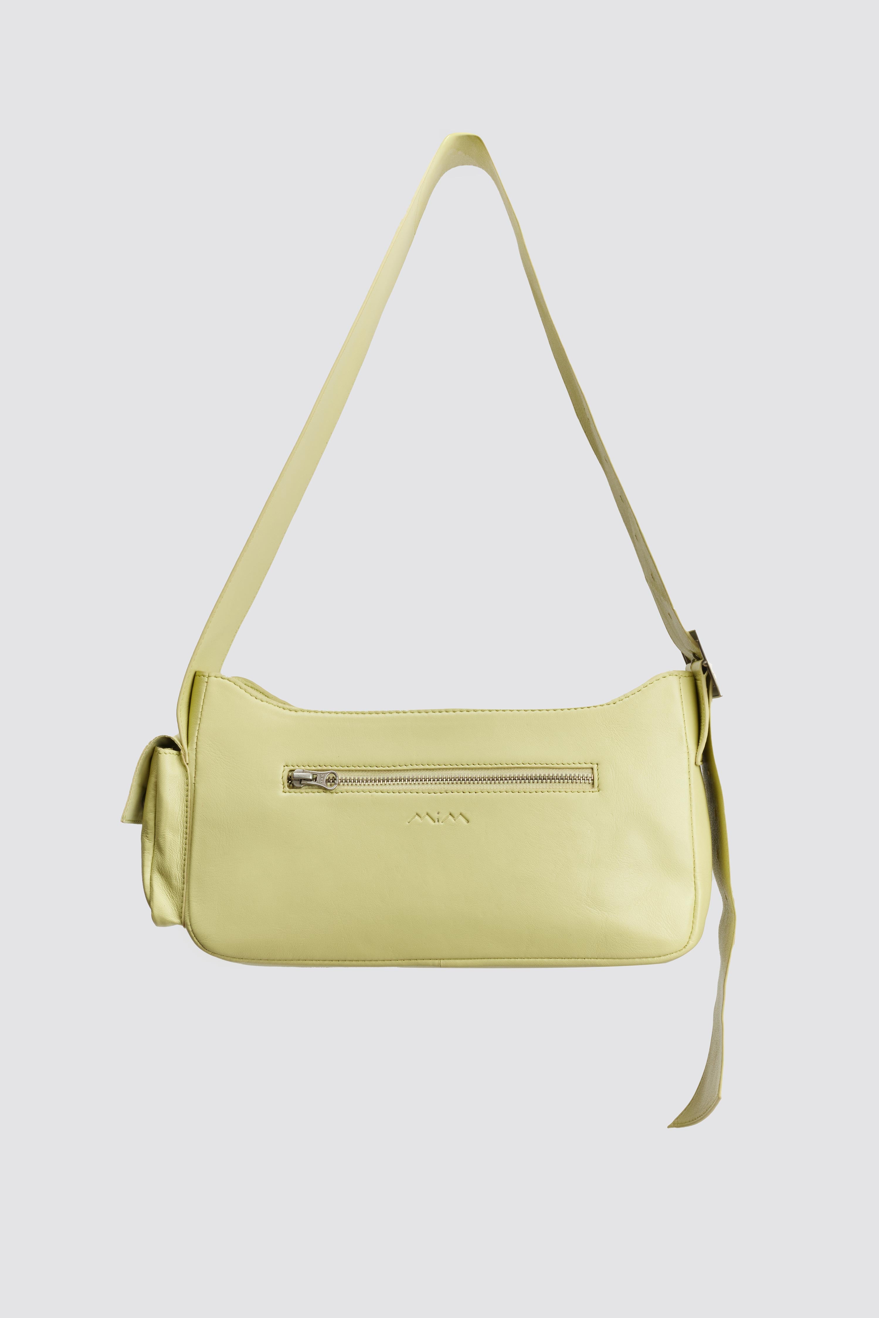 Bolso de hombro bandolera de piel en color lima. Compuesto por numerosos bolsillos,asa ancha y hebilla metálica.