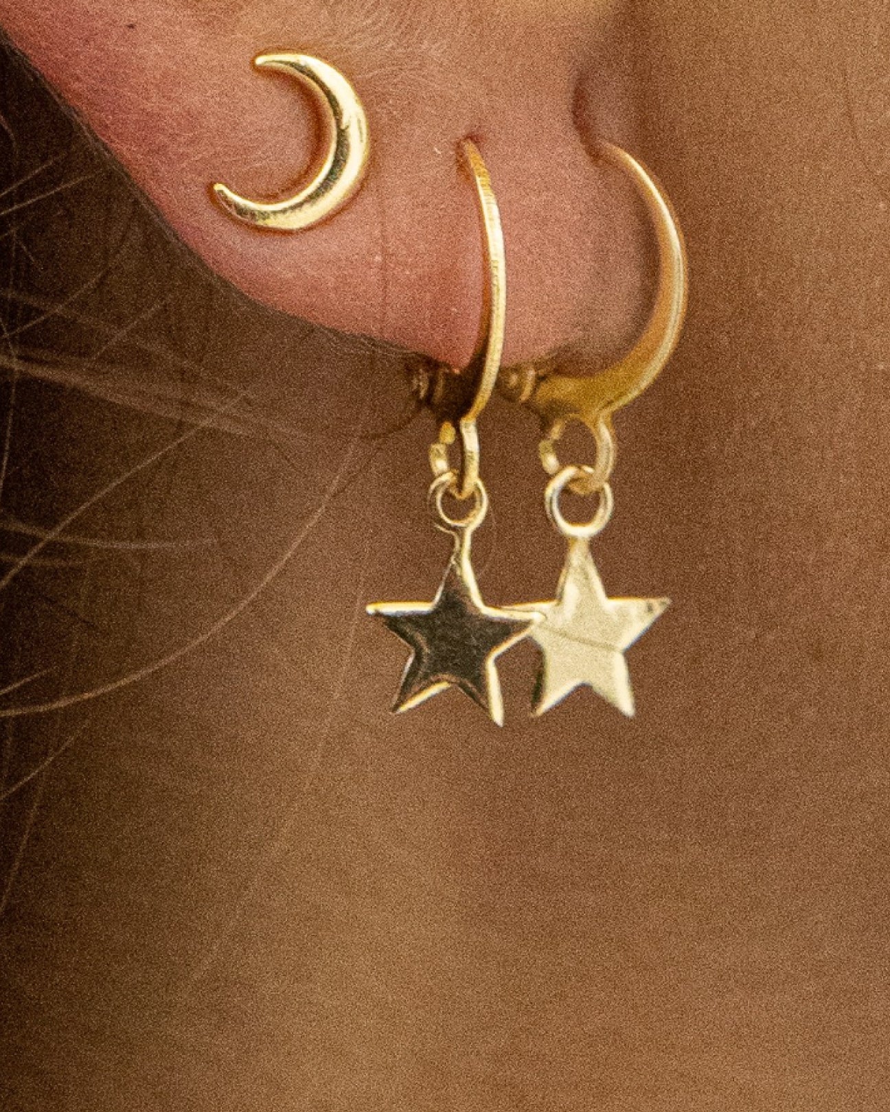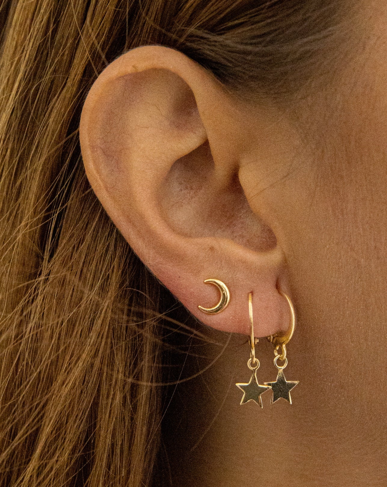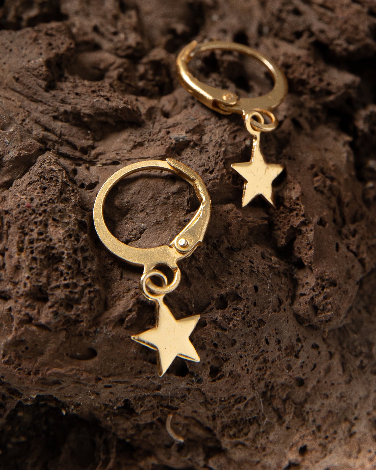- Aros dorados pequeños con una estrella colgante. Cierre fácil.