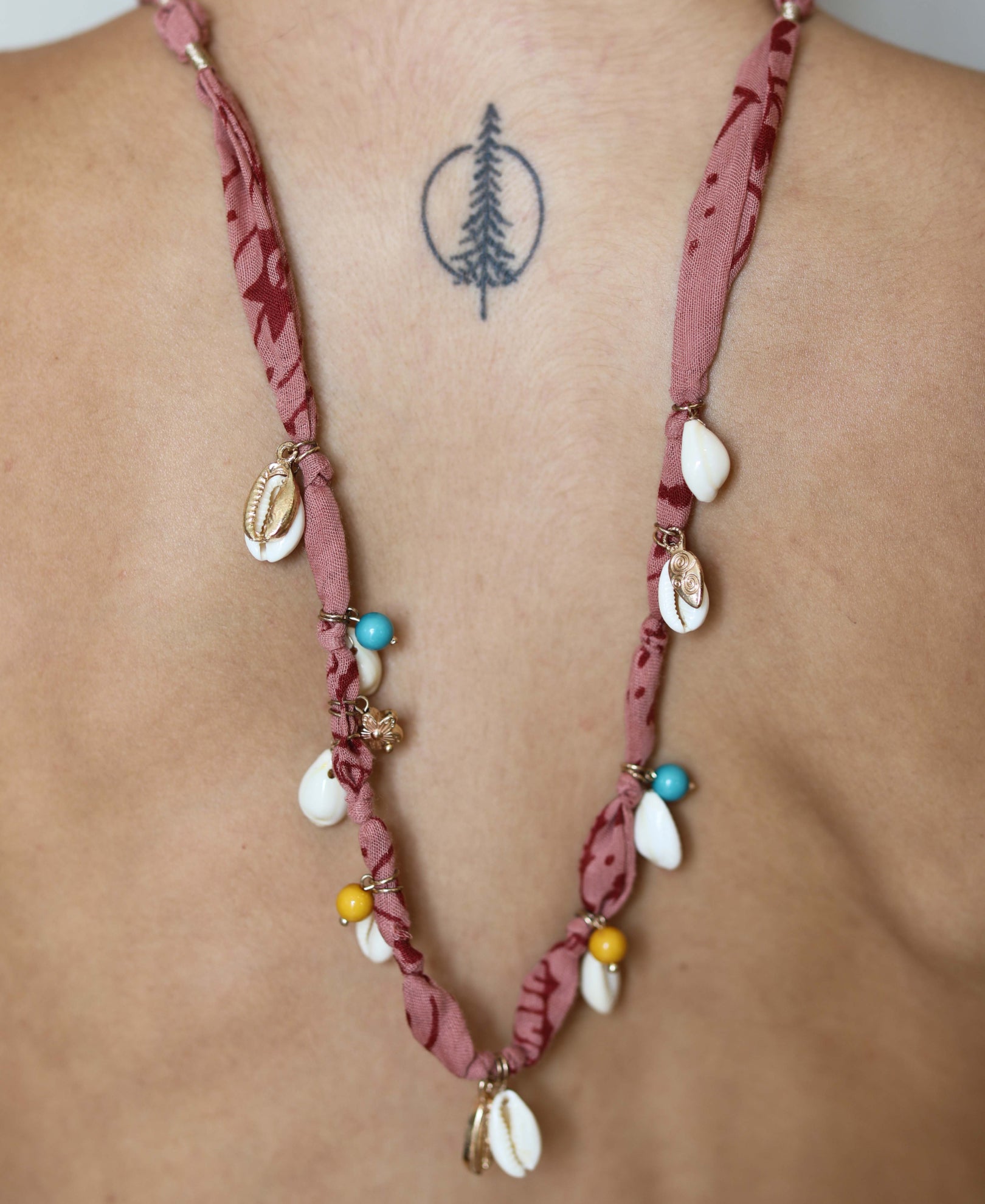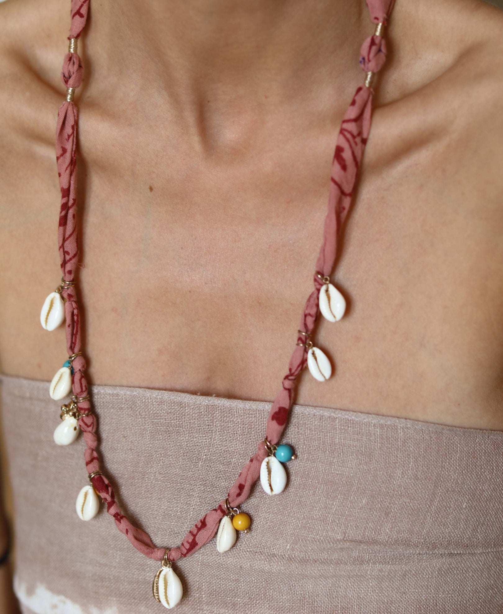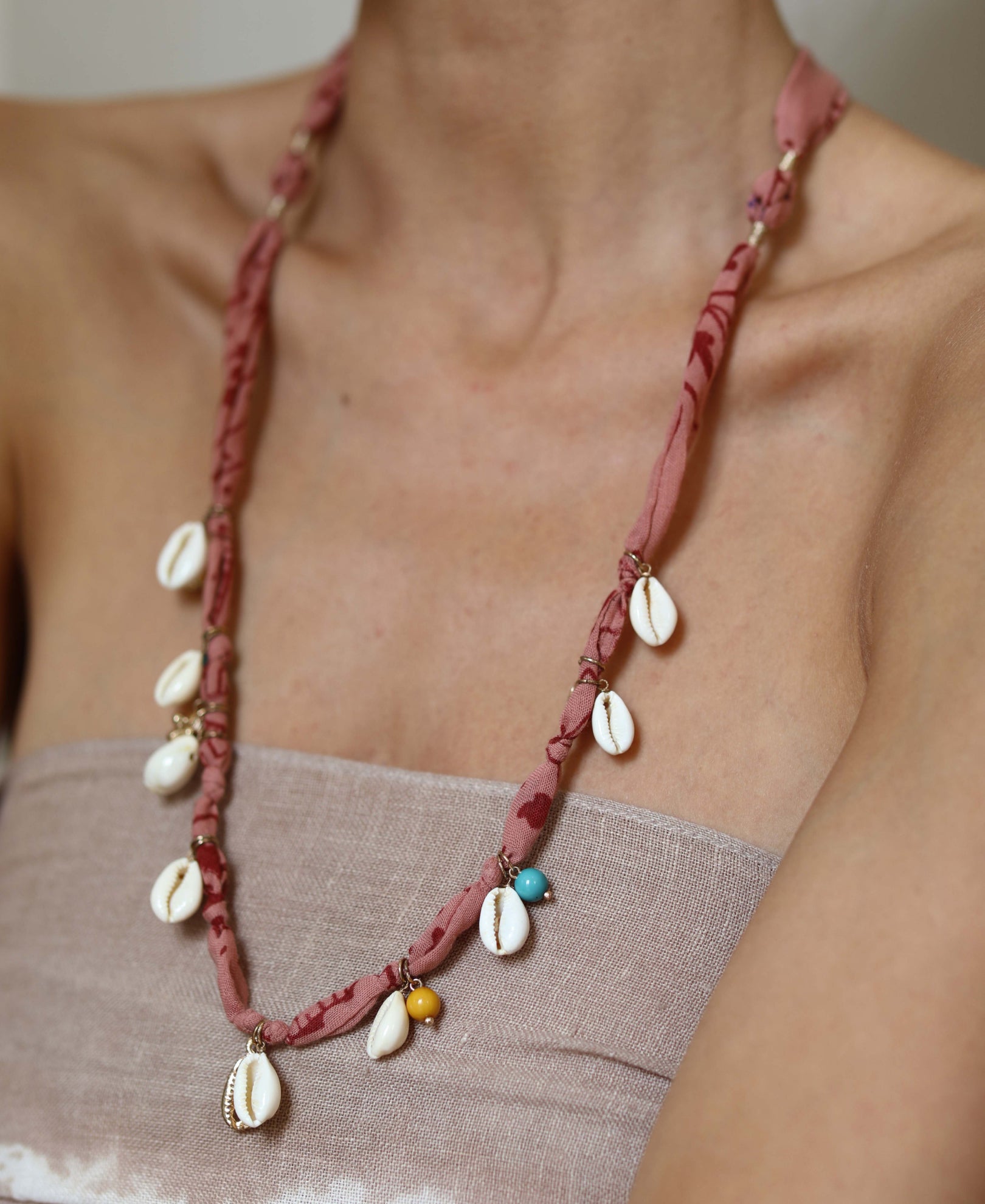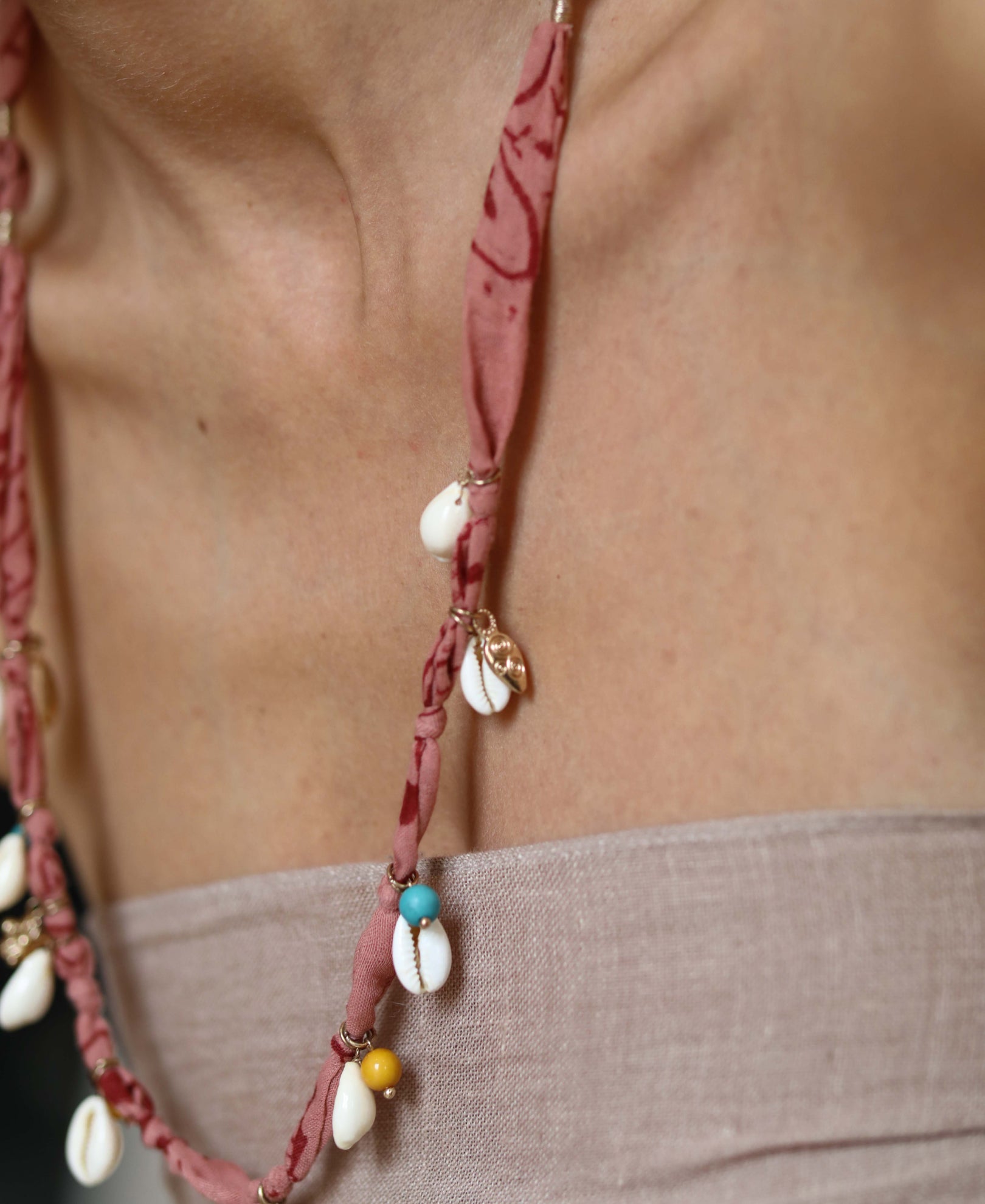 Collar de tela en color rosa claro, con conchas y abalorios diferentes entrelazados entre sí. Cierre ajustable