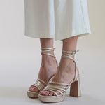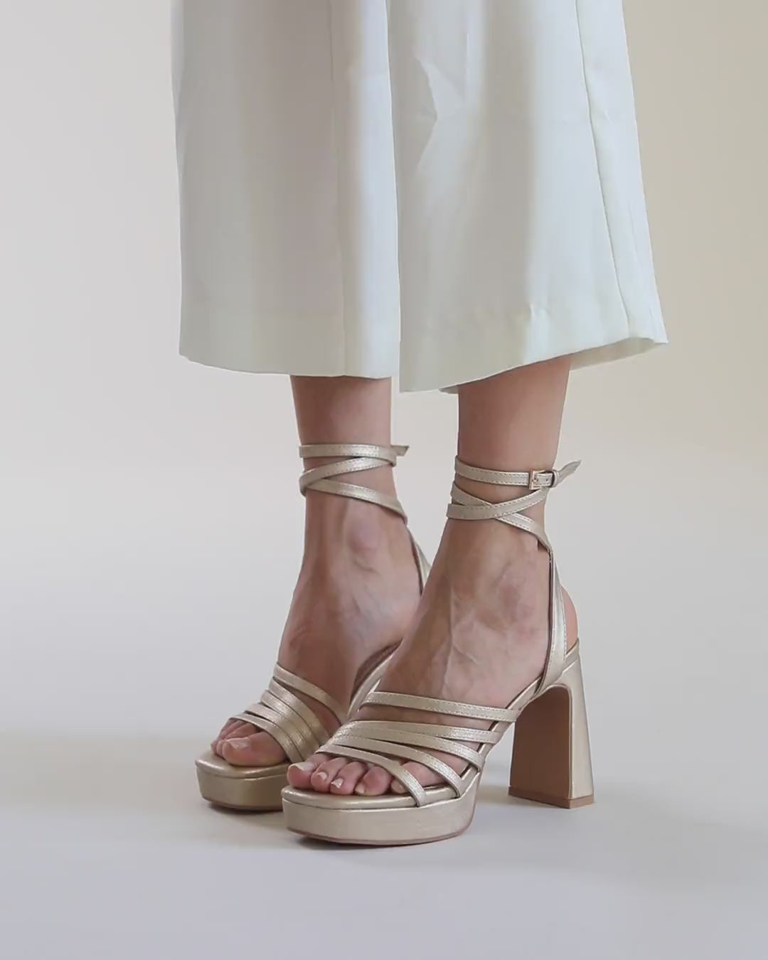 Sandalia de tacón en piel vegana color dorado. Parte delantera abierta con varias tiras y plataforma con tacón rectangular. Cierre de pulsera con varias tiras al tobillo con hebilla metálica.