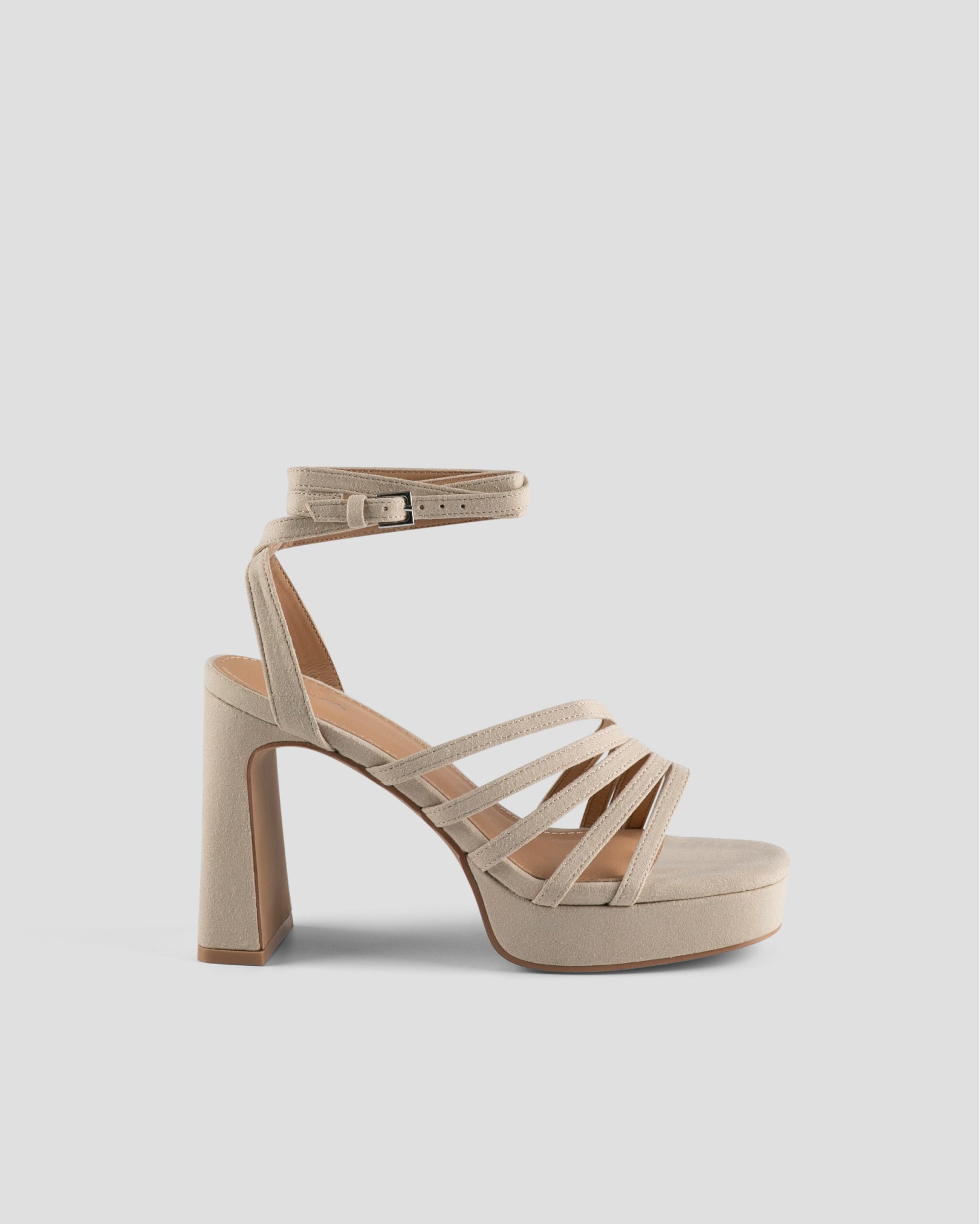 Sandalia de tacón en ante vegano color ecru. Parte delantera abierta con varias tiras y plataforma con tacón rectangular. Cierre de pulsera con varias tiras al tobillo con hebilla metálica.