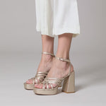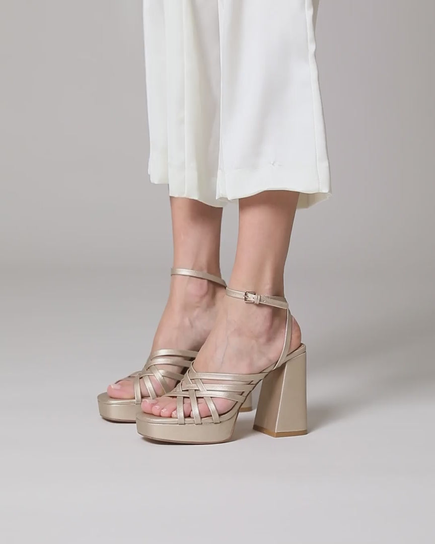 Sandalia de tacón en piel vegana color dorado. Parte delantera con tiras cruzadas y plataforma. Cierre de pulsera al tobillo con hebilla metálica.