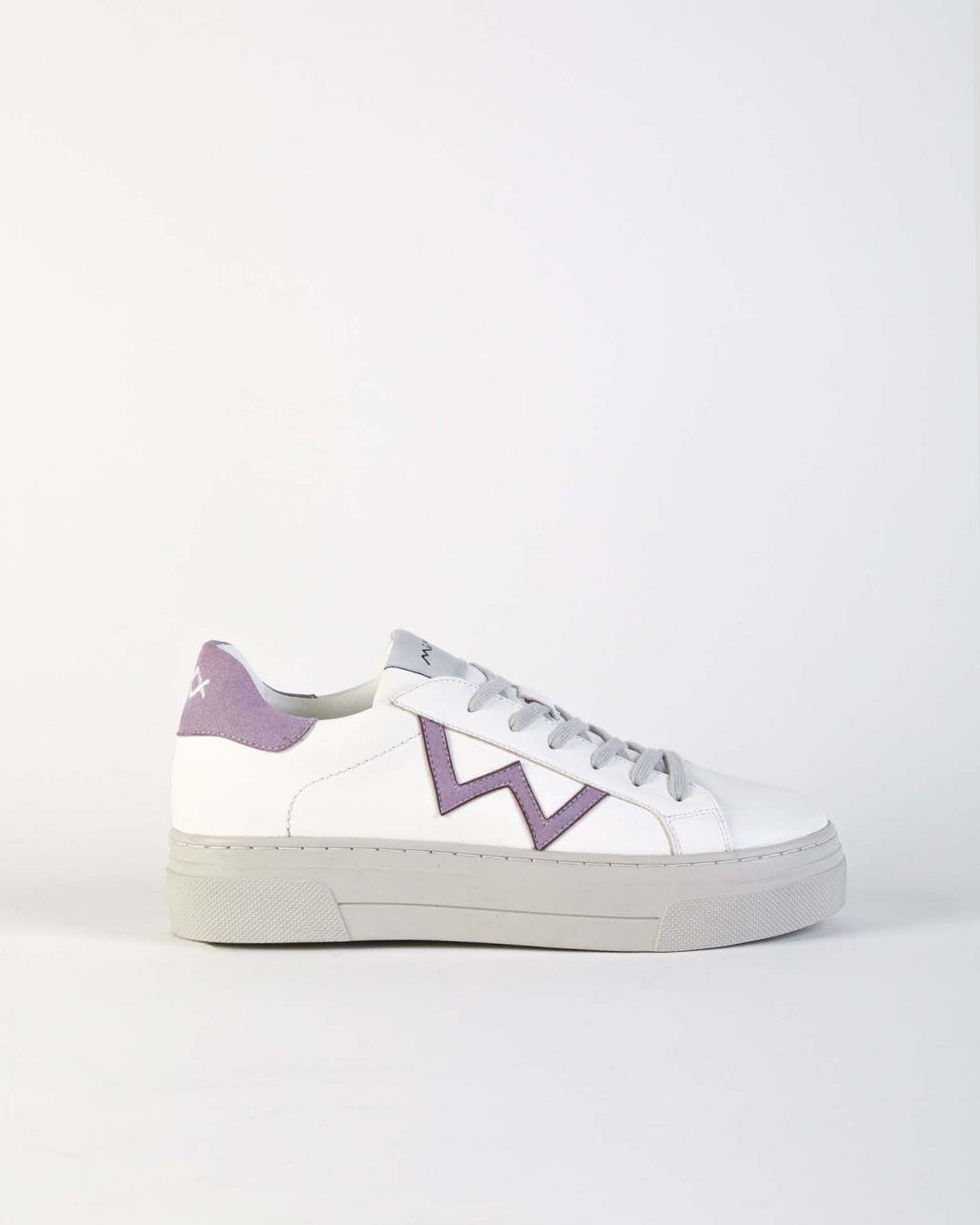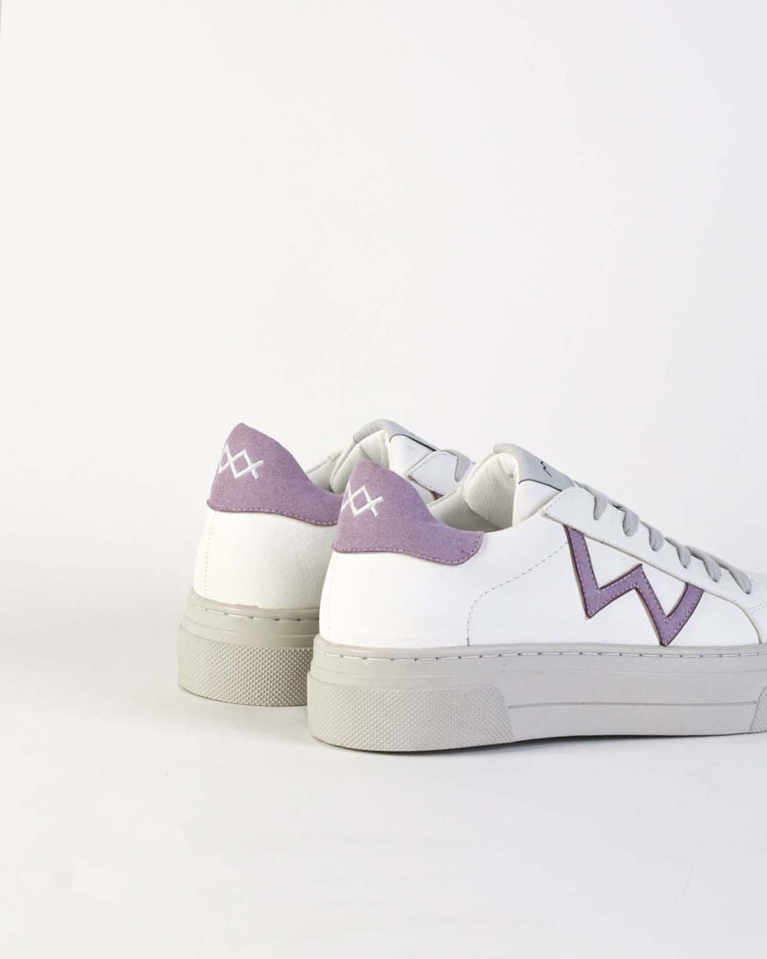 Zapatilla de cordones en cuero vegano color blanco. Suela y cordones en tonos grises. Detalles de logo y refuerzo trasero en ante vegano color malva.