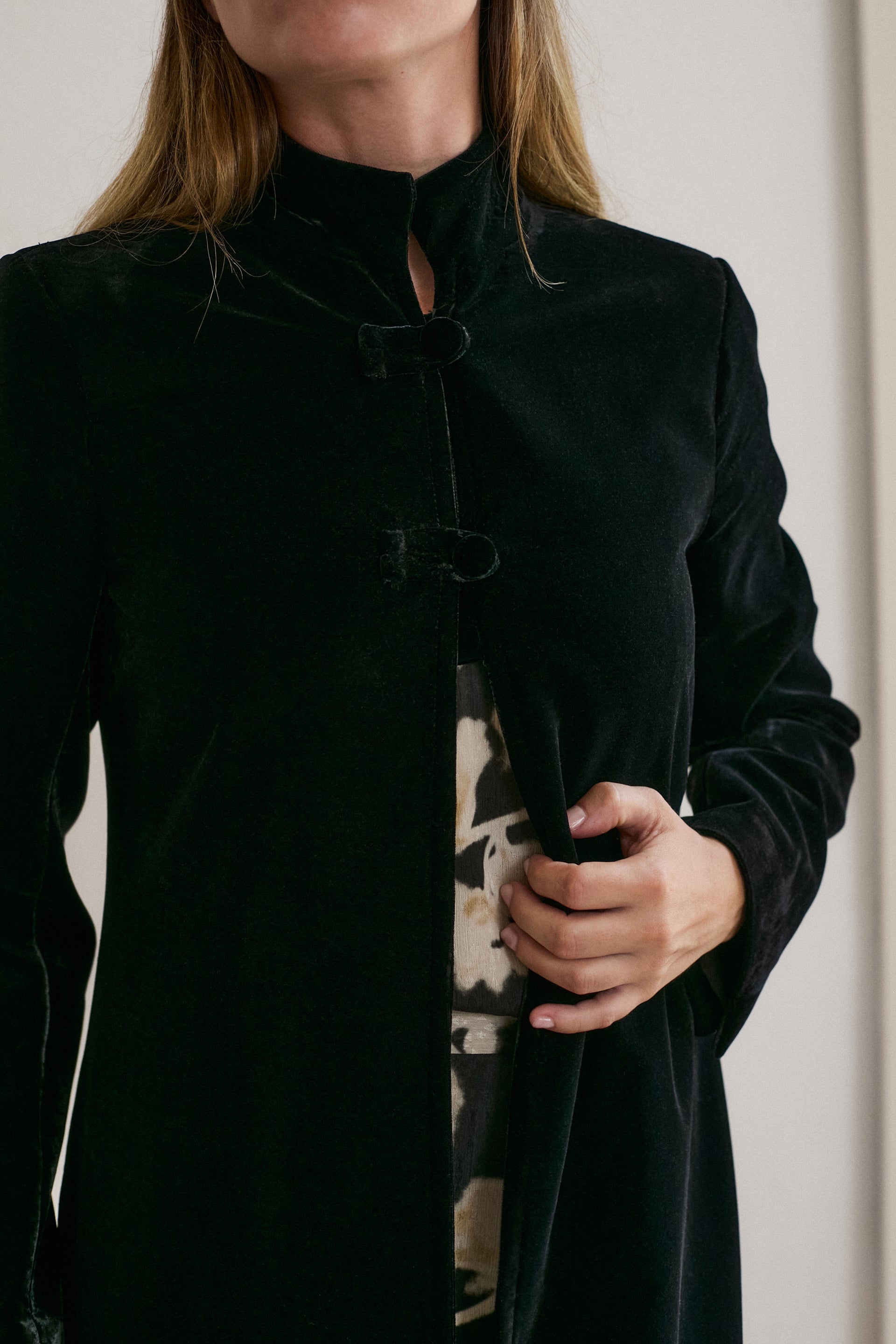 Three-quarter length coat with black velvet shoulder pads. Mao collar and covered buttons. Waist adjustment detail and rear vent.
