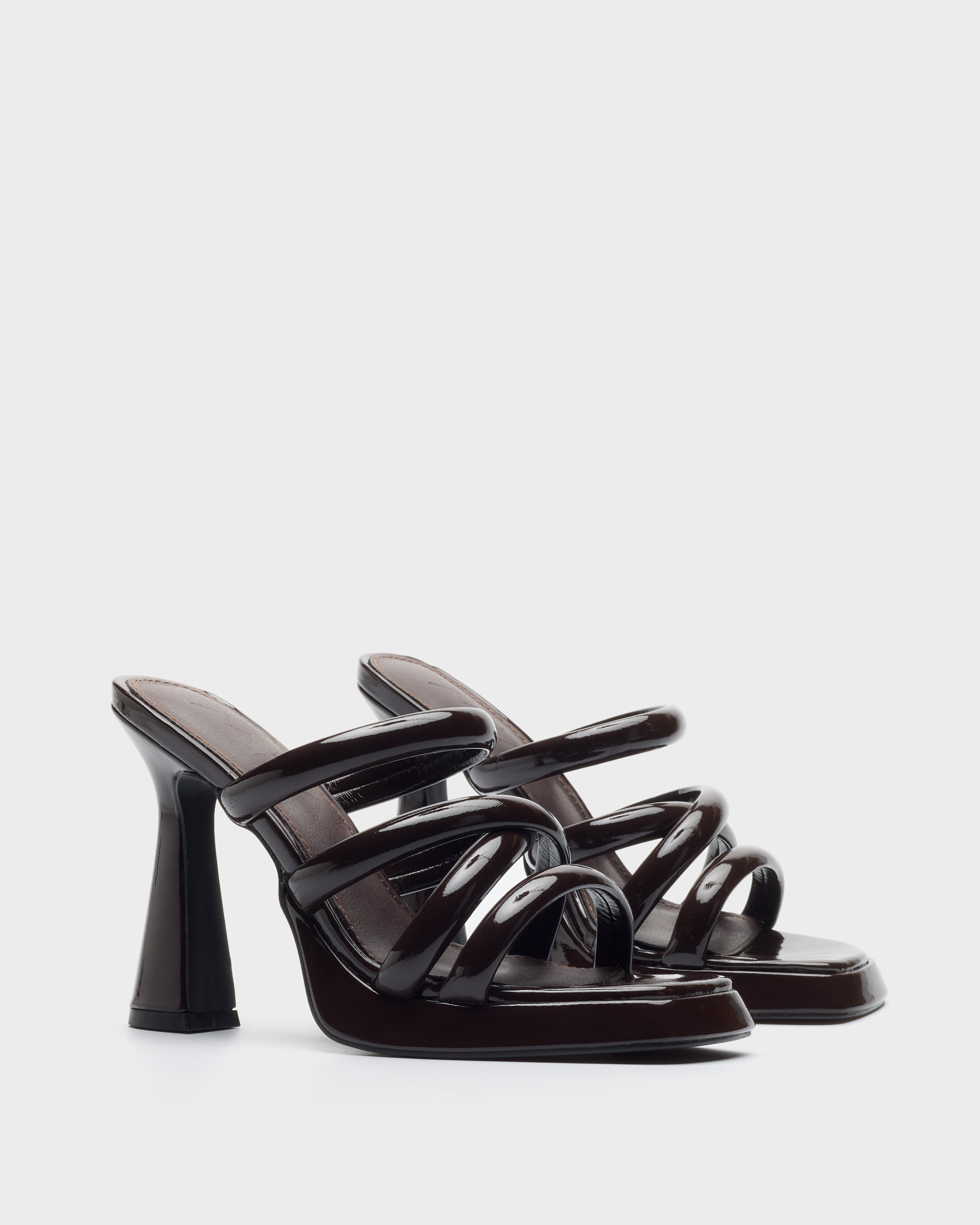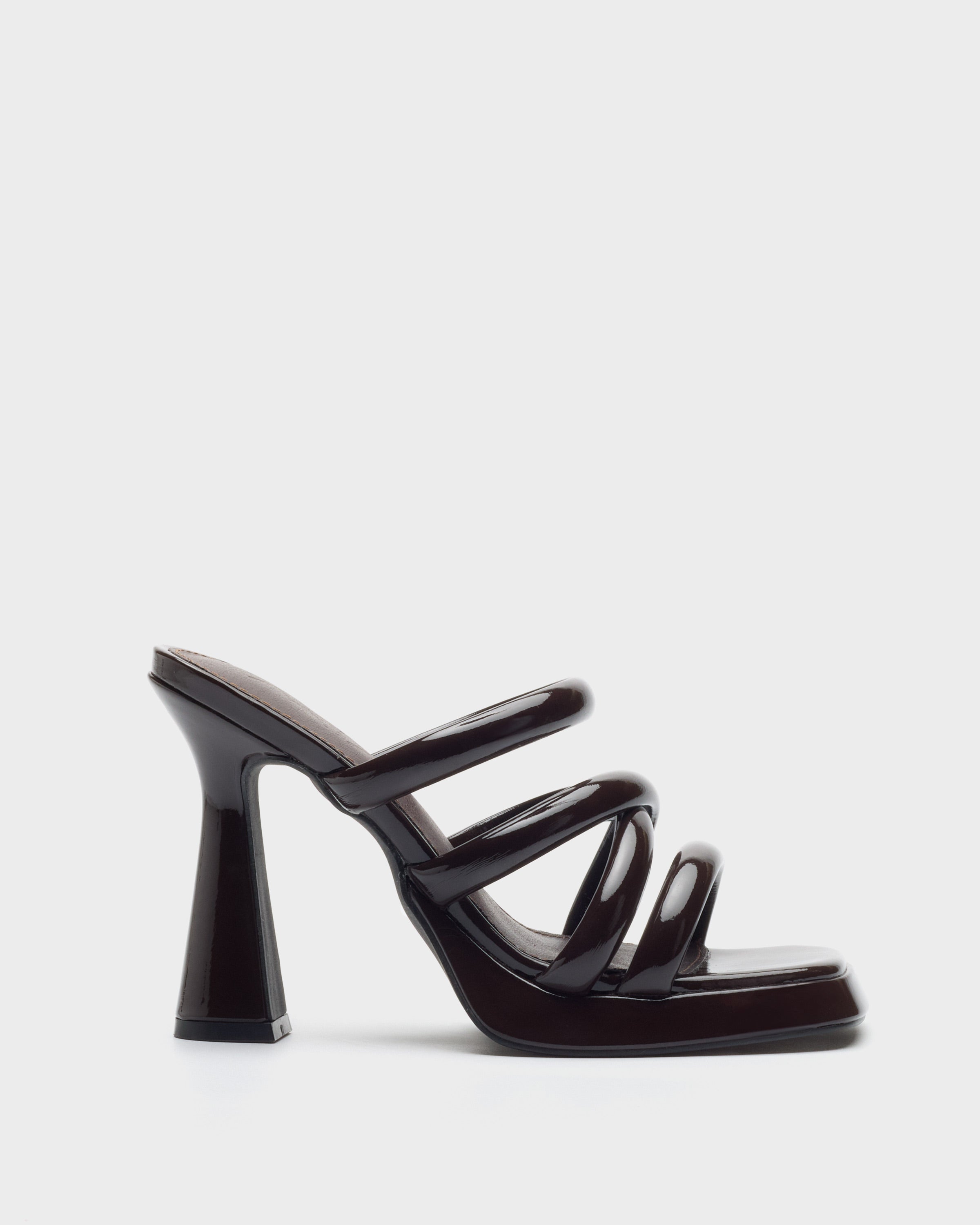 Sandalia de tacón con plataforma en PU color chocolate. Parte delantera abierta con tiras tubulares acolchadas y tacón fino con plataforma cuadrada.